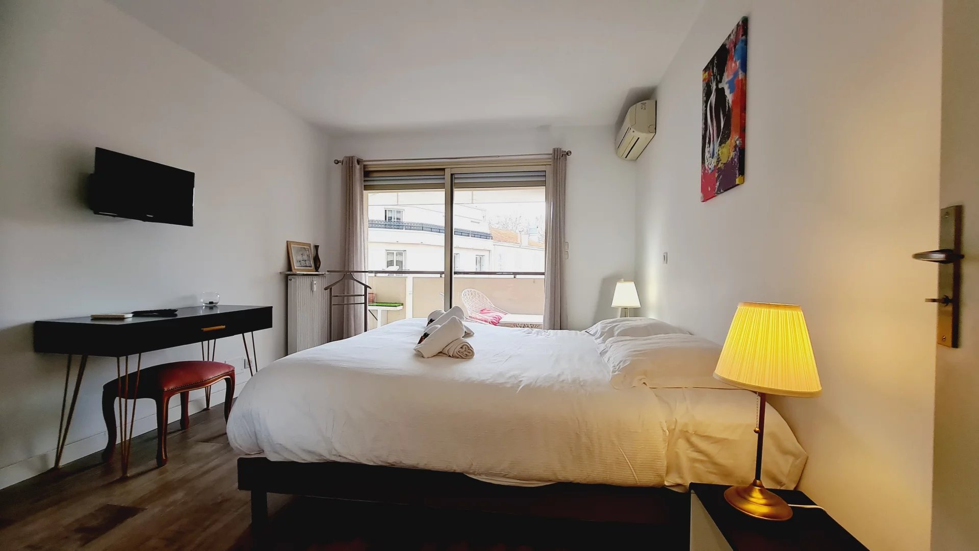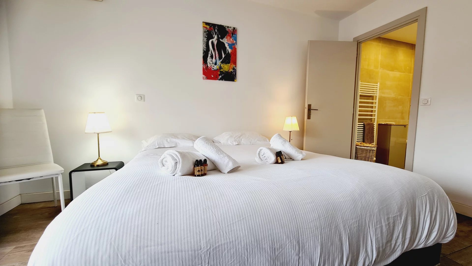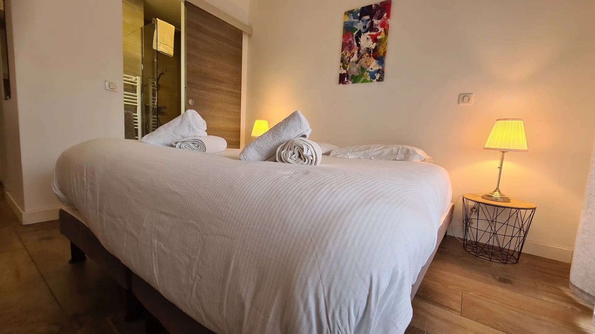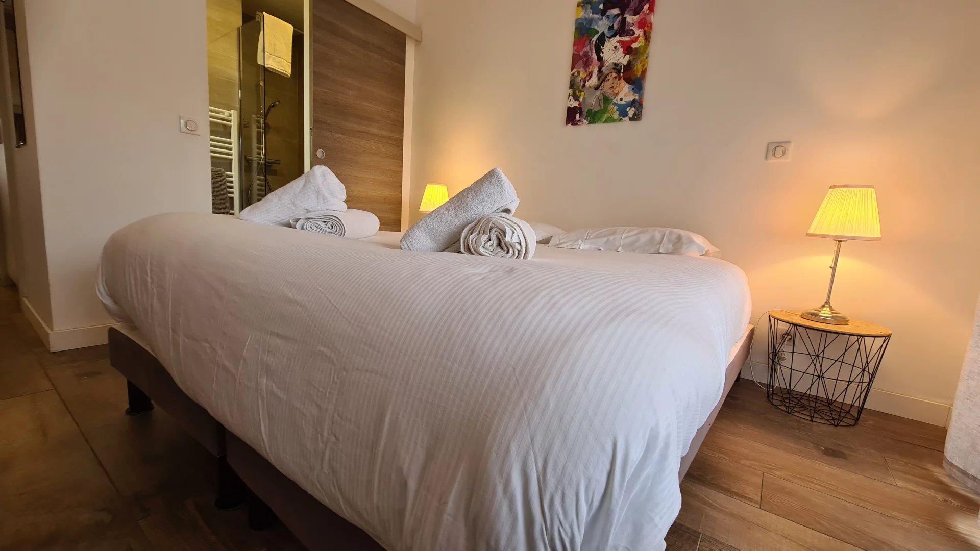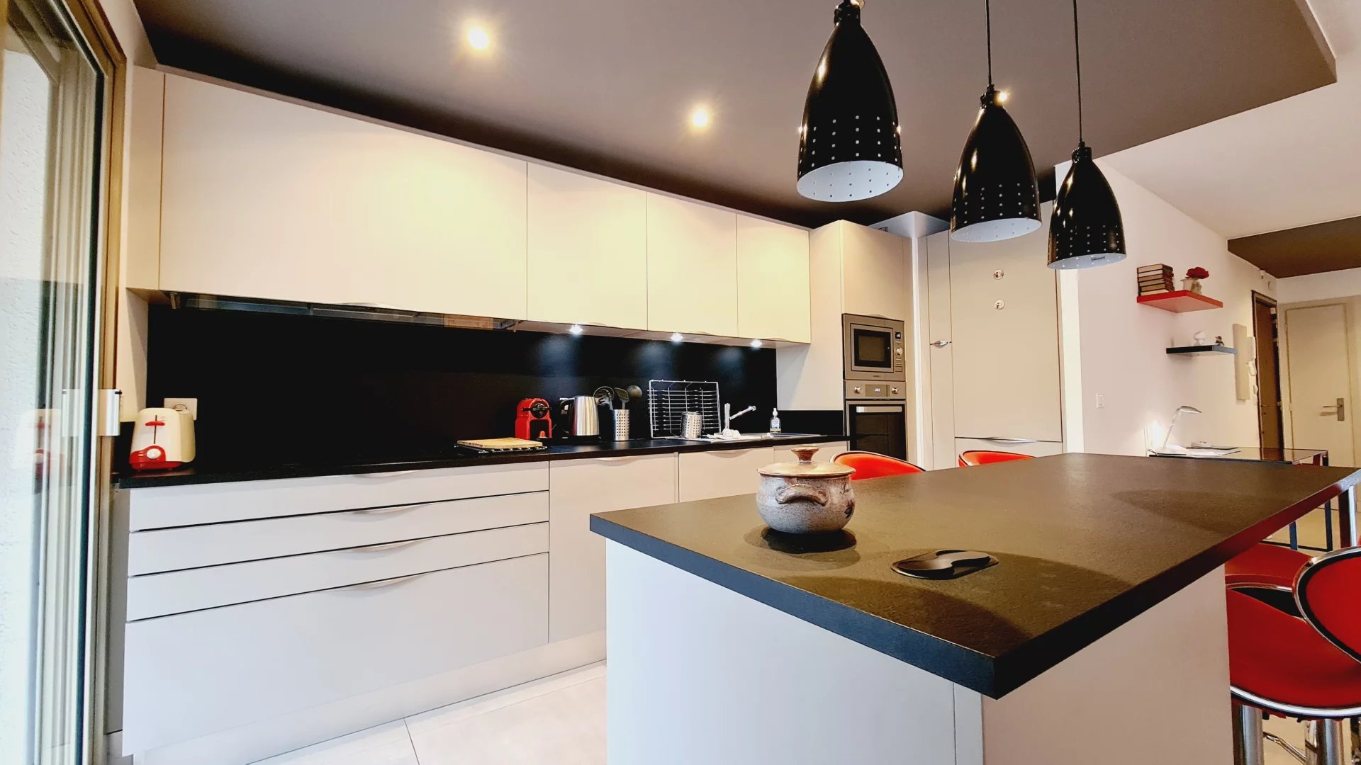 Appartement type 3 pièces, refait à neuf, de 80 m² composé : d'une entrée, un séjour-salle à manger, une cuisine équipée, 2 chambres, une avec sa salle de bains et la seconde avec sa salle de douches, 1 WC indépendant et deux terrasses de 14 et 12 m². Climatisation dans une chambre et le salon. Internet Fibre.
