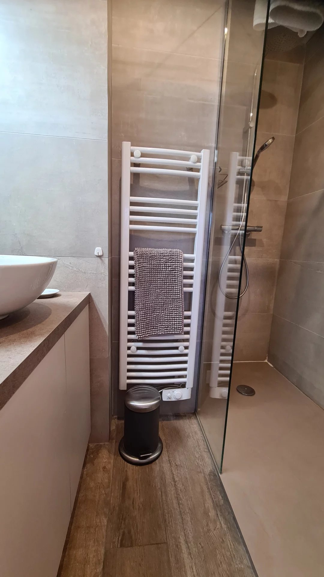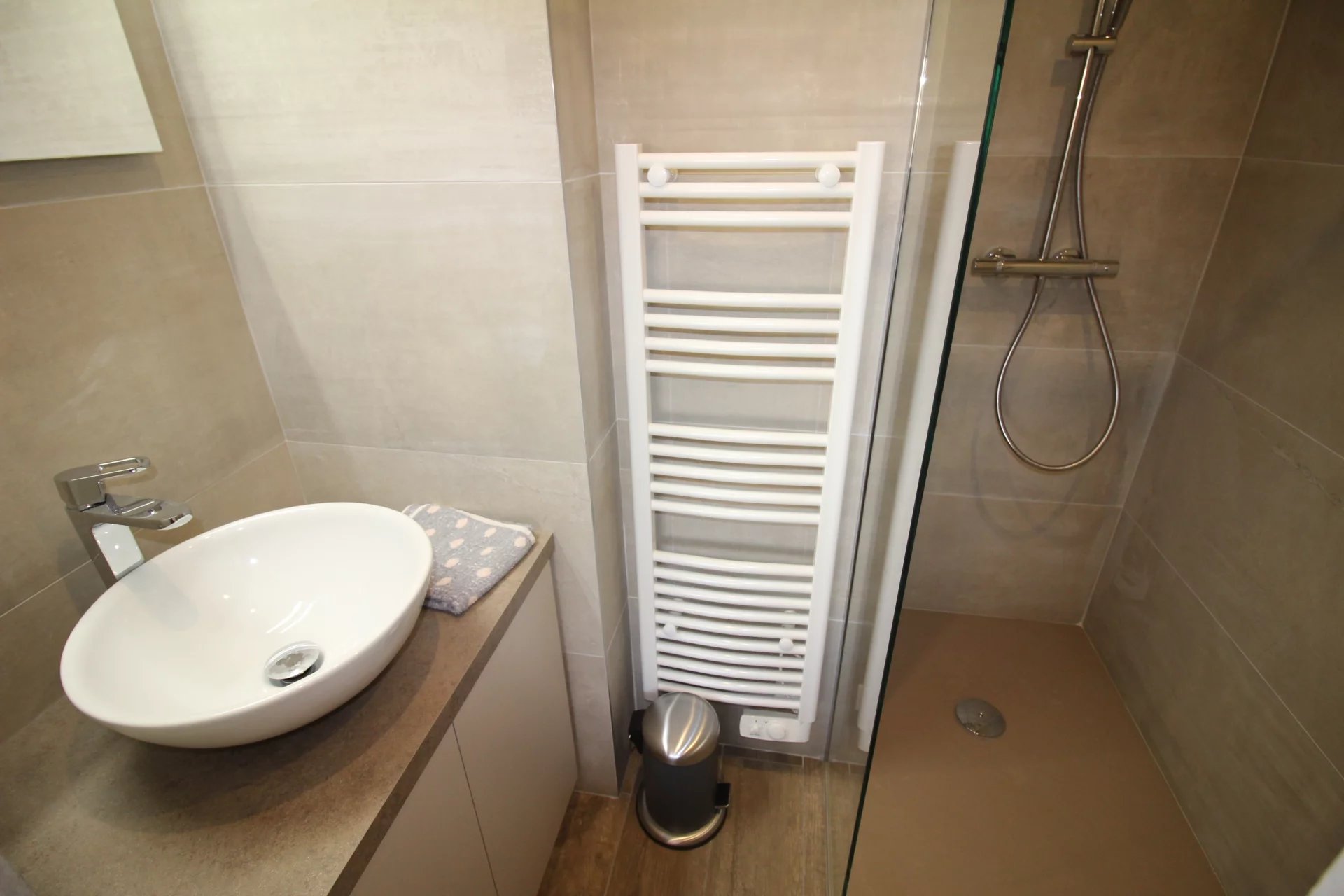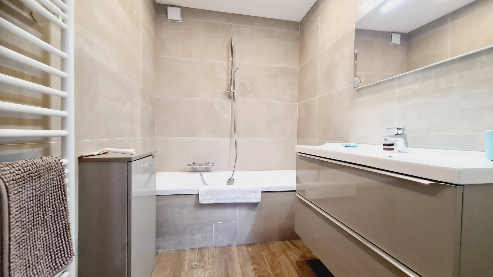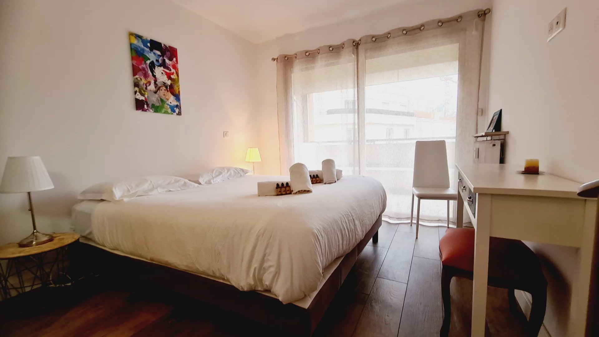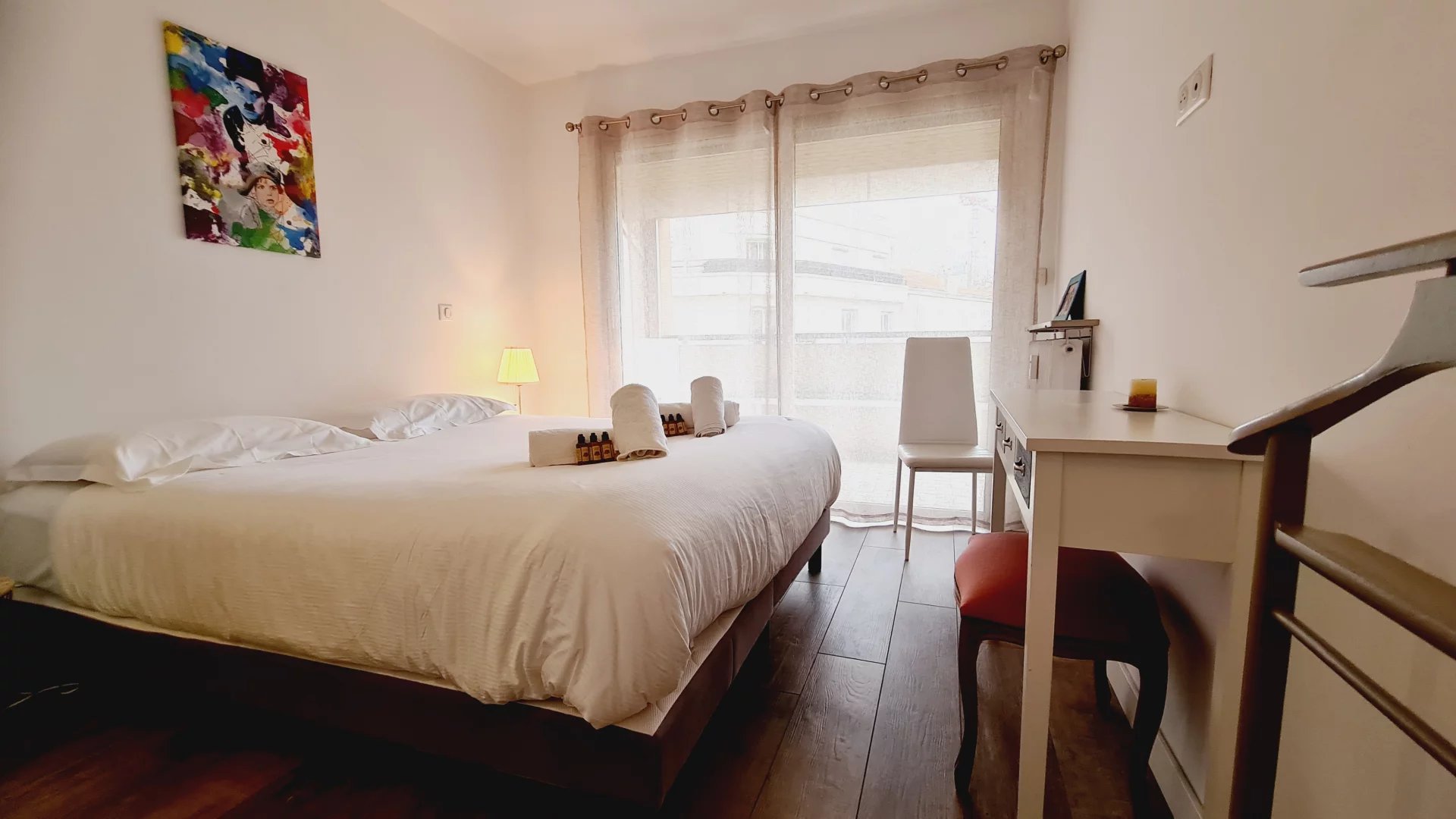 Appartement type 3 pièces, refait à neuf, de 80 m² composé : d'une entrée, un séjour-salle à manger, une cuisine équipée, 2 chambres, une avec sa salle de bains et la seconde avec sa salle de douches, 1 WC indépendant et deux terrasses de 14 et 12 m². Climatisation dans une chambre et le salon. Internet Fibre.