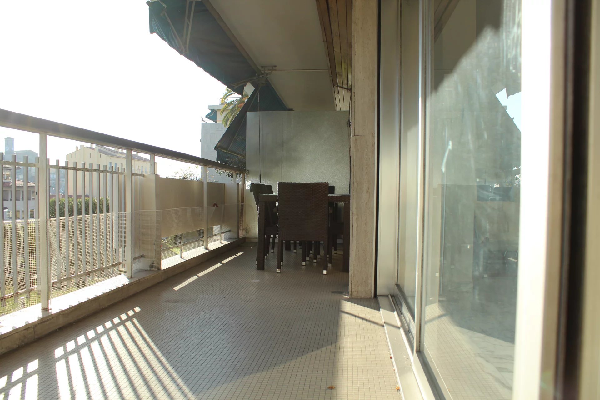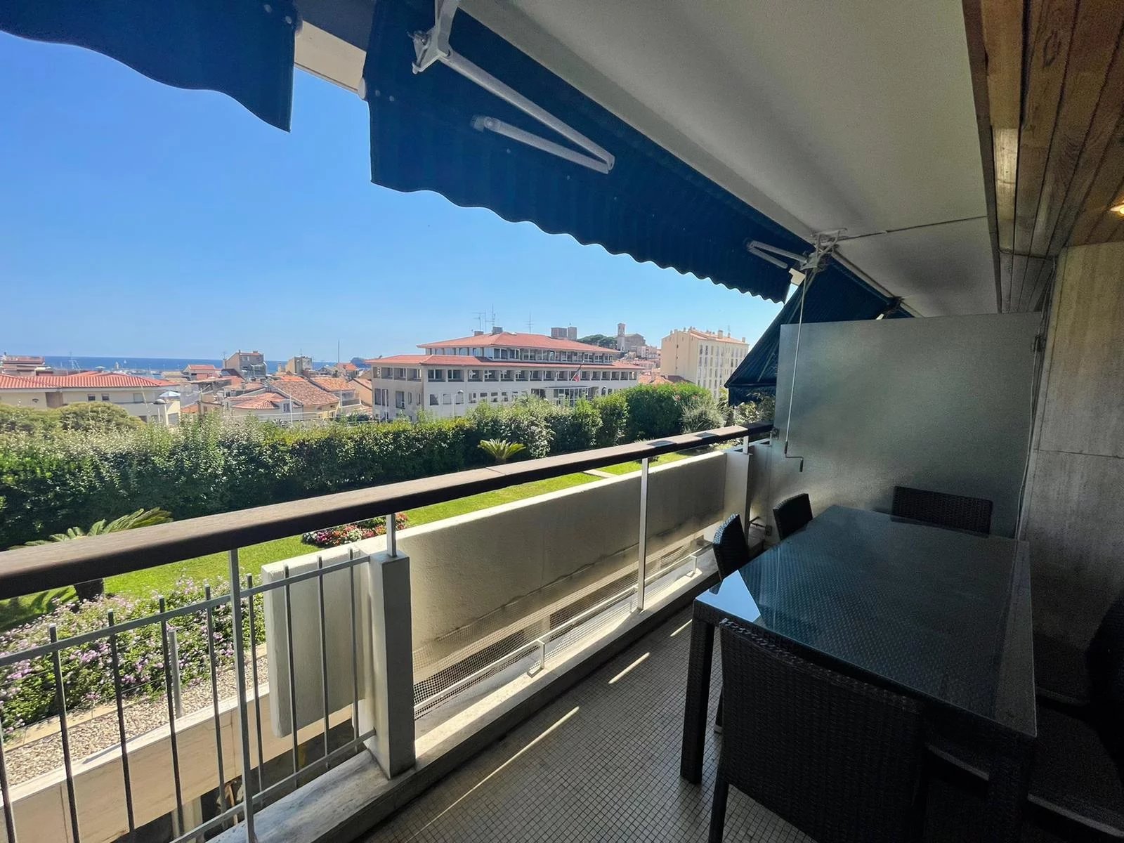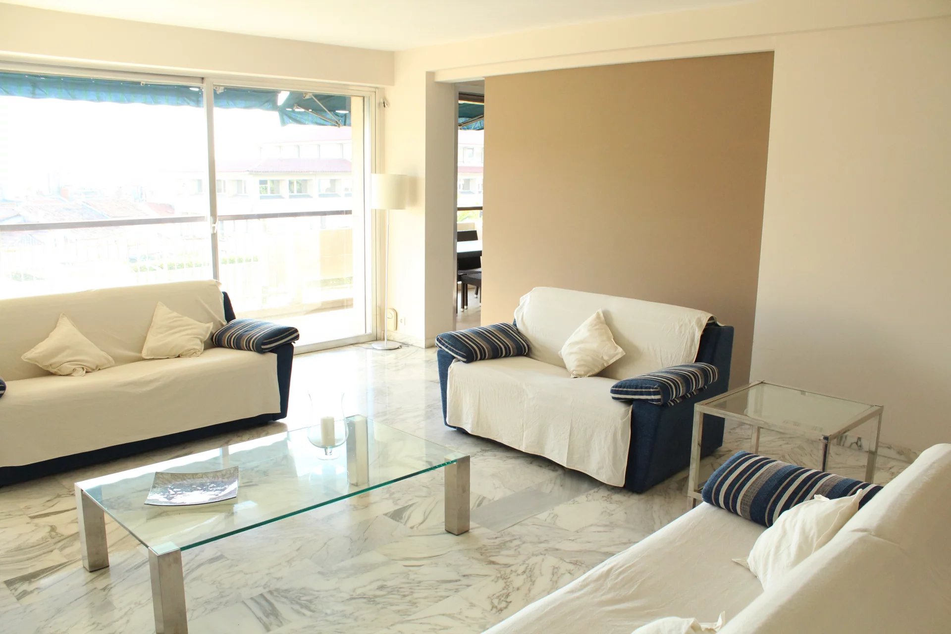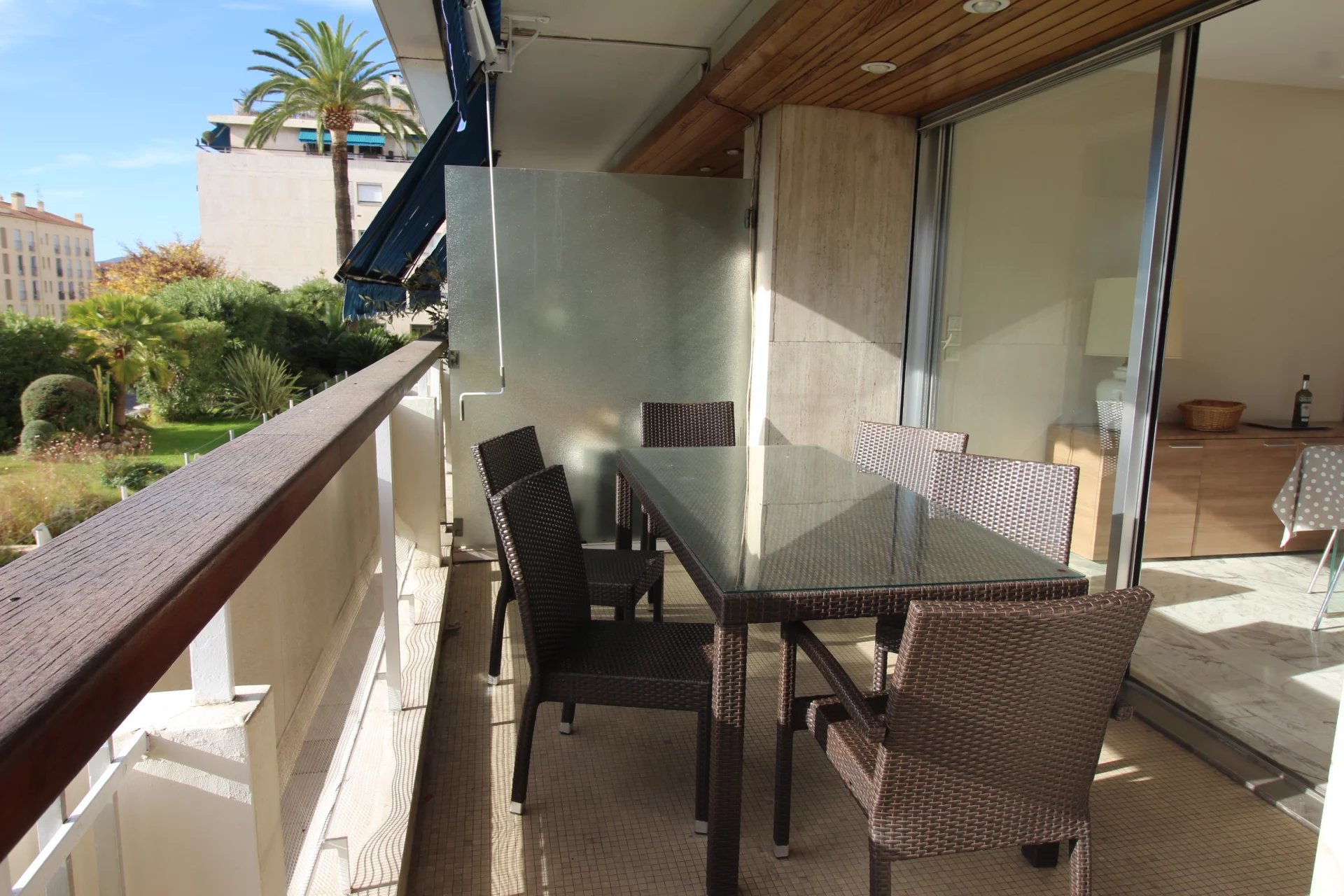 Cet appartement est situé dans une résidence de standing sécurisée et fermée. A 8 minutes à pied du palais, des plages et du centre ville. Il s'agit d'un grand appartement de 2 chambres, salon salle à, manger, cuisine équipée, une salle de bains ave baignoire d'angle, une salle de douche en suite dans la seconde chambre, un coin bureau, une grande terrasse sur avec un petit apreçu sur la mer L'appartement a une double exposition, il n'est pas climatisé mais il est aisé de le rafraichir en maissant l'air circuler