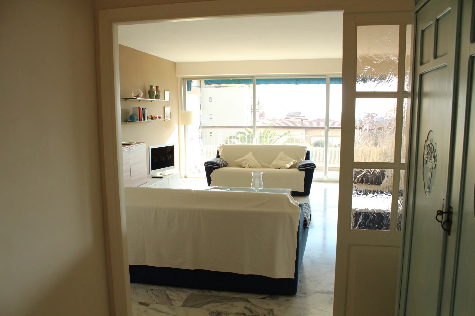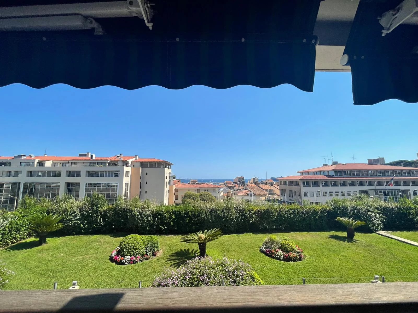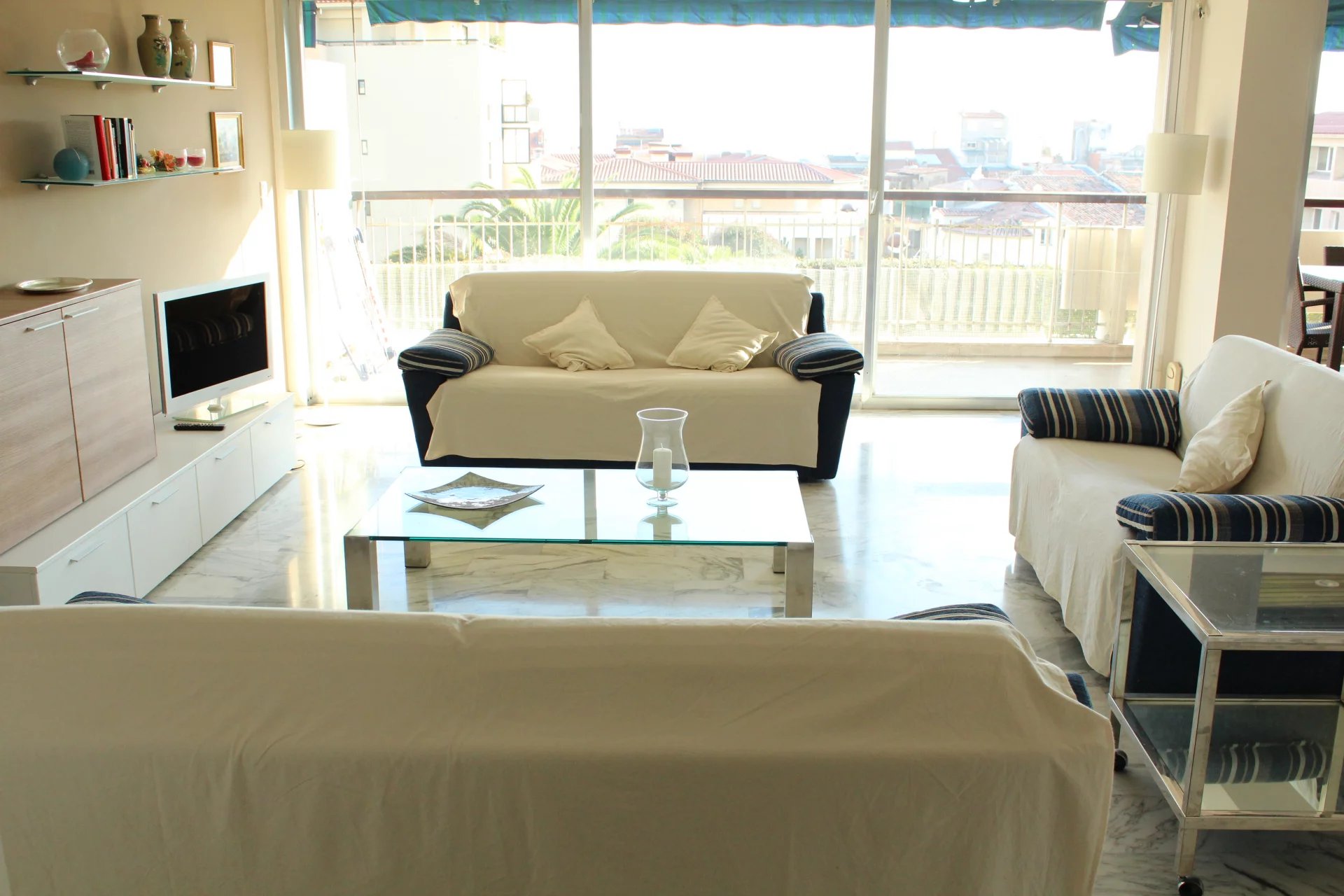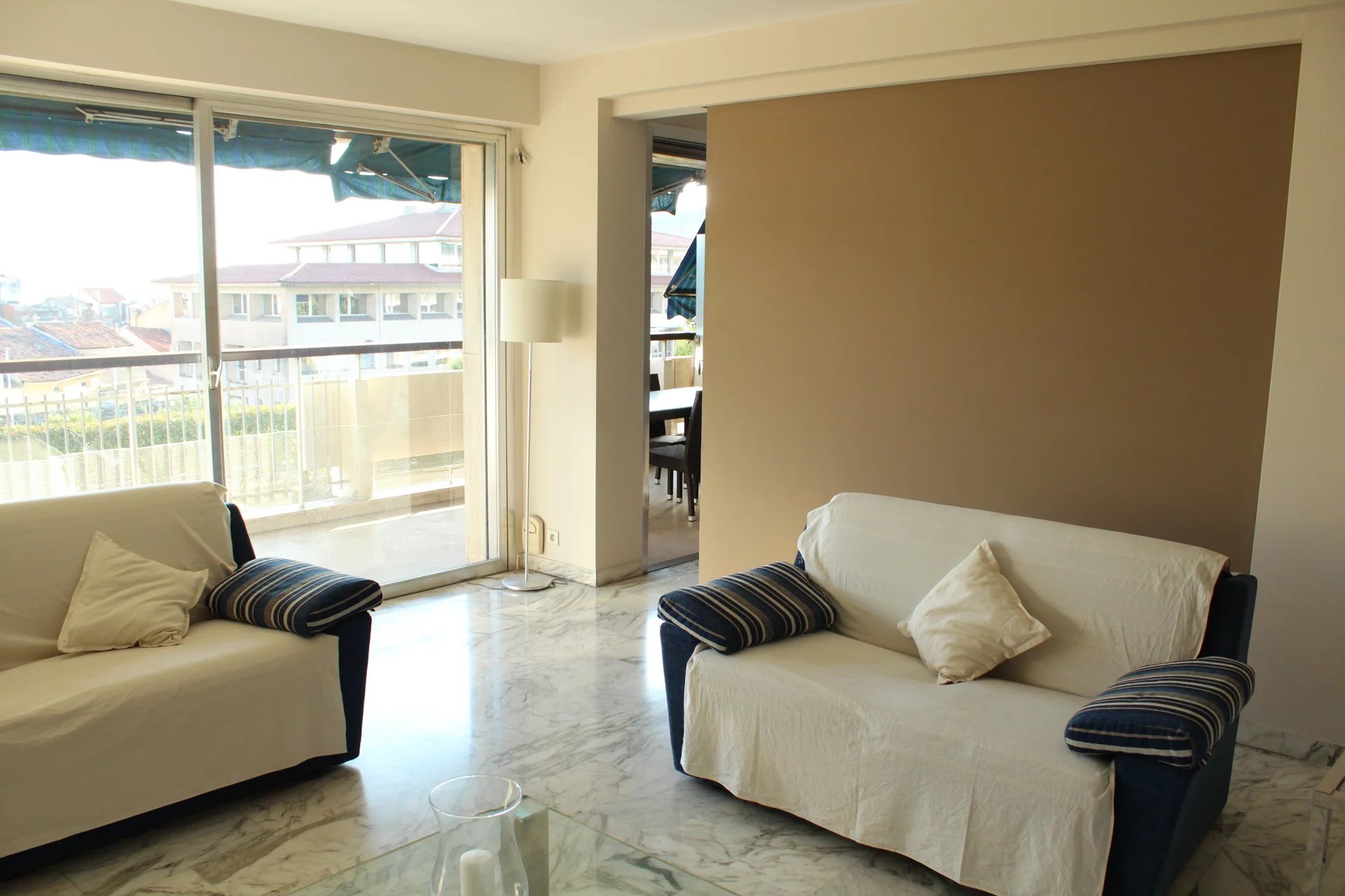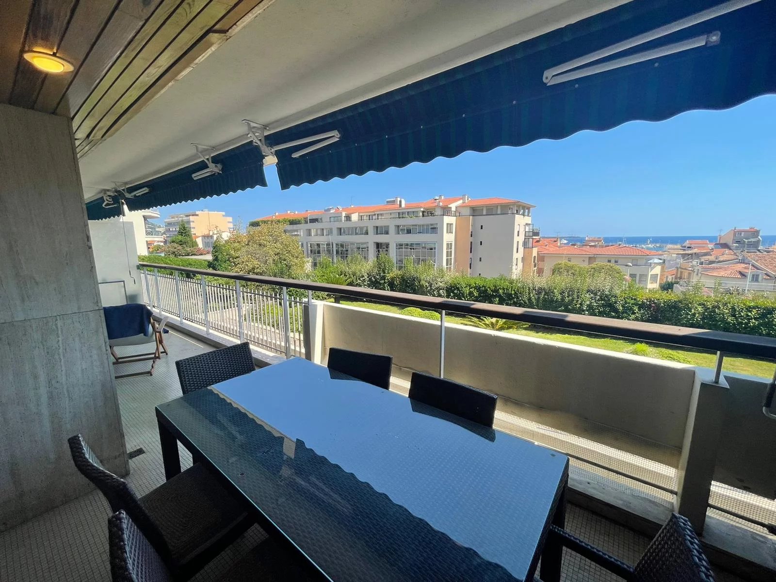 Cet appartement est situé dans une résidence de standing sécurisée et fermée. A 8 minutes à pied du palais, des plages et du centre ville. Il s'agit d'un grand appartement de 2 chambres, salon salle à, manger, cuisine équipée, une salle de bains ave baignoire d'angle, une salle de douche en suite dans la seconde chambre, un coin bureau, une grande terrasse sur avec un petit apreçu sur la mer L'appartement a une double exposition, il n'est pas climatisé mais il est aisé de le rafraichir en maissant l'air circuler
