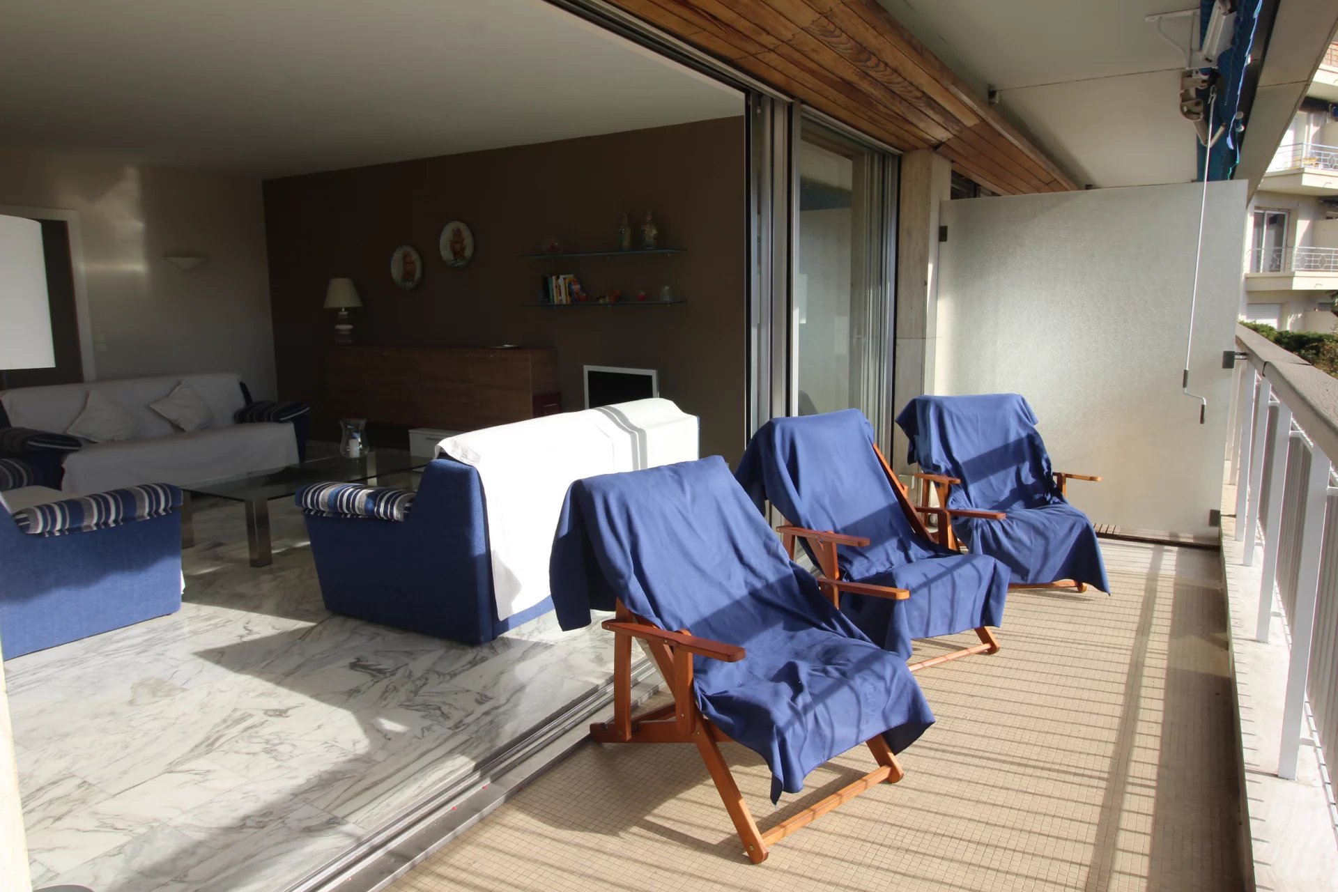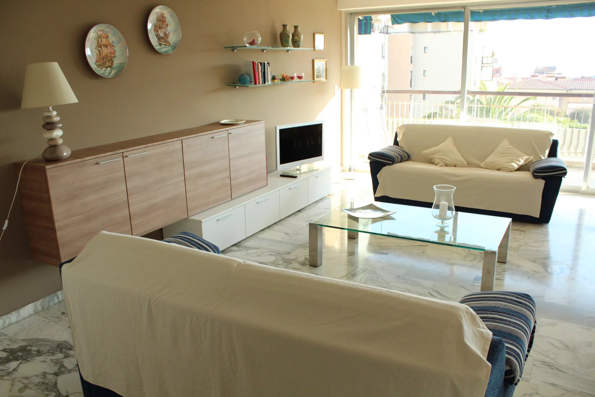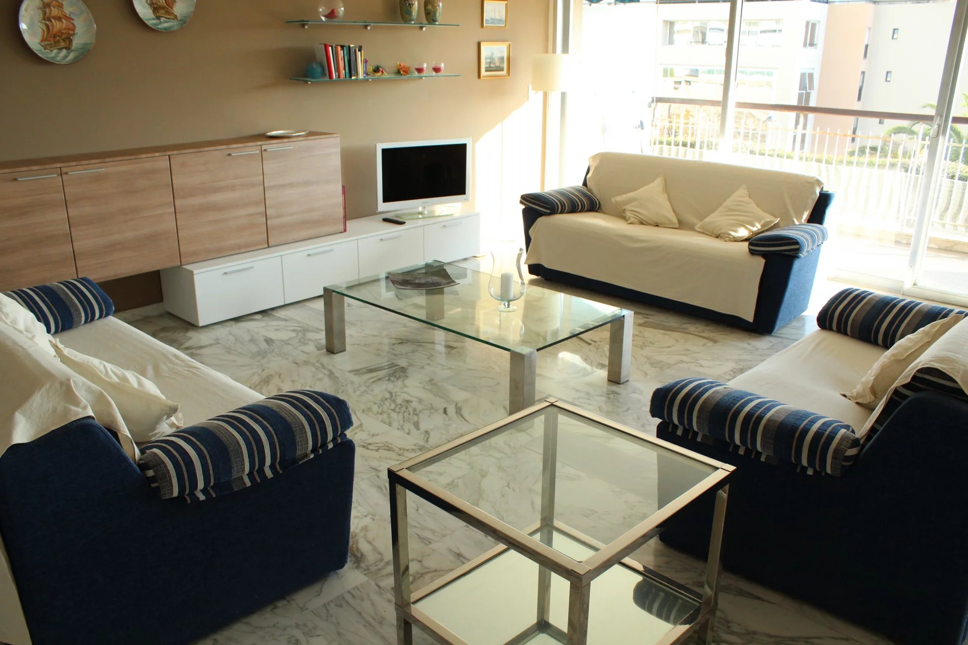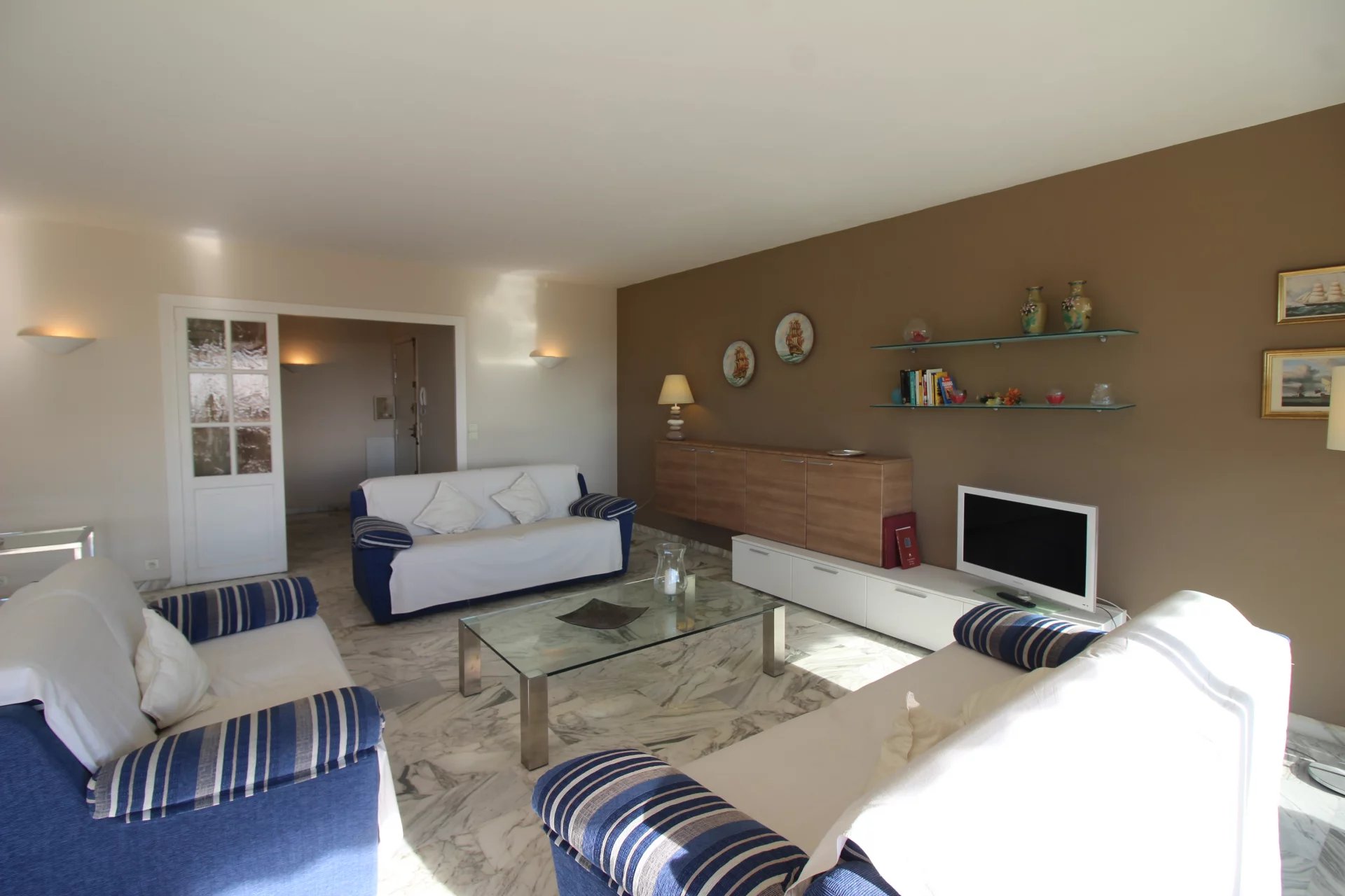 Cet appartement est situé dans une résidence de standing sécurisée et fermée. A 8 minutes à pied du palais, des plages et du centre ville. Il s'agit d'un grand appartement de 2 chambres, salon salle à, manger, cuisine équipée, une salle de bains ave baignoire d'angle, une salle de douche en suite dans la seconde chambre, un coin bureau, une grande terrasse sur avec un petit apreçu sur la mer L'appartement a une double exposition, il n'est pas climatisé mais il est aisé de le rafraichir en maissant l'air circuler