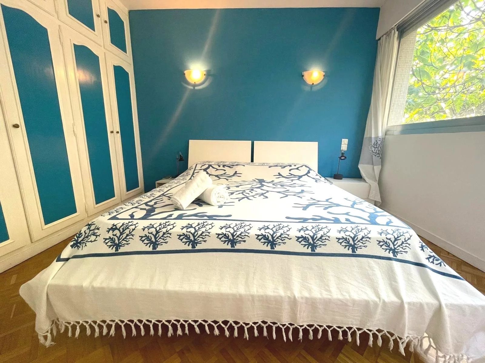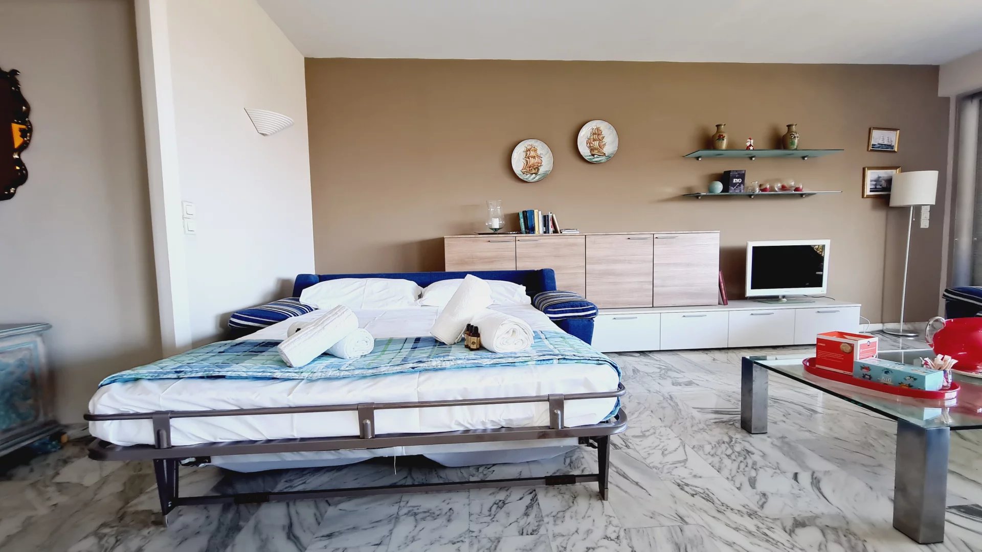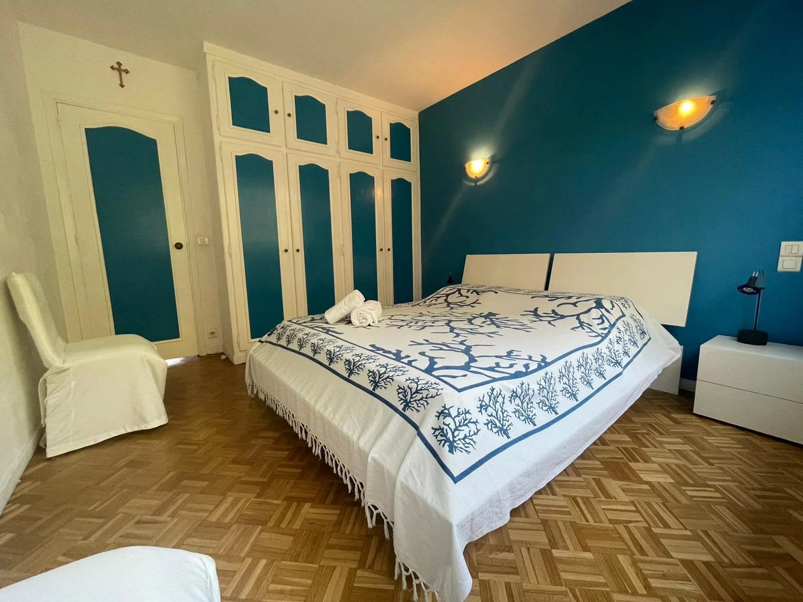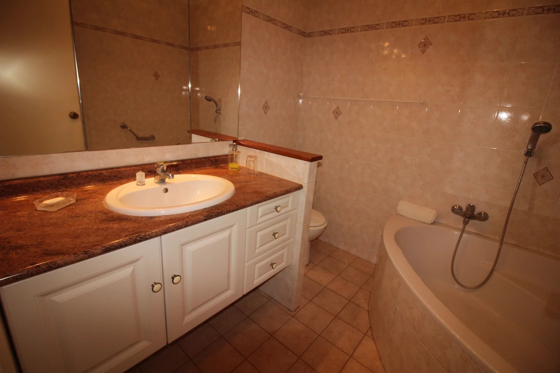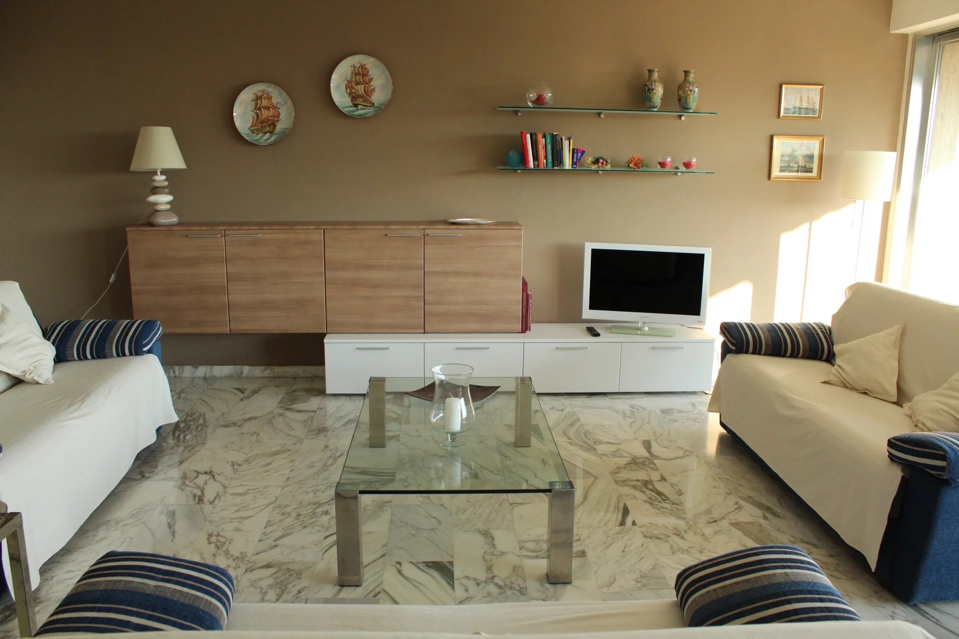 Cet appartement est situé dans une résidence de standing sécurisée et fermée. A 8 minutes à pied du palais, des plages et du centre ville. Il s'agit d'un grand appartement de 2 chambres, salon salle à, manger, cuisine équipée, une salle de bains ave baignoire d'angle, une salle de douche en suite dans la seconde chambre, un coin bureau, une grande terrasse sur avec un petit apreçu sur la mer L'appartement a une double exposition, il n'est pas climatisé mais il est aisé de le rafraichir en maissant l'air circuler