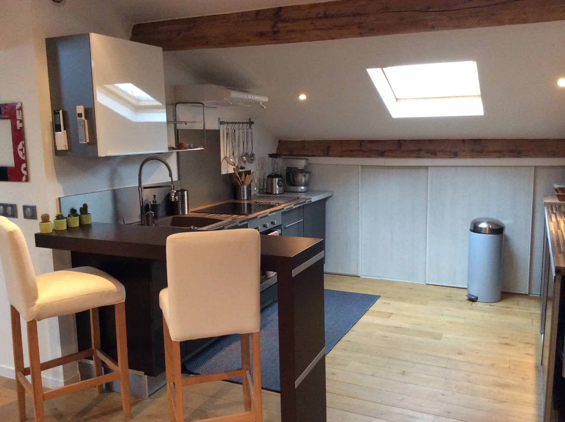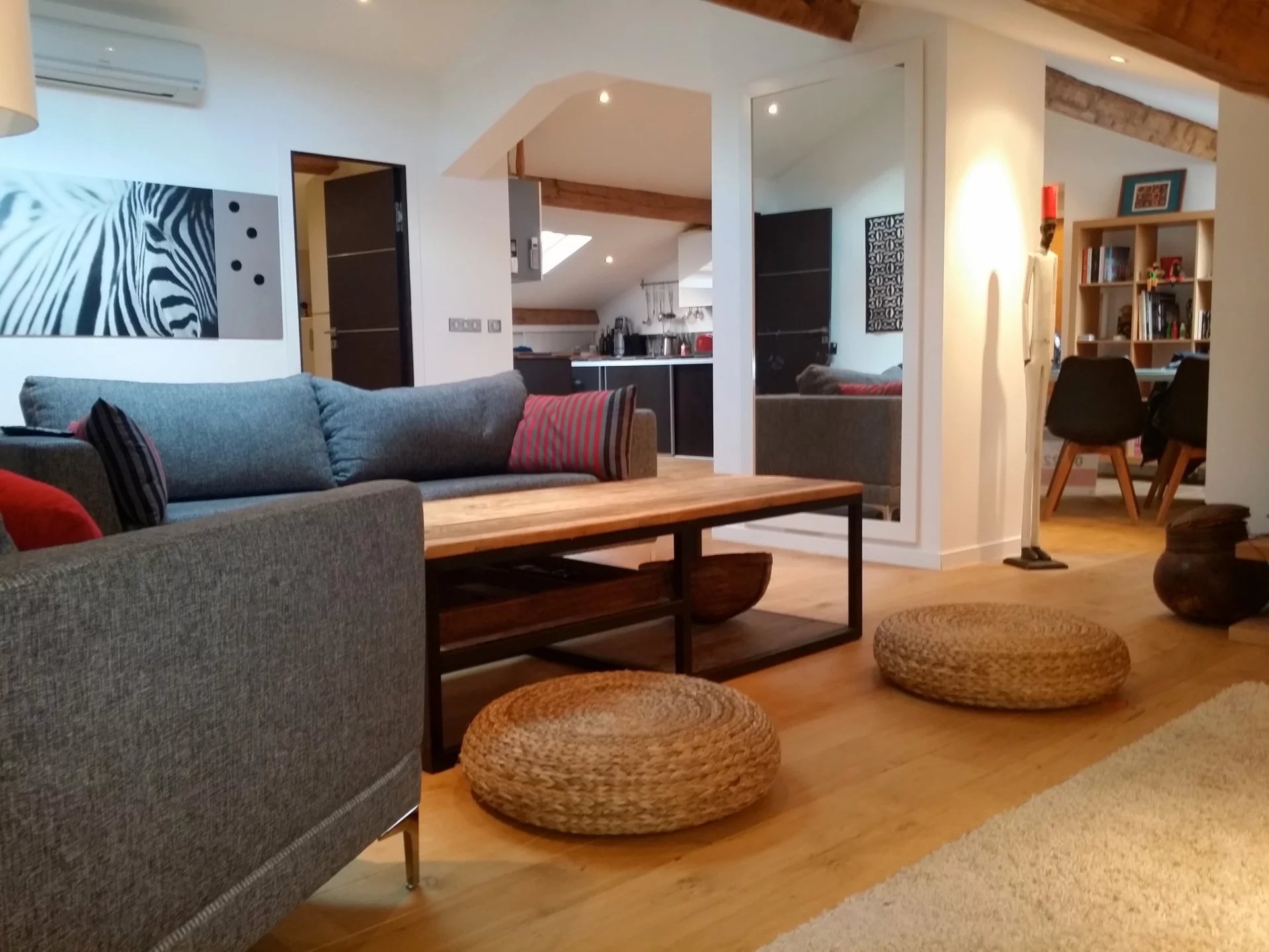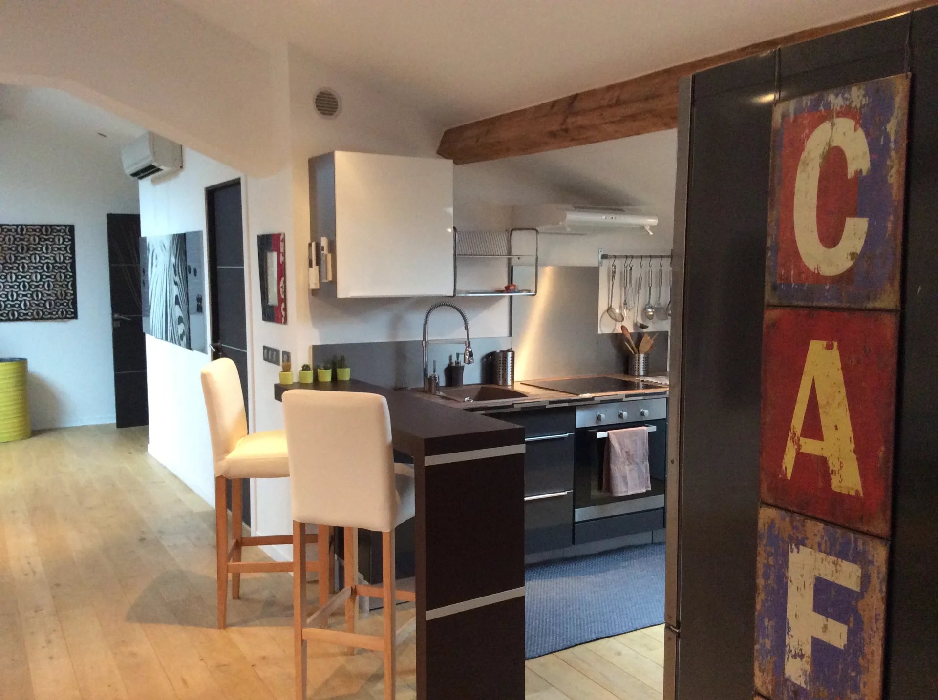 3 Pièces, 2 chambres, 2 salles d'eau. Proche rue d'Antibes Centre ville, proche de la Croisette et de la Rue d'antibes, appartement 3 P sous les combles, au 4 ° et dernier étage d'un immeuble sans ascenseur. Cet appartement pouvant accueillir jusqu'a 4 personnes se compose d'une entrée, un salon salle a manger avec cuisine américaine équipée, 2 chambres dont l'une avec salle d'eau en suite, une salle de bains avec wc. Climatisation et acces internet. Appartement en excellent état, très bien agencé et décoré.