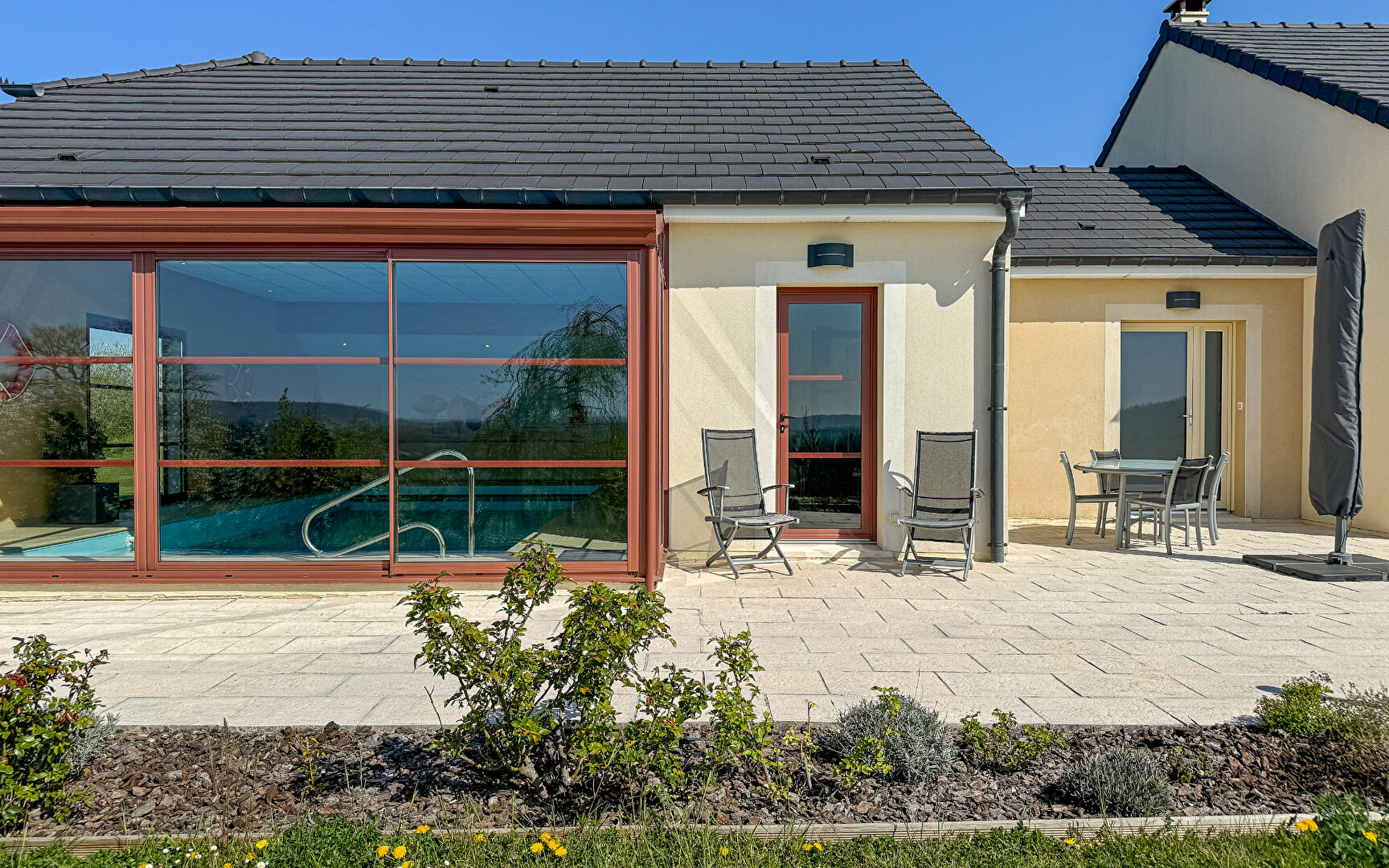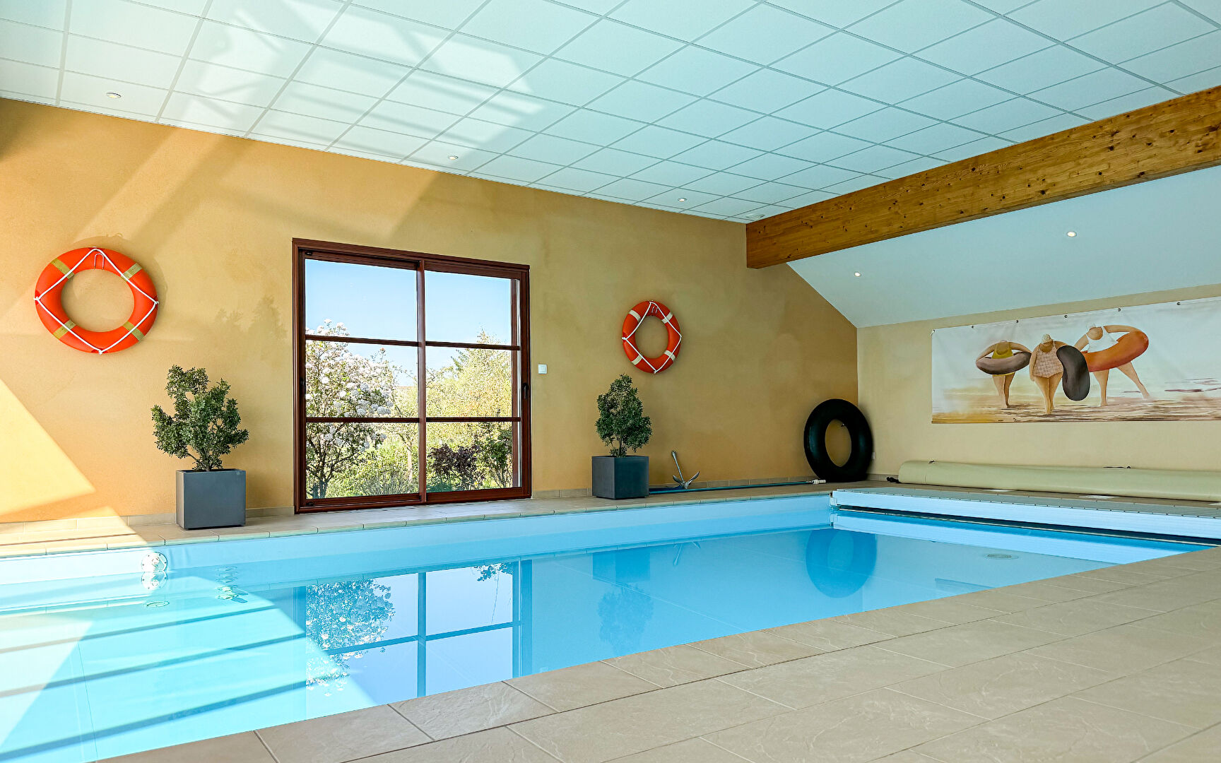 MAISON 2011 aux PRESTATIONS d'EXCEPTION A 30 minutes de la sortie autoroute A31, en lisière du charmant village international de MELAY, entre LANGRES et VITTEL, se dresse avec fierté cette maison d'exception, sur son vaste terrain de 92 ares, dominant la campagne vallonnée. Entièrement de plain-pied, elle propose des prestations hors normes pour la région, sur plus de 260m² d'habitation baignée de lumière. Pour les plus exigeants. VOLUMES ET LUMINOSITE DE TOUS CÔTES Entrée centrale, qui vous accueille comme il se doit, vers une vaste pièce de vie salon/salle à manger, ouverte sur la cuisine super-équipée. Partout, les prestations sont d'exception : chauffage au sol, insert pour l'ambiance, Clim réversible pour les grosses chaleur, électroménager Poggenpohl pour les petits et « grands » plats, doubles vitrages et volets alu, véranda ouverte plein sud, avec lumière traversante à la fin de journée côté terrasse arrière. L'ensemble, ouvert sur plus de 100m² chauffé par impulsion pompe à chaleur air/eau, en géothermie verticale (puits à l'arrière de la maison). Dans le prolongement du couloir de l'aile droite, agrémenté de nombreux placards : l'espace nuit, avec deux suites, chacune avec sa salle d'eau/WC privative, avec accès terrasse, de plain-pied. Un bureau donne lui, accès au garage double, avec buanderie et local technique (adoucisseur d'eau, aspiration centralisée, centrale VMC et récupérateur d'eau). Et dans l'aile gauche, de plus de 85m², parfaitement intégrée à l'habitation : la piscine intérieure, chauffée bien entendu, qui s'ouvre dès les premiers rayons de soleil sur la terrasse... Nage à contre-courant au programme pour les « sportifs ». Douche et WC à proximité. Quant au sous-sol, sous la piscine, il est entièrement dédié à la partie chaufferie (GERMINOX), à la pointe de la technologie de la géothermie verticale. Eau du puits, chauffée et circulant au sol, avec complément en climatisation réversible, utile été comme hiver. Et pour terminer, un portail motorisé avec visio-surveillance, clôturant ce superbe espace de parc, fleuri à souhait, avec de nombreux arbres fruitiers à l'arrière, et un BBQ côté terrasse, pour les longues soirées ensoleillées de l'été indien. En bout de charmant village de MELAY, entre l'Eglise et la Chapelle... tout proche de la ville thermale de BOURBONNE les BAINS, en plein essor. A voir rapidement. Prix baissé. Dossier complet sur demande. Sylvie du WELZ (EI) Agent Commercial - Numéro RSAC : 493 231 039 - BESANCON.