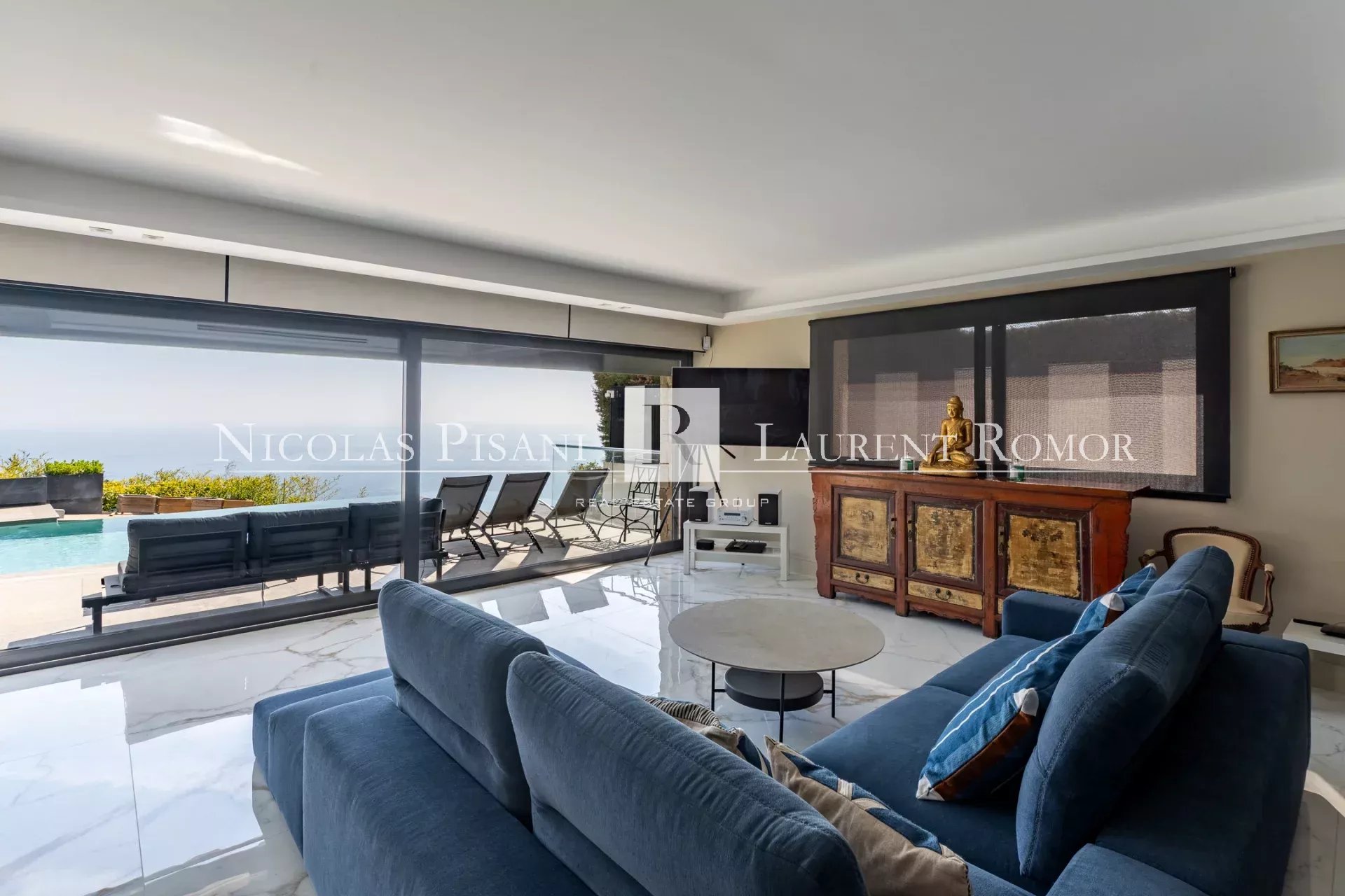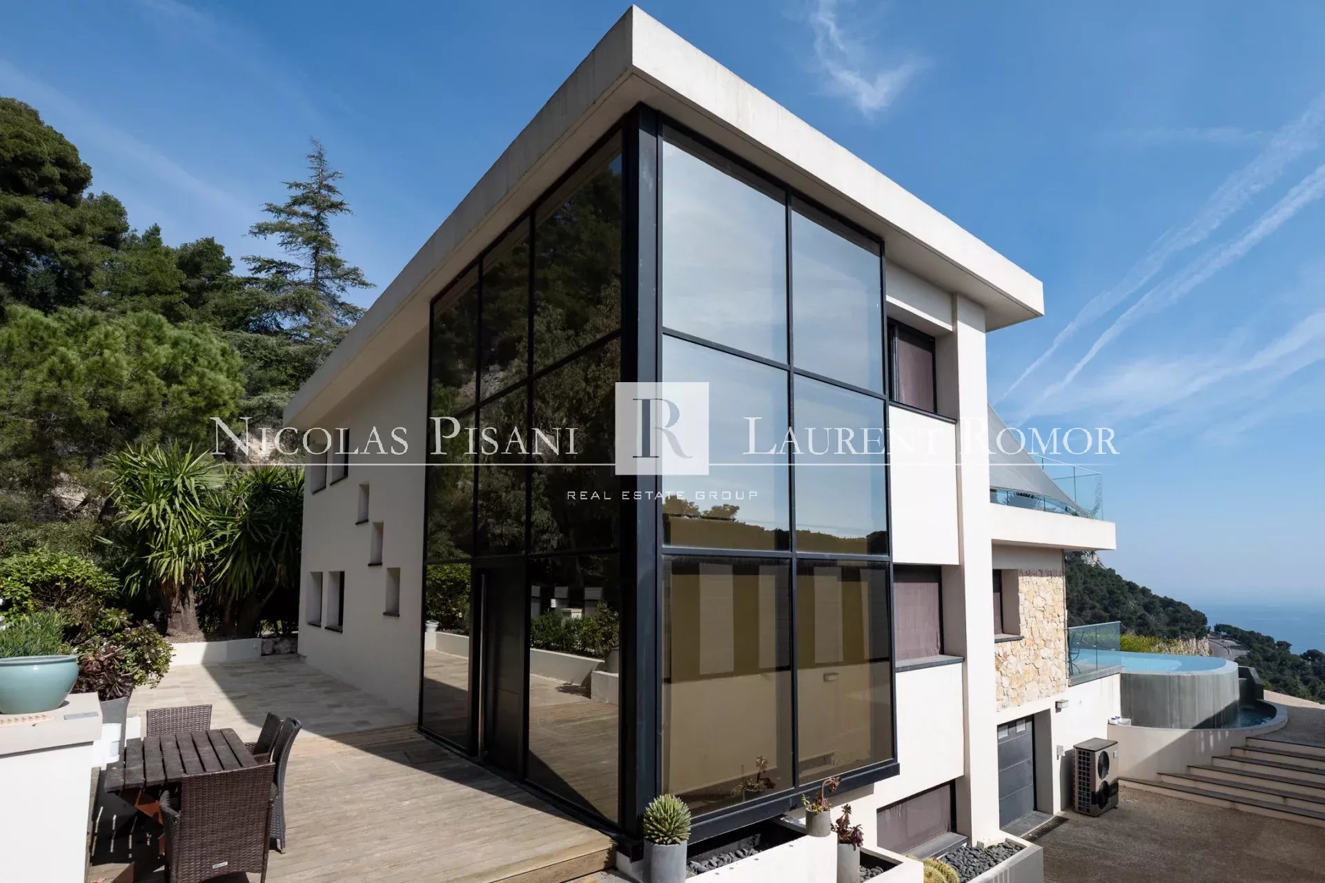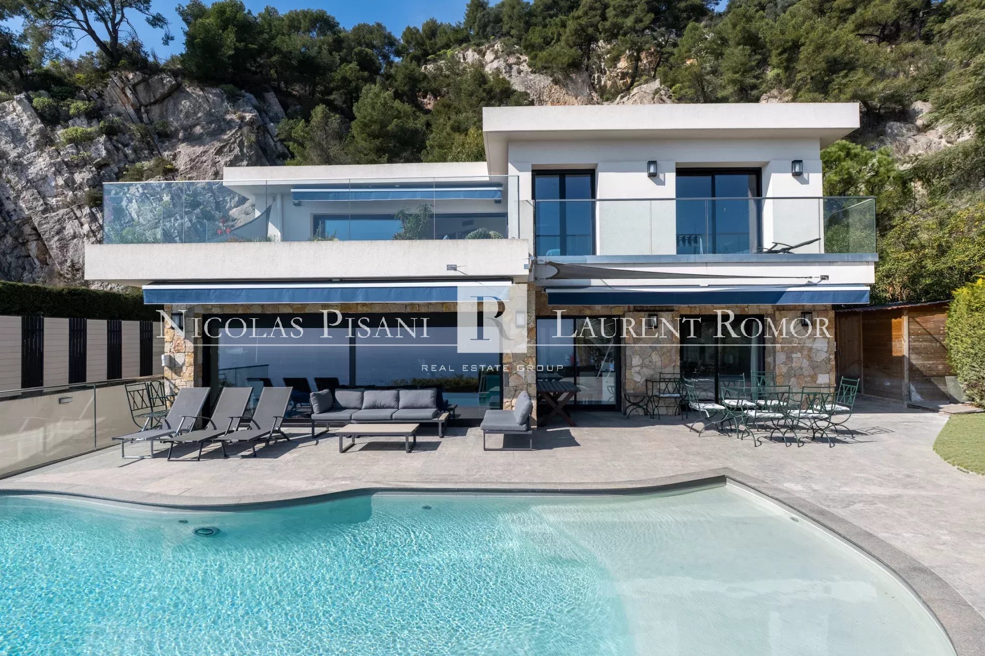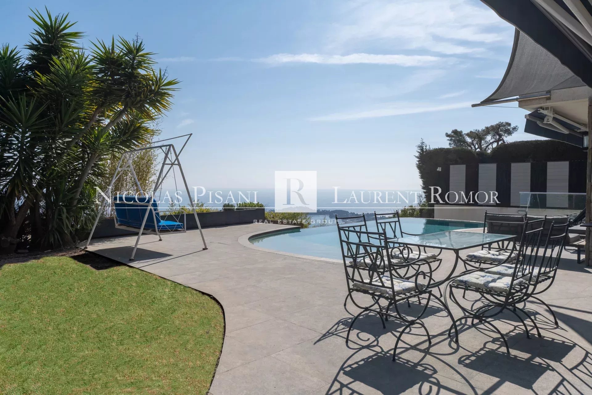 Nichée sur la colline et surplombant la mer, cette villa contemporaine est composée comme suit: un grand salon avec cuisine américaine, de vastes terrasses et une belle piscine, deux chambres et deux salles de douche. A l'étage : deux chambres et deux salles de douche Une chambre avec salle de douche à côté du home cinema et un studio d'invité . Possibilité de se garer facilement.