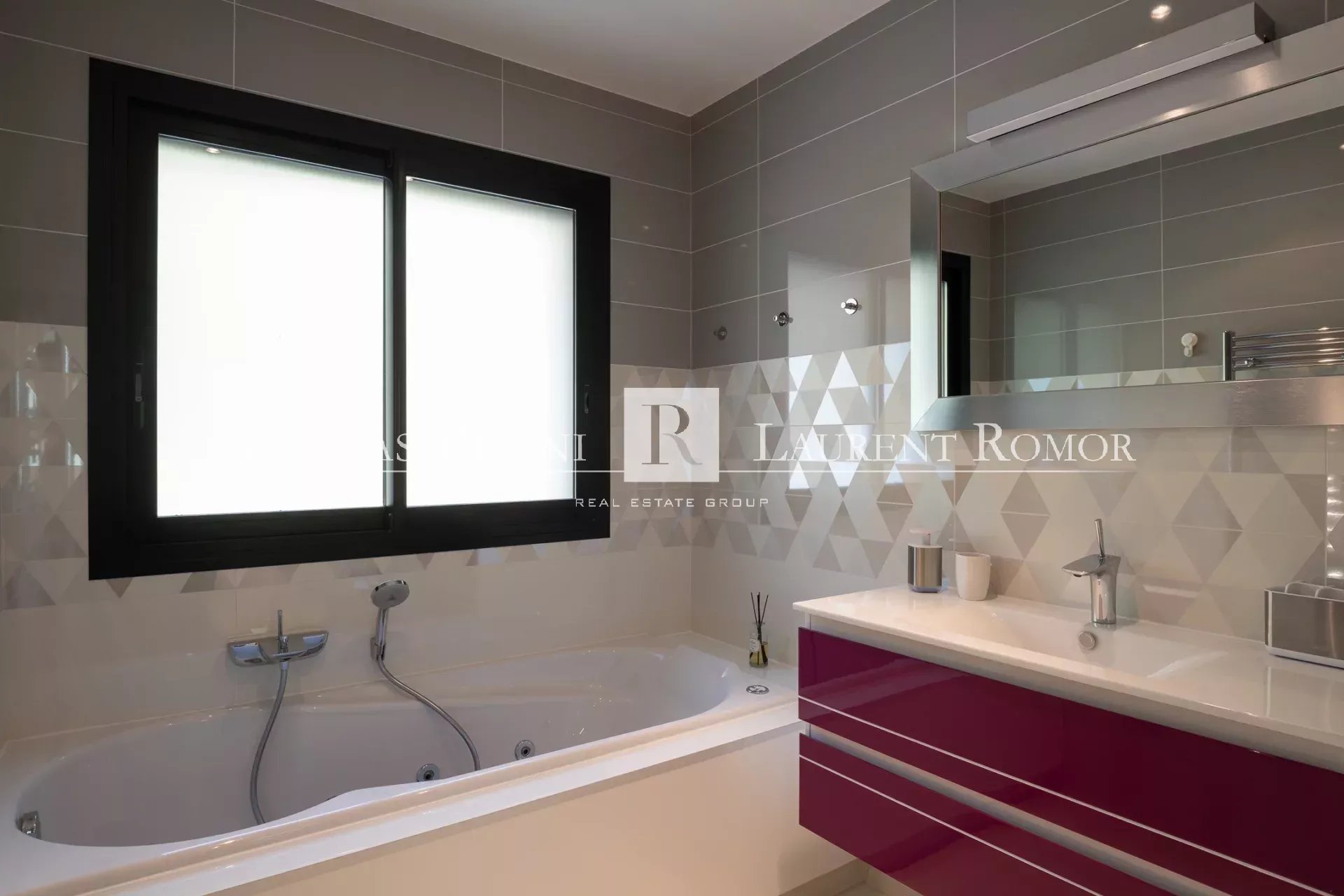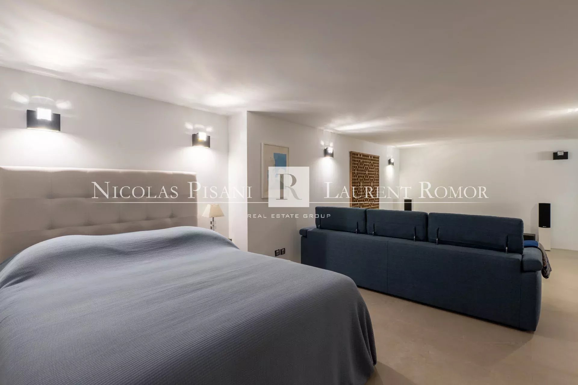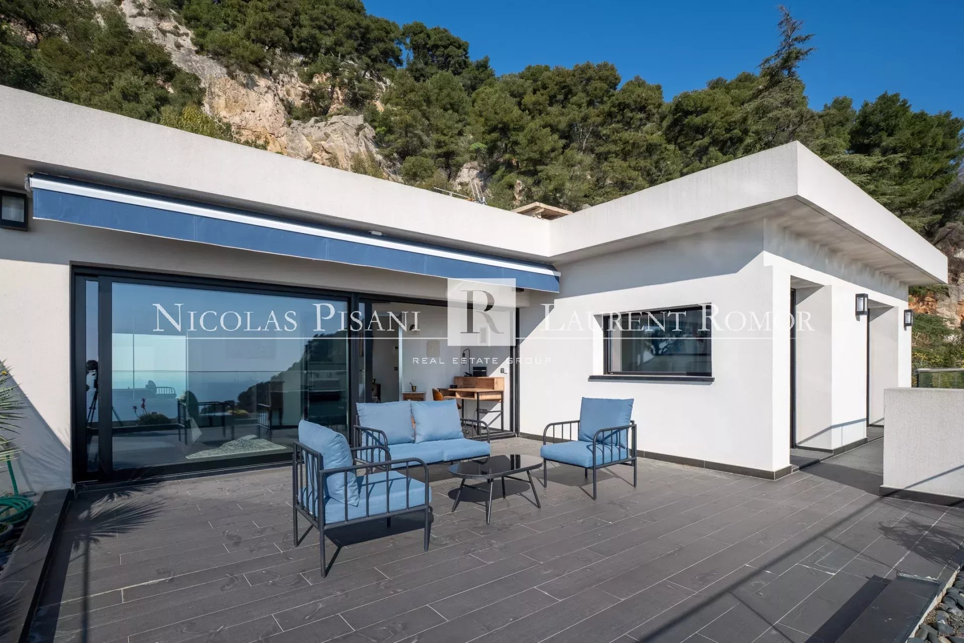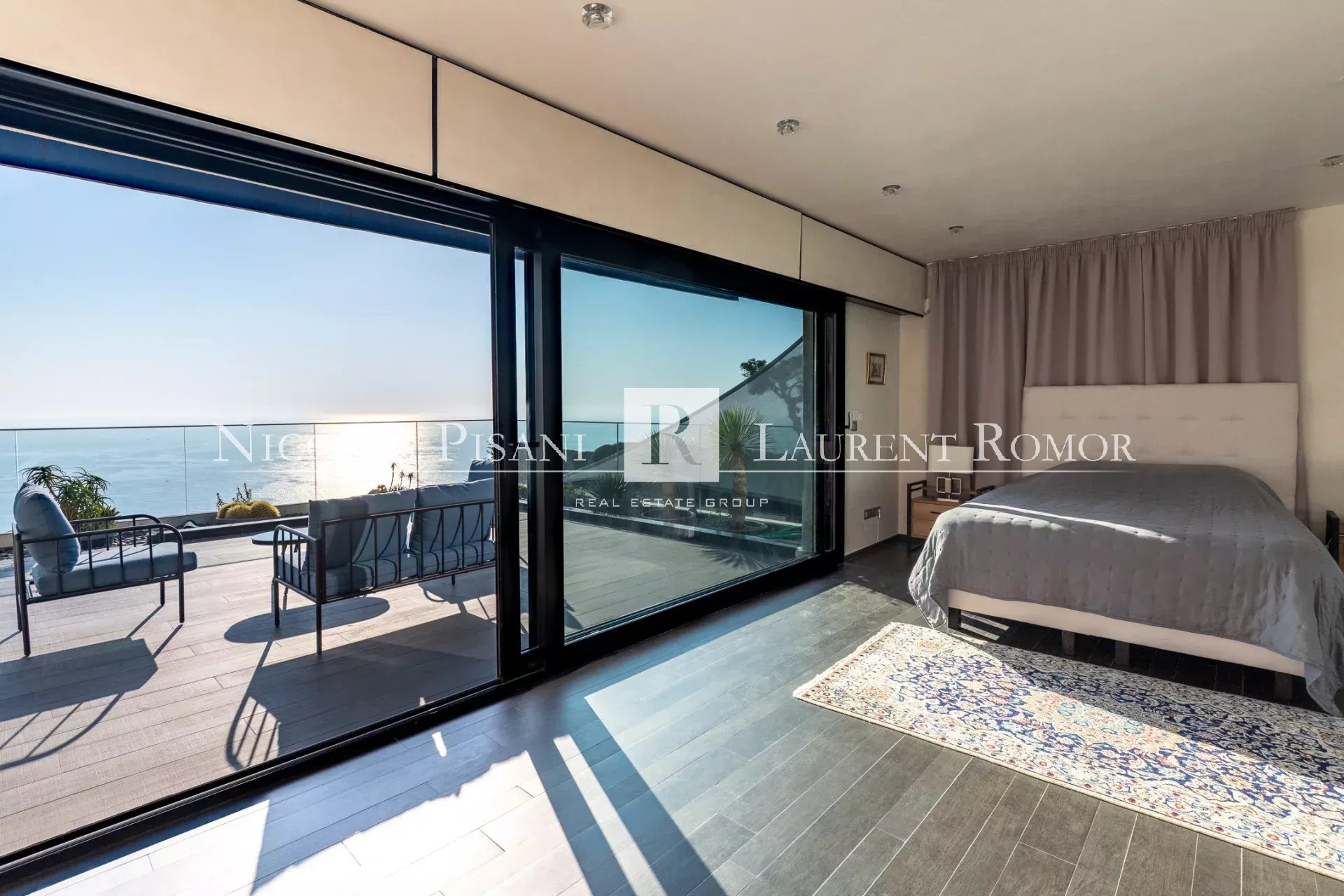 Nichée sur la colline et surplombant la mer, cette villa contemporaine est composée comme suit: un grand salon avec cuisine américaine, de vastes terrasses et une belle piscine, deux chambres et deux salles de douche. A l'étage : deux chambres et deux salles de douche Une chambre avec salle de douche à côté du home cinema et un studio d'invité . Possibilité de se garer facilement.