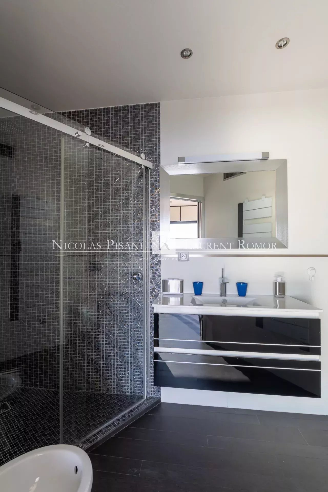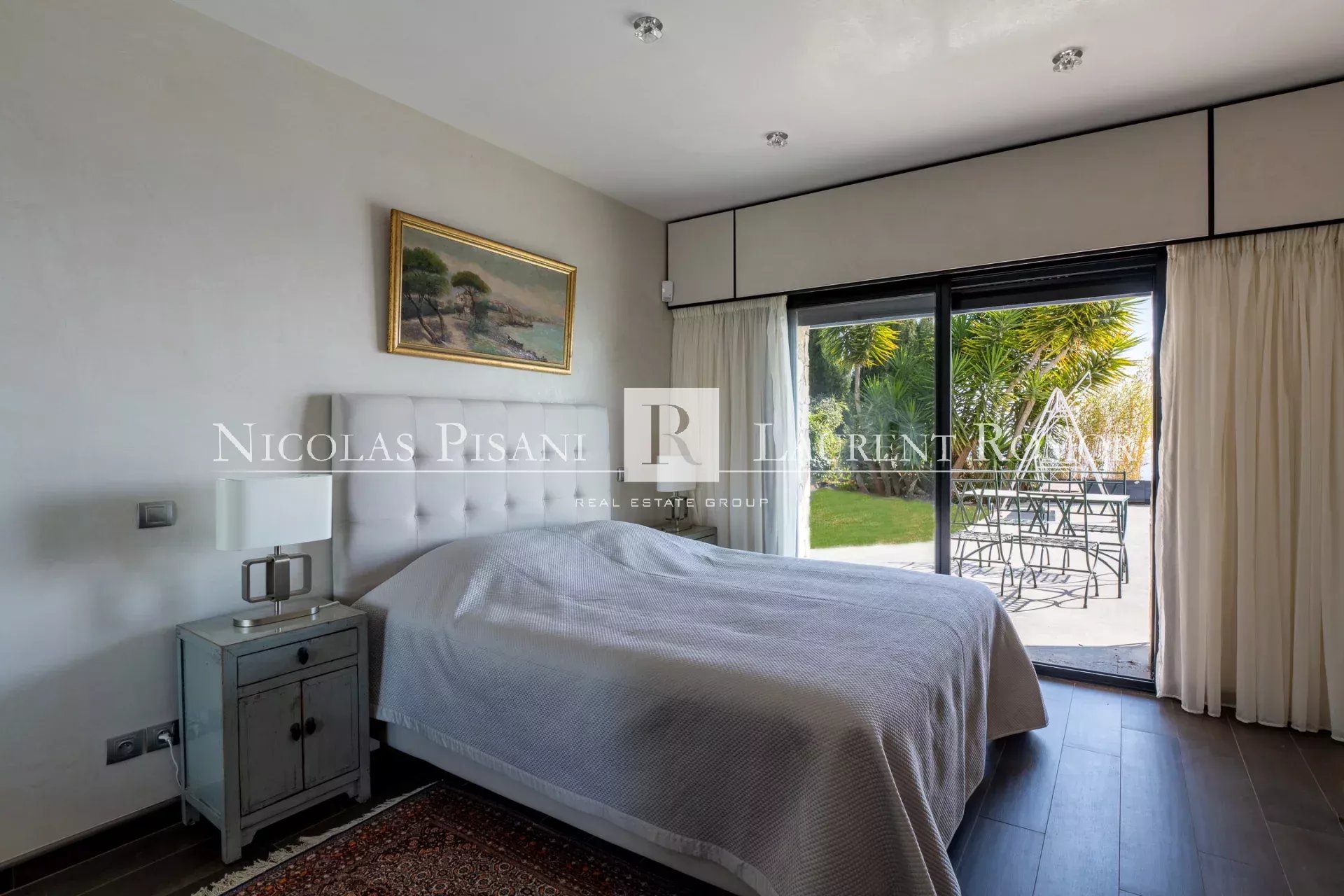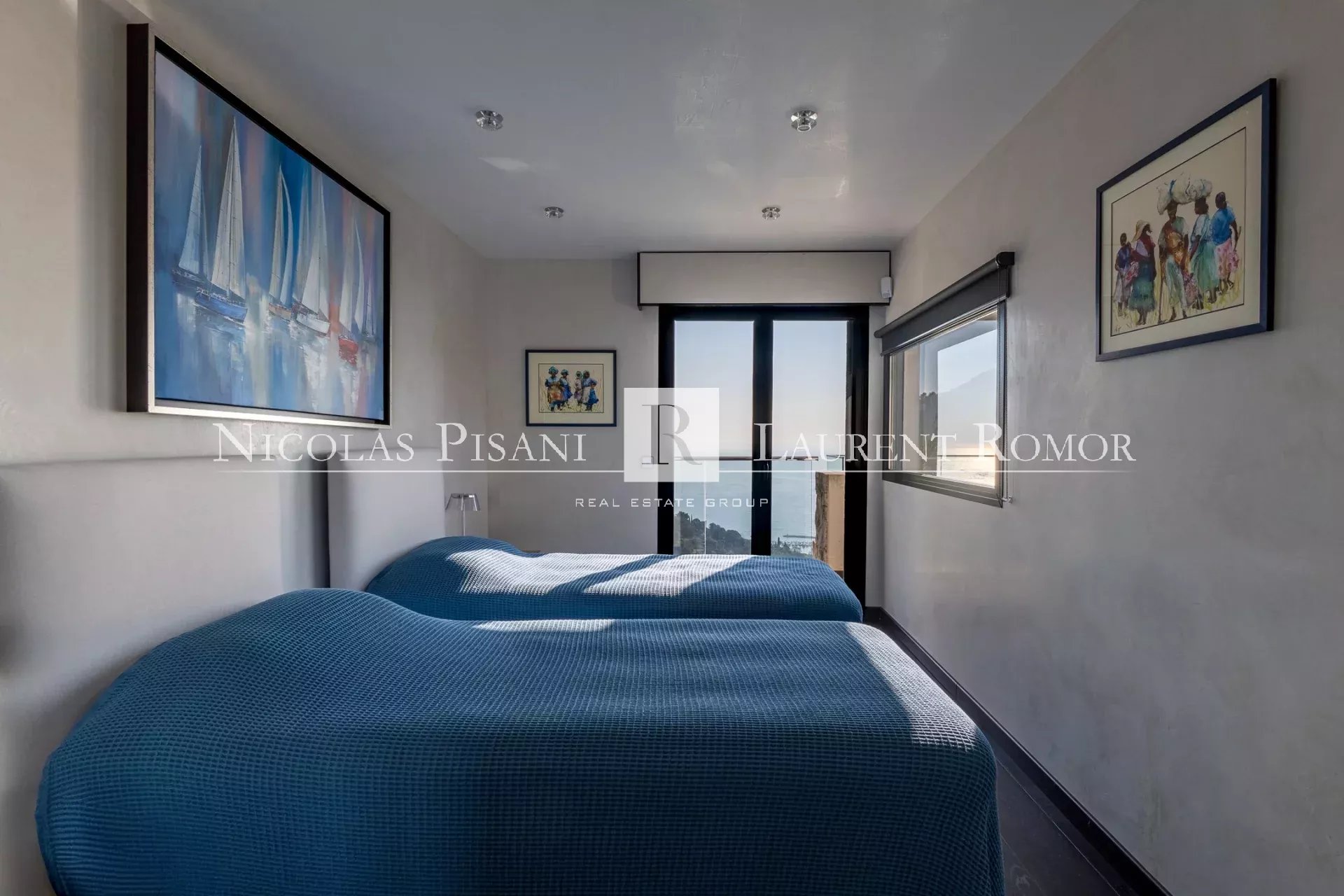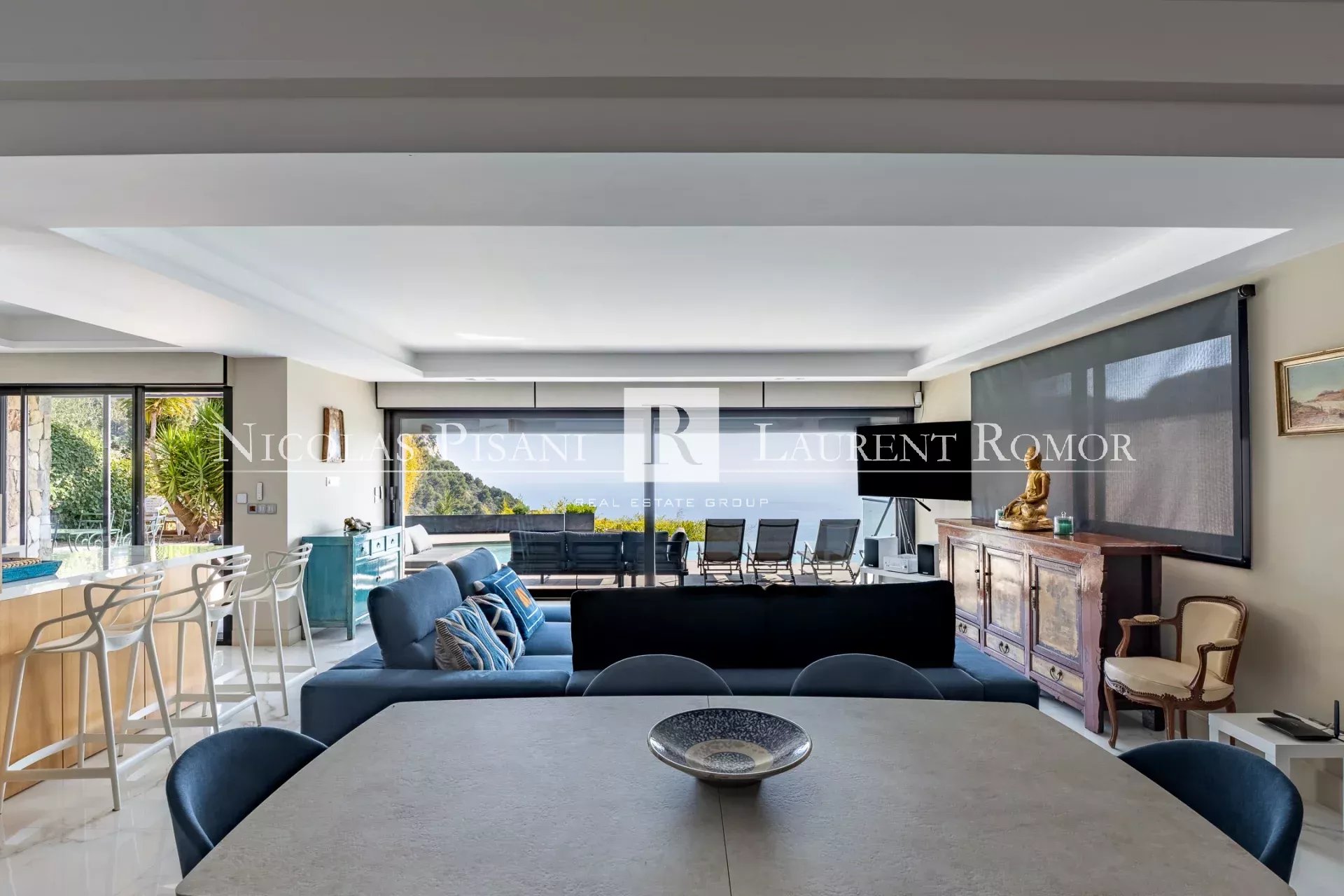 Nichée sur la colline et surplombant la mer, cette villa contemporaine est composée comme suit: un grand salon avec cuisine américaine, de vastes terrasses et une belle piscine, deux chambres et deux salles de douche. A l'étage : deux chambres et deux salles de douche Une chambre avec salle de douche à côté du home cinema et un studio d'invité . Possibilité de se garer facilement.