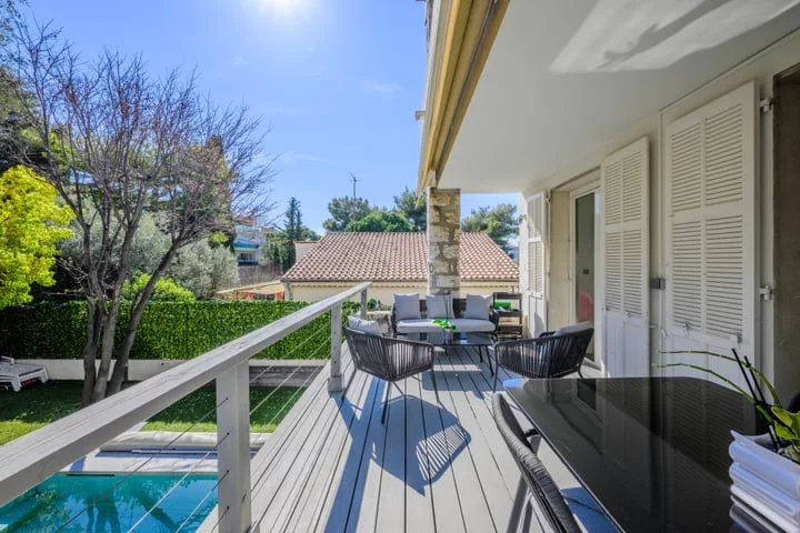 EXCLUSIVITE - Située dans l'un des quartiers les plus recherchés, cette villa indépendante vous offre un cadre de vie exceptionnel, à la fois calme et à proximité des écoles et commerces. Dans un domaine sécurisé, cette villa est un véritable havre de paix, idéal pour une grande famille. Dès l'entrée, vous serez séduit par son vaste double salon lumineux, ouvrant sur une cuisine ouverte entièrement équipée. Cette pièce de vie spacieuse s'étend vers une grande terrasse, parfaite pour des moments conviviaux, qui mène à un superbe jardin plat avec une piscine imposante. Un véritable paradis pour se détendre ou recevoir vos proches. Le rez-de-chaussée abrite également deux chambres, une salle d'eau avec water-closet. A l'étage, vous découvrirez trois chambres spacieuses, une salle d'eau avec toilettes séparées, et une superbe suite parentale avec sa propre salle de bains, offrant un véritable confort. Un immense garage en entresol et complété par une buanderie, cellier et espace rangements divers. Rénovée avec goût dans un style contemporain, cette villa allie modernité et sobriété. Elle est équipée de la climatisation gainable et du double vitrage, assurant un confort total en toute saison. Les informations complémentaires : Honoraires à la charge du vendeur. Les informations sur les risques auxquels ce bien est exposé sont disponibles sur le site Gérorisques : georisques.gouv.fr.