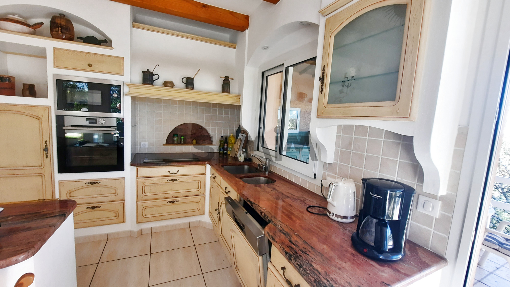 A VENDRE - TRES BELLE VILLA - SECTEUR SAINT JEAN DE CRIEULON. Dans un secteur calme et dominant cette superbe villa est complète. Un hall d'entrée avec placard donne accès à un séjour-salon, spacieux et lumineux équipé d'une cheminée avec un insert. Ensuite une cuisine américaine, entièrement équipée, avec son espace repas, sert également, par de larges baies vitrées, la terrasse en partie couverte, avec une cuisine d'été et un barbecue, un accès direct à la piscine et une vue sur le village. Toujours au RdC: une chambre ou bureau avec un placard, deux belles chambres avec chacune un lave mains et une mezzanine, une salle d'eau avec placard et des toilettes suspendues avec un lave mains, une buanderie. Un cellier complète la cuisine et donne accès au niveau inférieur. On y découvre un garage avec des WC, un lave mains et une grande pièce avec un lave mains, pouvant servir de salle de jeux ou de chambre supplémentaire. Au premier étage: Une véritable suite parentale composée d'une chambre avec sa terrasse privative bien ensoleillée, un dressing, une salle de bains et des toilettes. Une superbe piscine avec un abri de couverture et une filtration au sel, pour les moments de détente en toute tranquilité. Un local rangement atelier. Toutes les belles prestations sont là: Portail électrique, Interphone, alarme, chauffage électrique par le sol, climatisation, volets roulants électriques avec centralisation.
