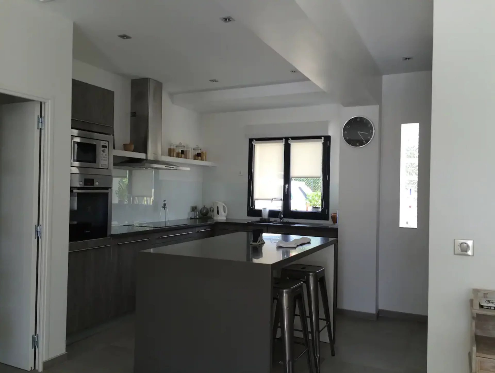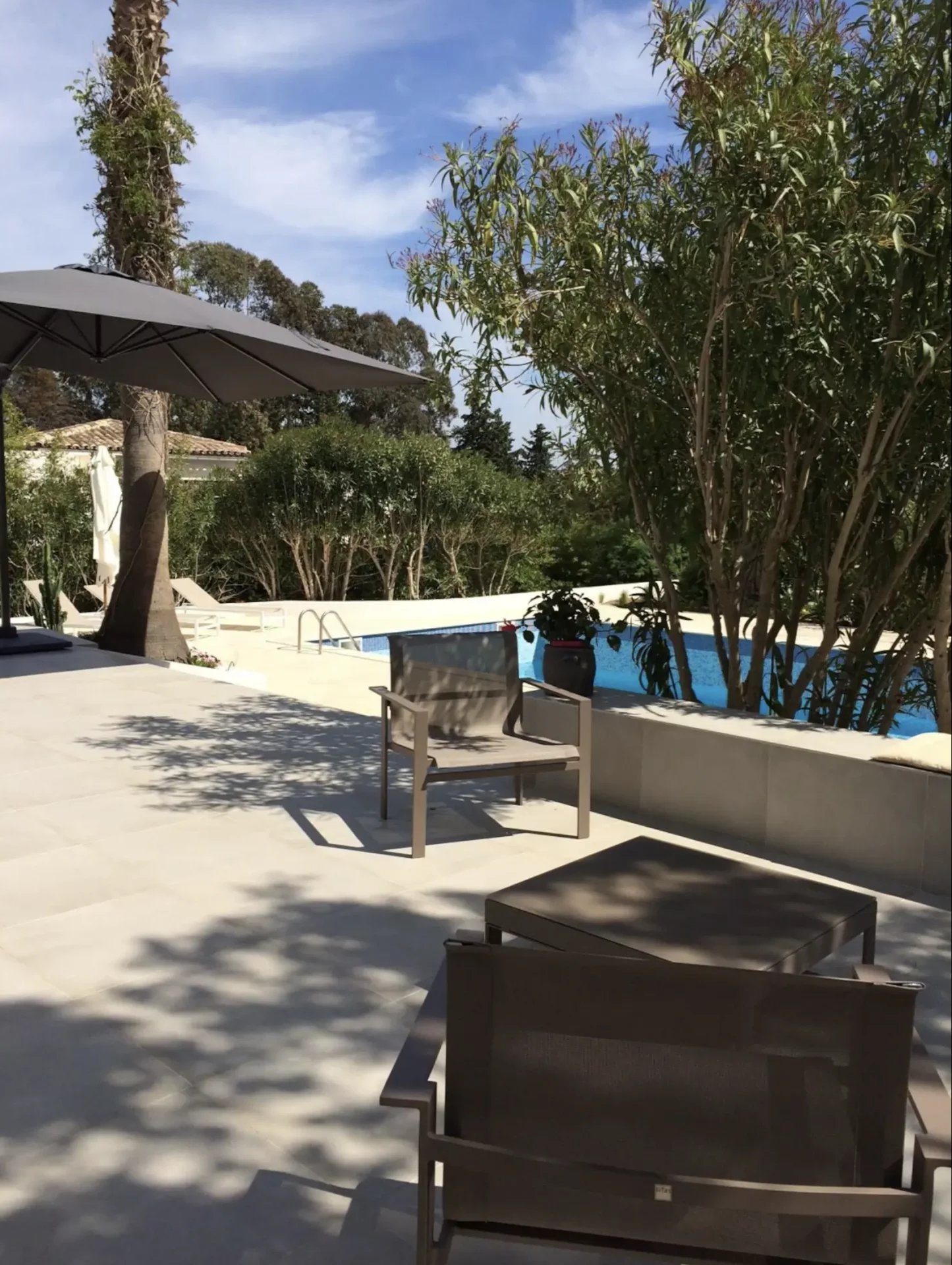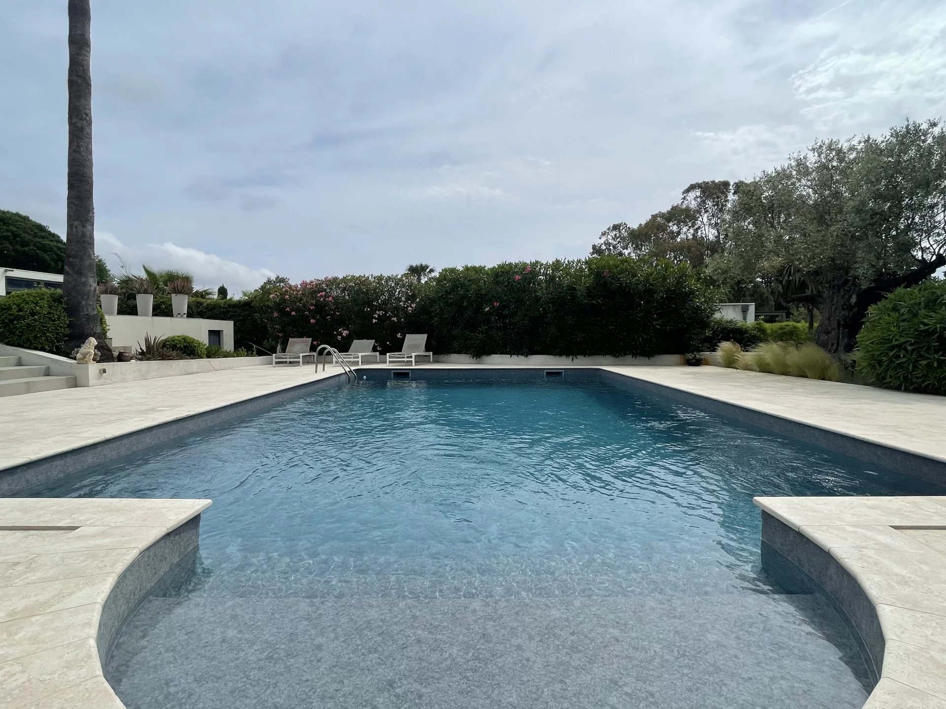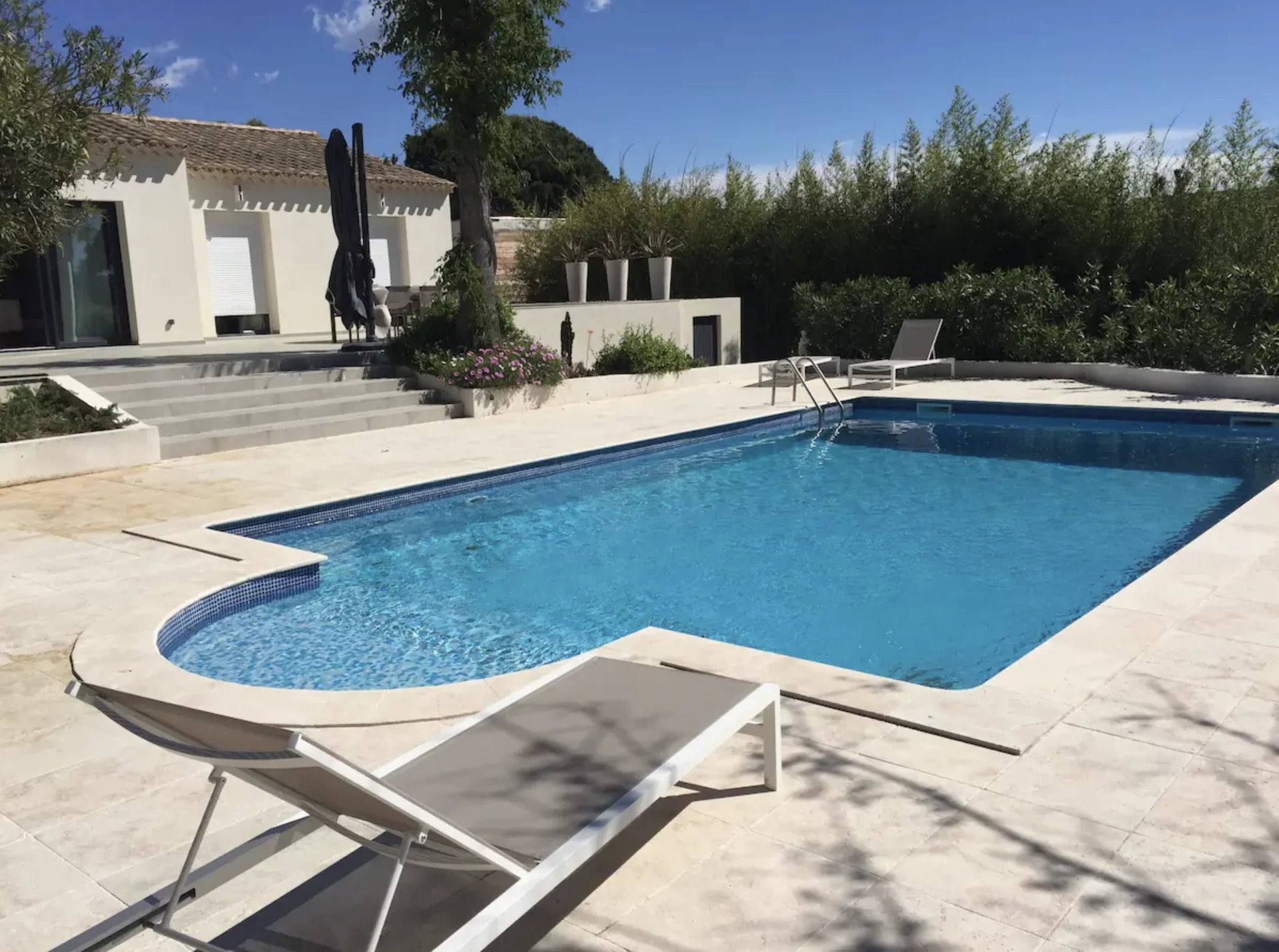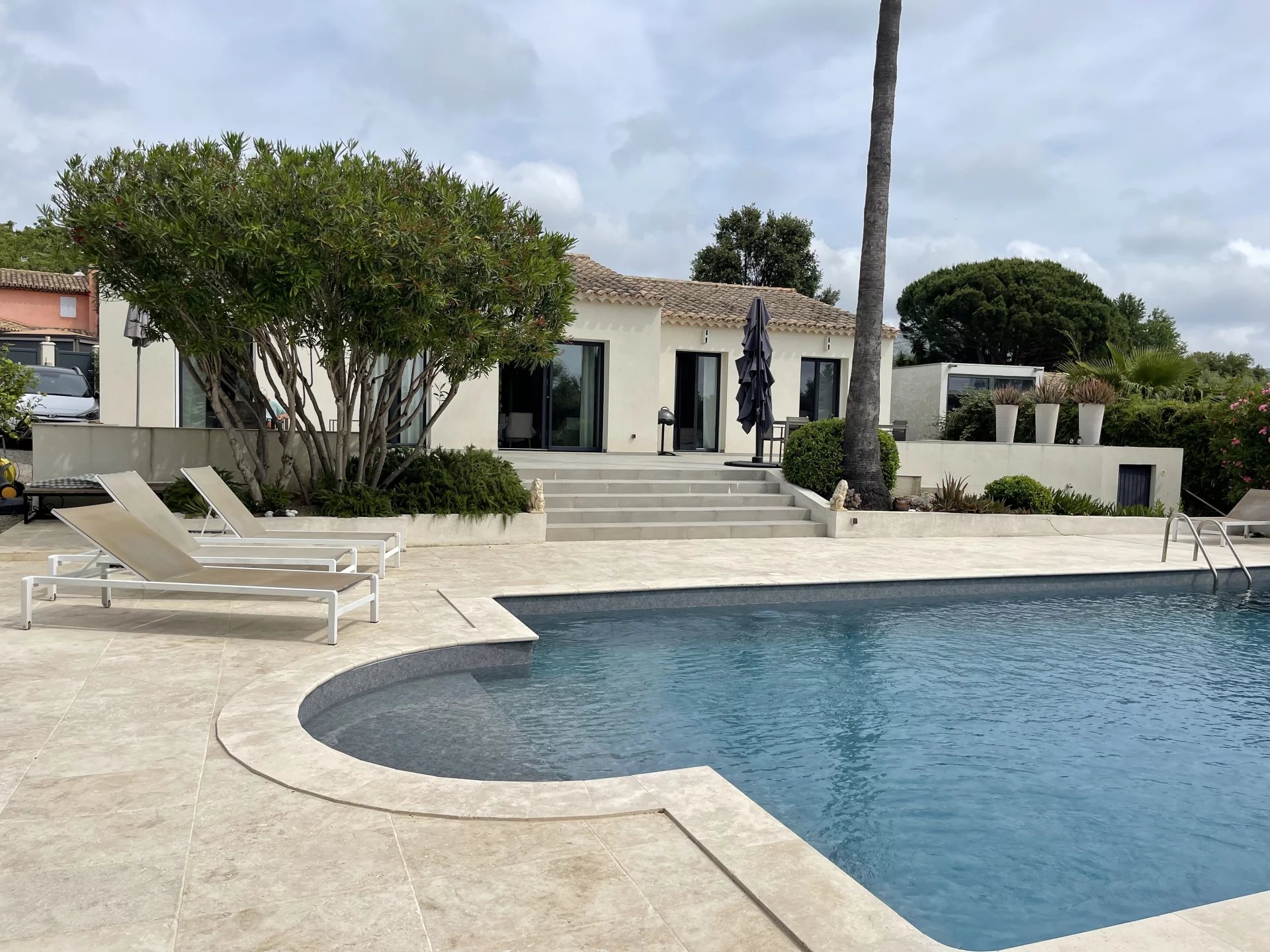 Superbe villa moderne avec grande piscine extérieure Idéal vacances : Villa de 5 pièces avec piscine (11X5) d'une surface de 130m2 sur un terrain de 1 500m2 située dans un domaine privé calme proche des commerces et plage. Elle se compose, d'une entrée, un séjour ouvrant sur une terrasse de 90m2 avec vue sur la piscine et 4 chambres dont une grande suite parentale avec douche italienne donnant sur la piscine, une salle d'eau, 2 WC séparés. La piscine vient d'être rénovée, et désormais elle est revêtue d'un superbe liner gris. Possibilité de stationner 4 véhicules. Linge non compris Wifi Séjour du samedi au samedi