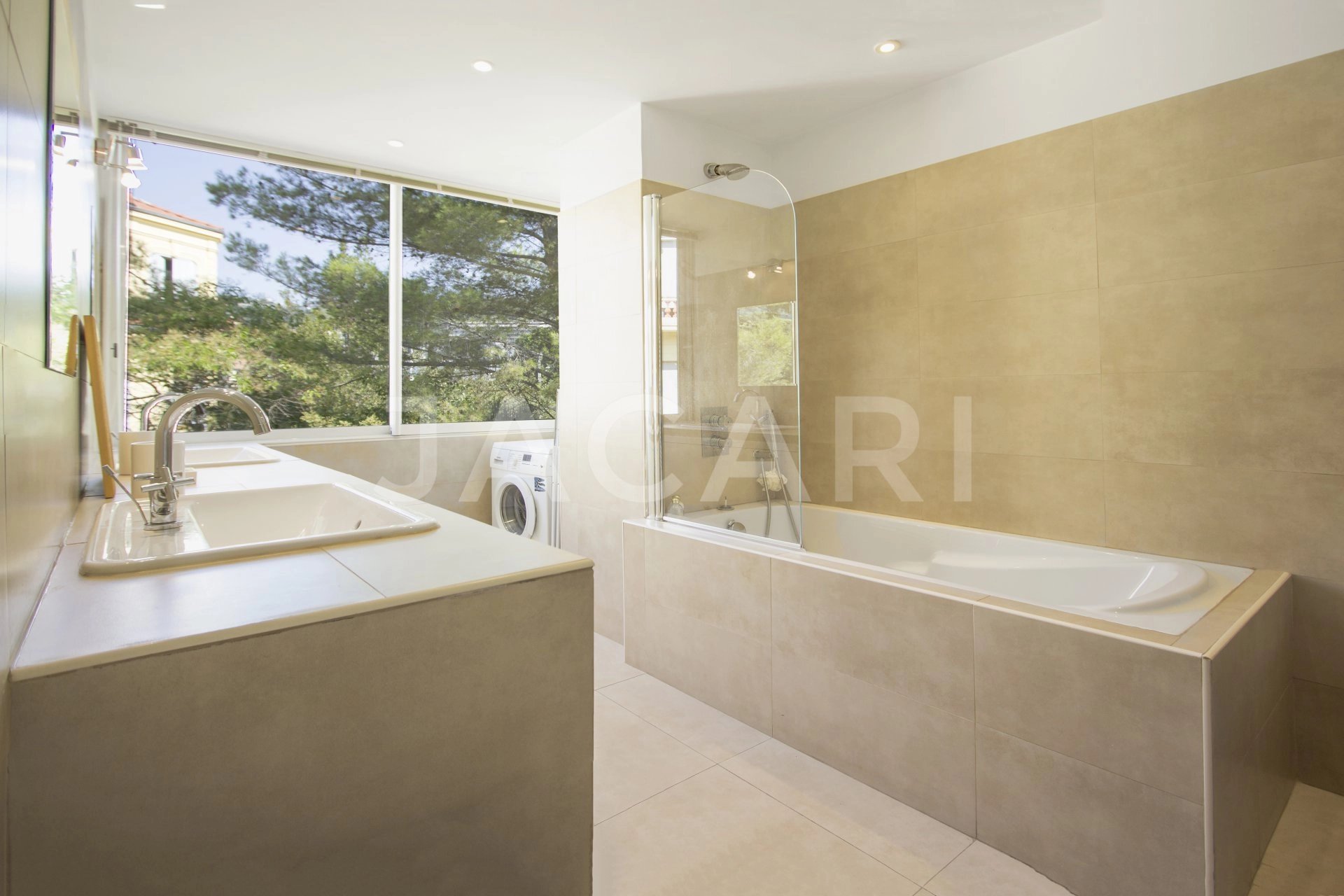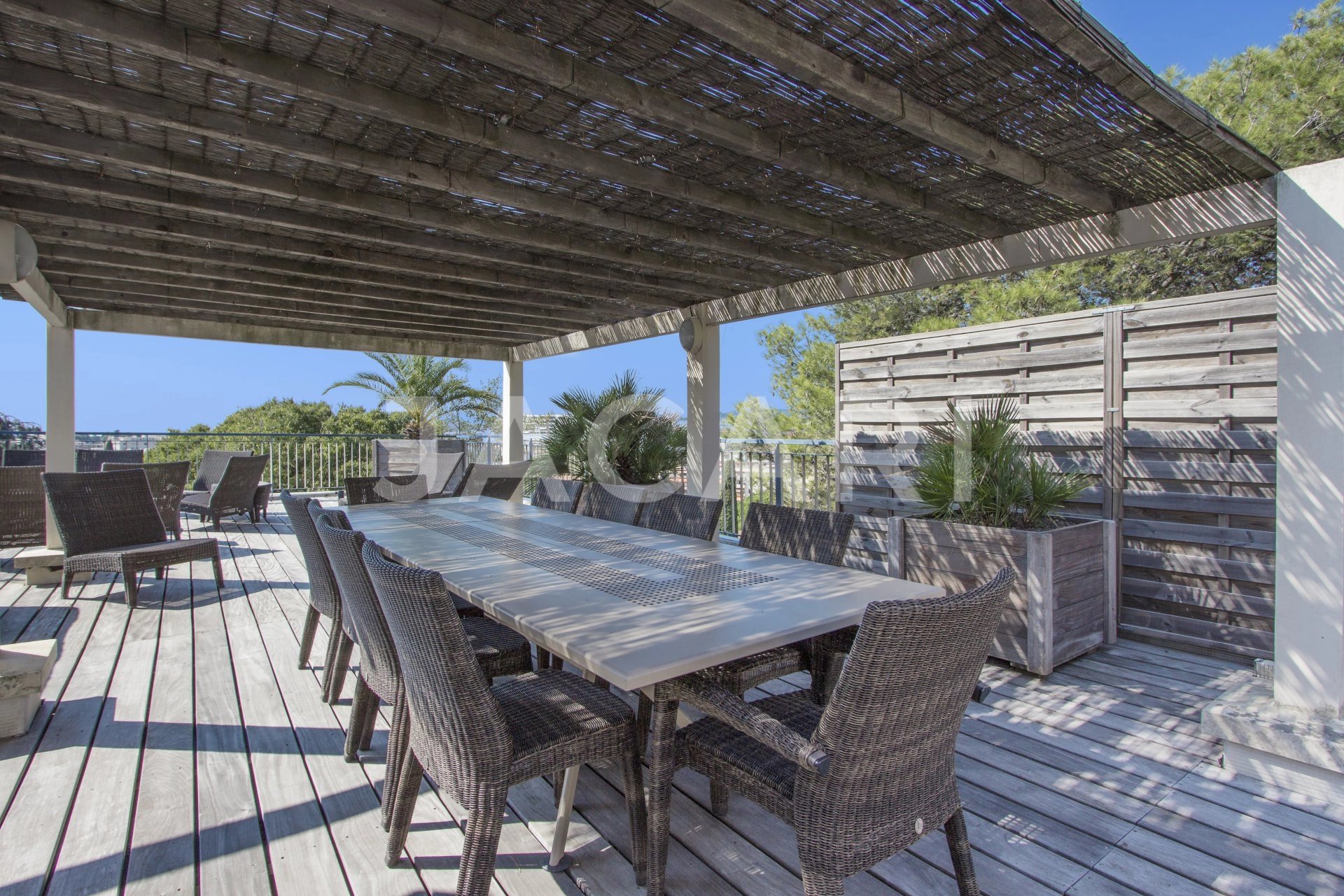 Cannes - Spacieux trois pièces d'angle traversant d'environ 120m² offrant un toit terrasse de dans une petite résidence de trois étages du quartier d'Oxford. Composé d'une entrée sur un vaste séjour de 40m² ouvrant sur une terrasse qui longe tout l'appartement, une cuisine équipée. Coté nuit chaque chambre donne sur la terrasse dont une suite avec salle de bains et une chambre invité avec salle d'eau. Ainsi qu'une superbe terrasse sur le toit de 160m² avec jacuzzi offrant une jolie vue. Votre contact : Kevin Bourgeois 06 47 79 35 79