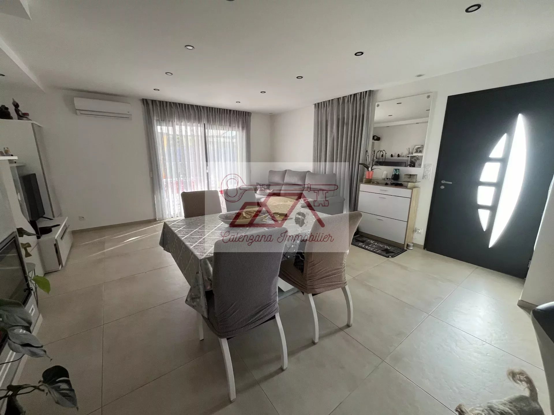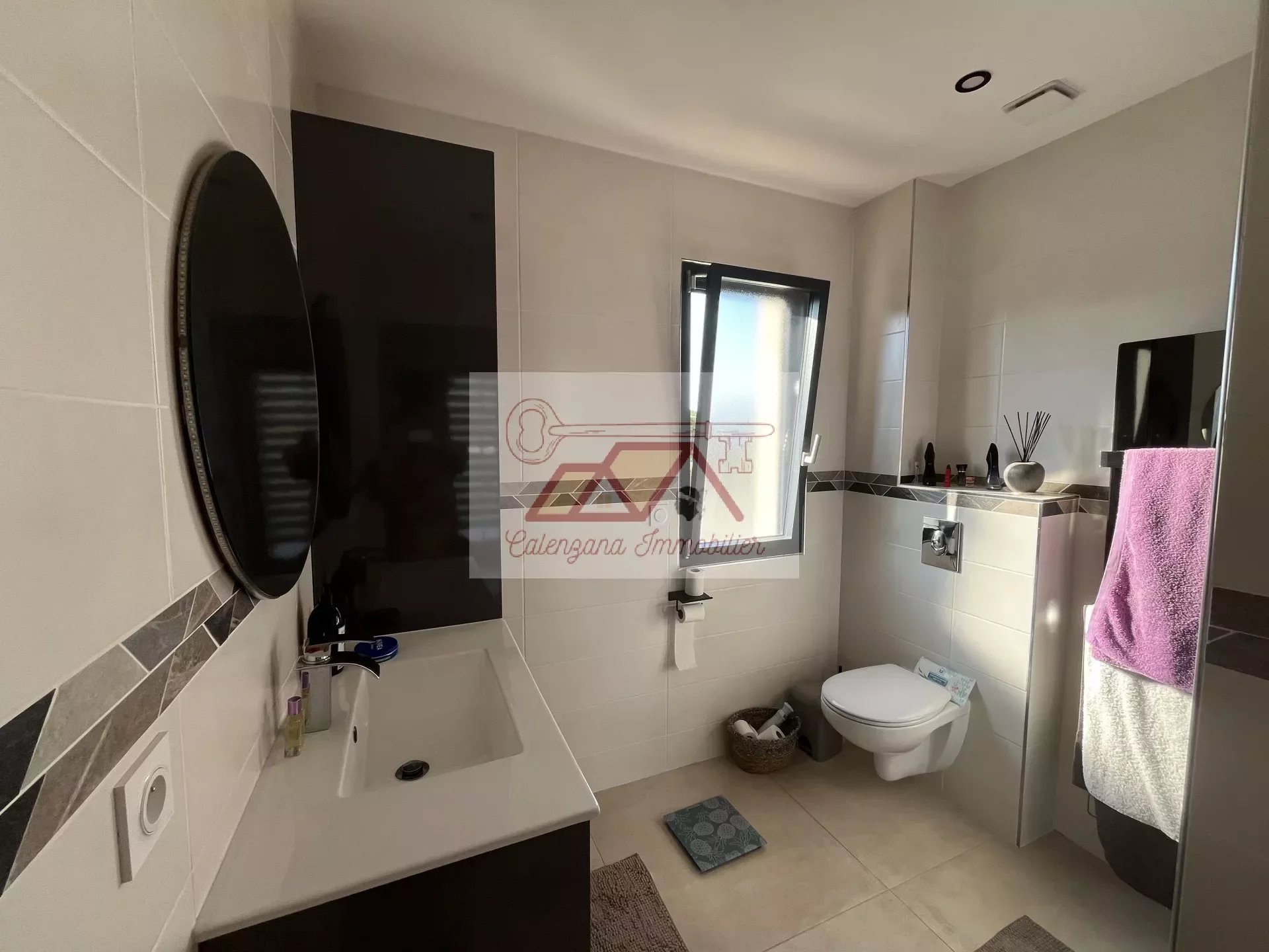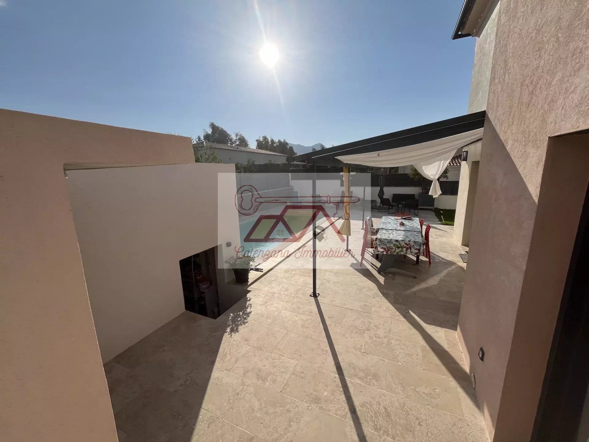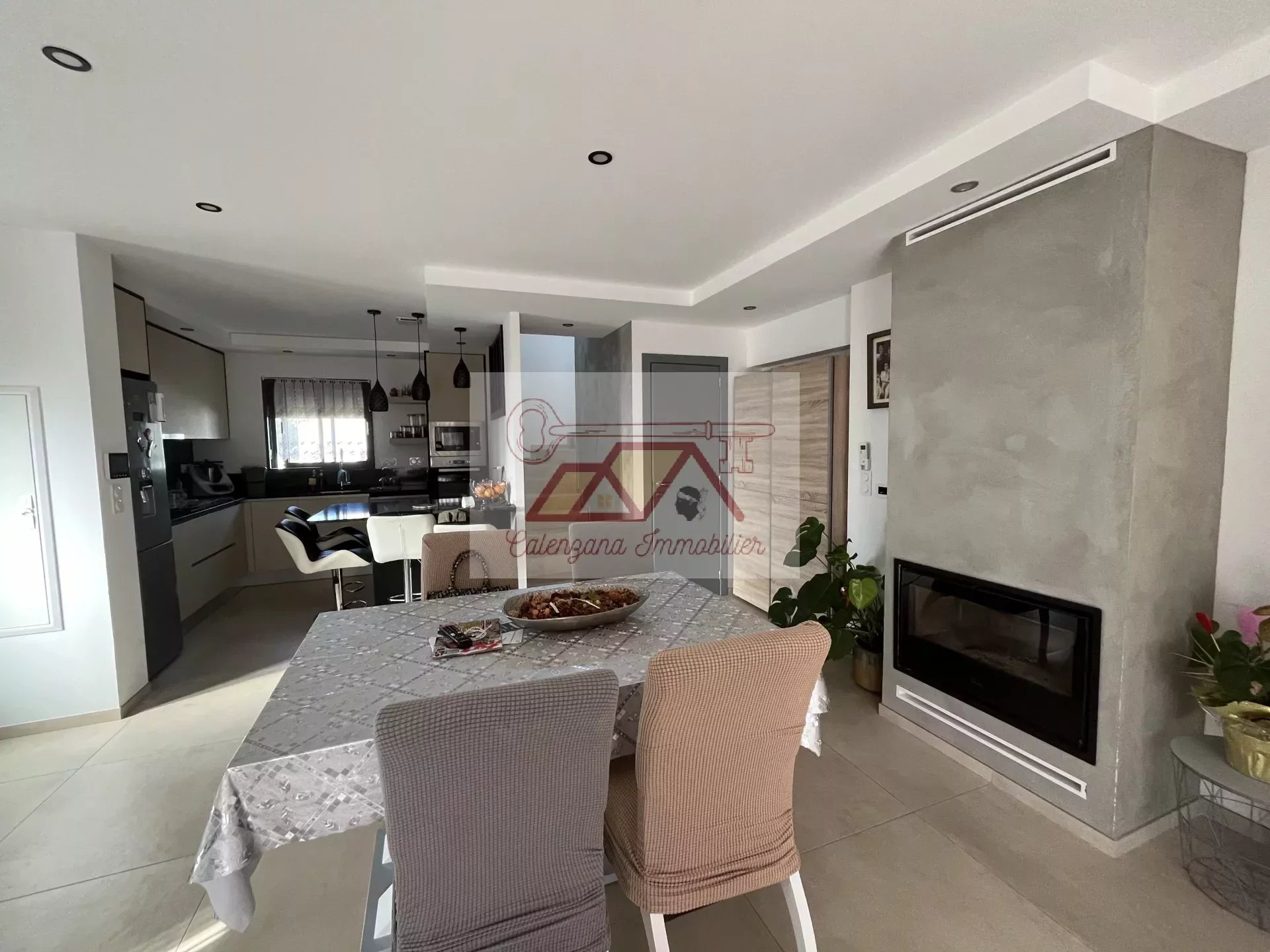 Cette villa récente à Calenzana offre un cadre de vie paisible, à proximité de la mer, des montagnes et de l'aéroport de Calvi. Le rez-de-chaussée comprend un grand salon lumineux avec baies vitrées, une cuisine américaine moderne, un WC séparé et un accès direct à la terrasse et à la piscine. Un T2 indépendant, aménagé à partir de l'ancien garage, propose un espace de vie autonome avec salle de bain et WC. À l'étage, deux chambres spacieuses donnent sur une grande terrasse de 36 m² avec vue sur la montagne et la mer.