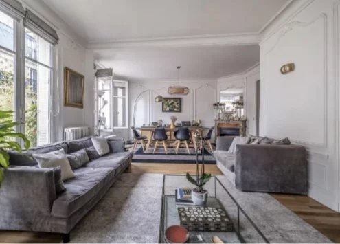 Charme de l'ancien avec parquet, moulures et cheminée.