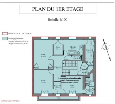 Au 1er étage : 4 bureaux, 3 rangements, dégagement, salle de bains, salle d’eau avec WC, WC séparés. Balcon.