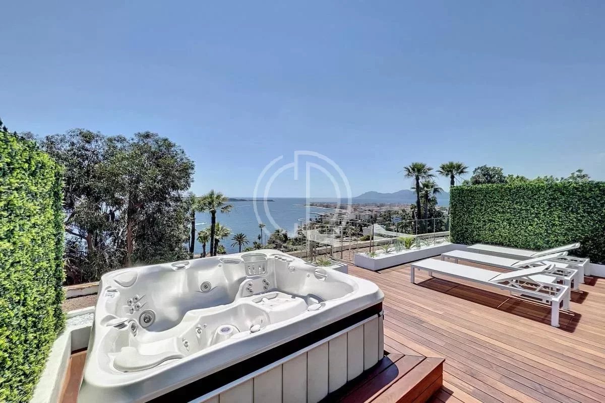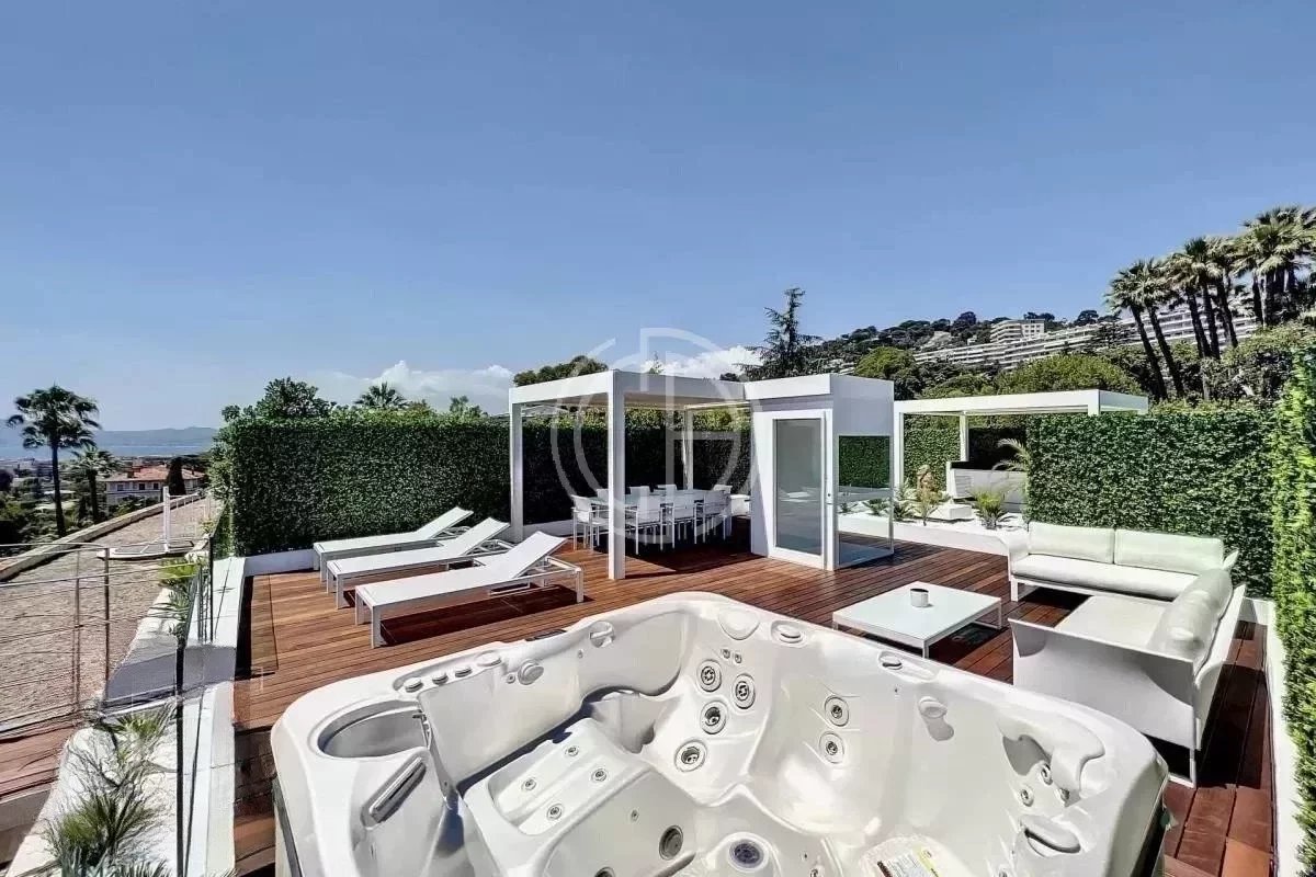 Grand appartement traversant de 143 m2 composé de 4 pièces avec un superbe roof top, situé au 6éme et dernier étage d’une résidence de standing avec gardien, disposant d’une piscine, d’une vue mer et jardin, idéalement situé dans le quartier très prisé de la Californie. L’appartement est composé d’une grande pièce de vie de 68m2, de 3 chambres et de 3 salles de bains. Une belle terrasse de 24m2 face à la mer, un balcon au Nord de 3,4 m2 ainsi qu’un superbe toit terrasse de 144m2 desservie par un ascenseur privé, avec une terrasse en bois exotique, une cuisine d’été et son jacuzzi, un salon d'été avec pergola, offrant une vue offrant une vue sur la baie de Cannes jusqu'aux îles de Lérins et les lumières de la ville. Le tout entièrement rénové avec prestations et matériaux de très haute qualité. Le bien est vendu avec 2 garages en sous sol de la résidence et une cave. Les informations sur les risques auxquels ce bien est exposé sont disponibles sur le site www.georisques.gouv.fr TRACFIN : Conformément à l'Article L561.5 du Code Monétaire et financier, pour l'organisation de toute visite, la présentation d'une pièce d'identité vous sera demandée.