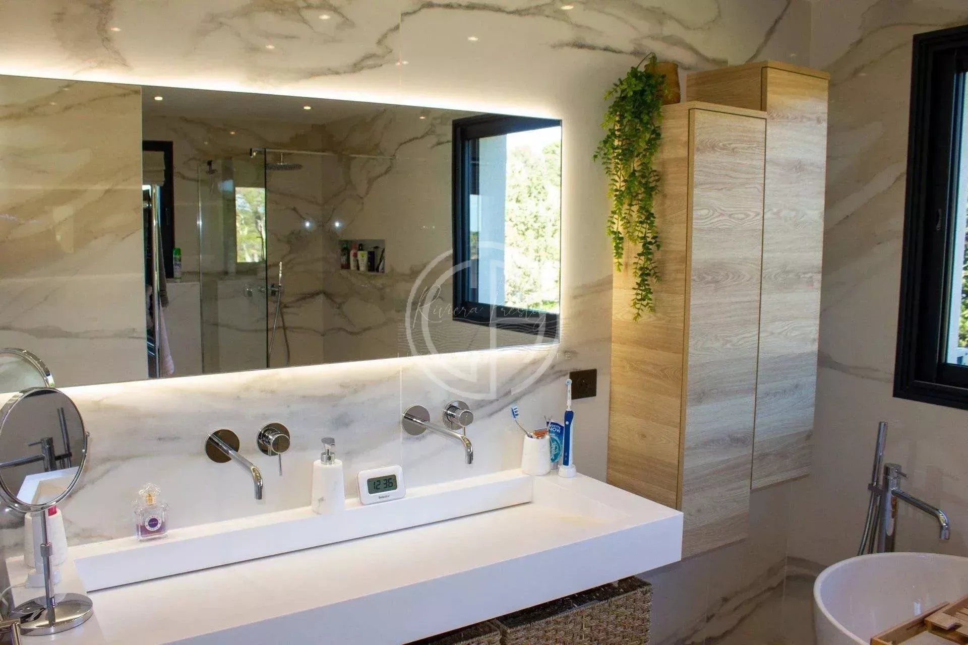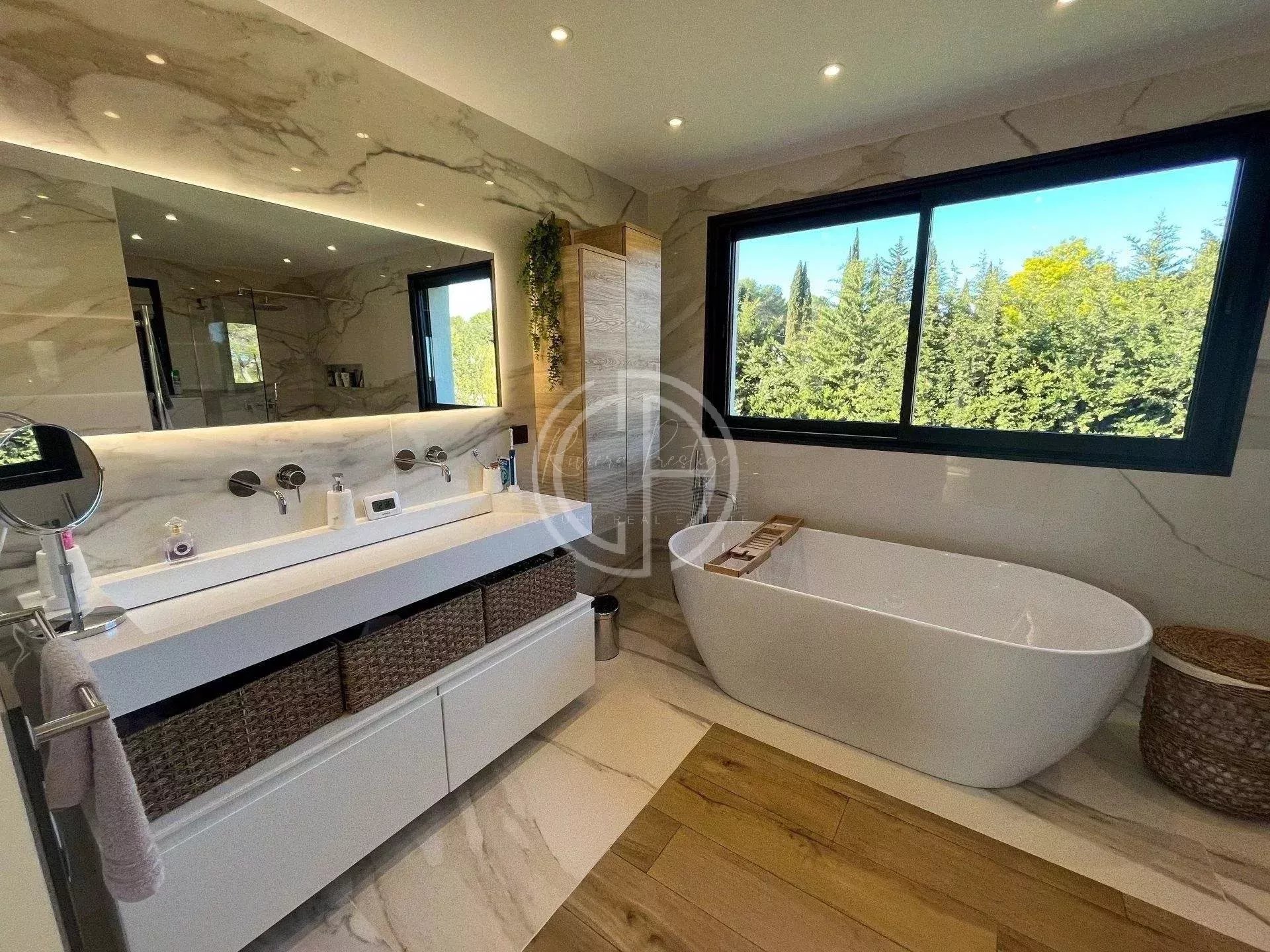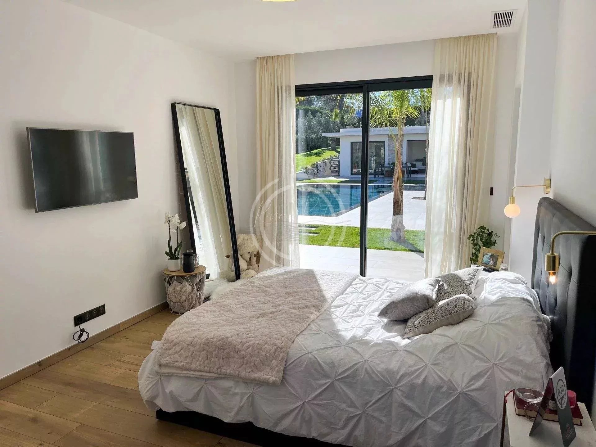 Située dans l'un des quartiers les plus résidentiel de Mougins, à proximité immédiate des parcs de Mougins, du hameau du Guillet et de l'étang de Font merle, cette villa permet un accès très facile et très rapide pour rejoindre Cannes et sa mythique Croisette. Elle se compose d’un grand salon salle à manger avec une cuisine ouverte entièrement équipée, quatre belles chambres en suite dont une grande suite parentale avec dressing et salle de bains, d'un très grand garage et d'un espace pouvant être aménagé en studio indépendant ,salle de sport, salle cinéma ou salle de jeux. De plus, un espace pool-house avec une 5ème chambre La Villa est entourée d’un beau jardin paysagé avec ses 23 oliviers. Elle dispose également d’une piscine miroir. Nombreux stationnements. Équipée de la dernière technologie domotique, elle bénéficie également de toutes les dernières normes de construction.
