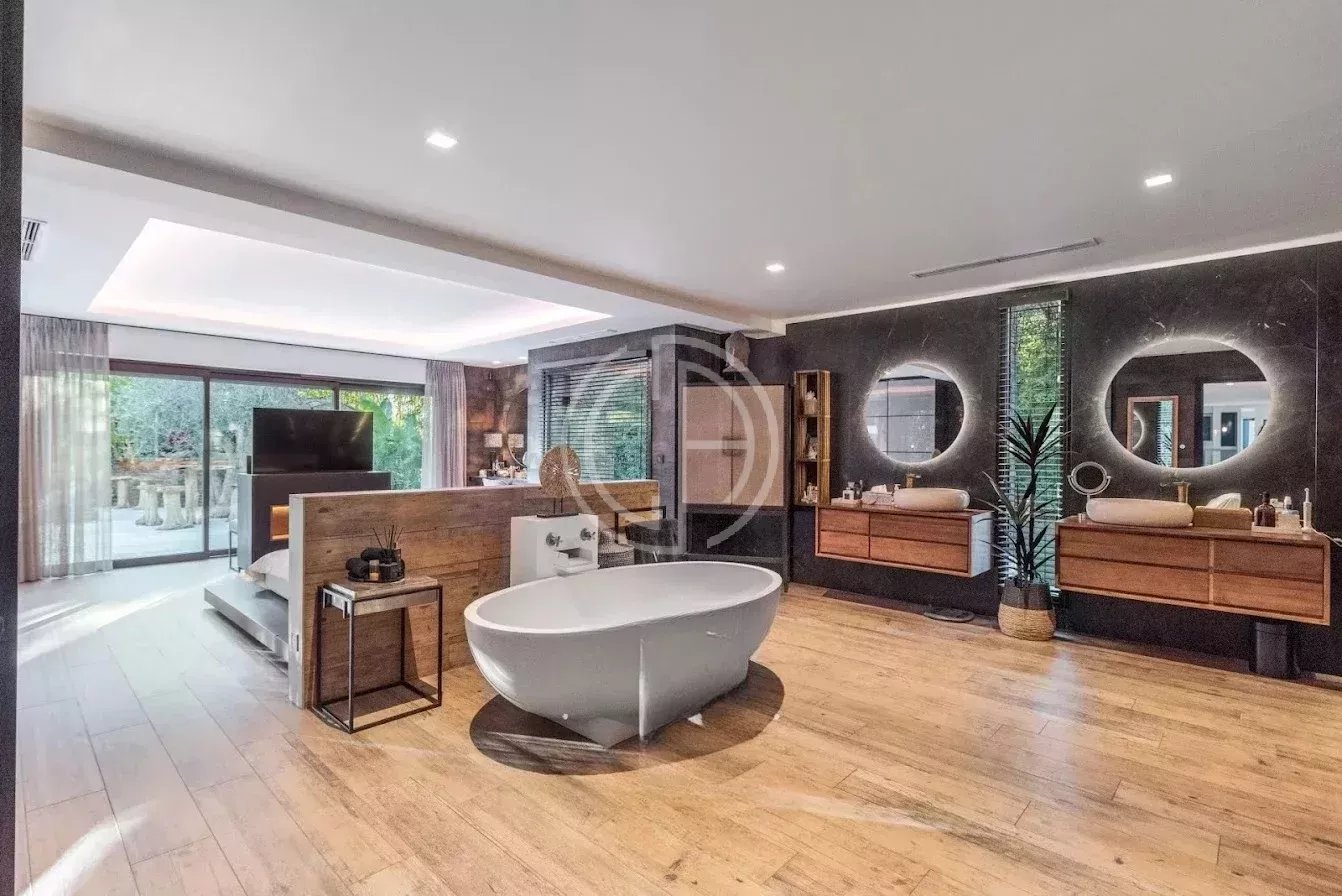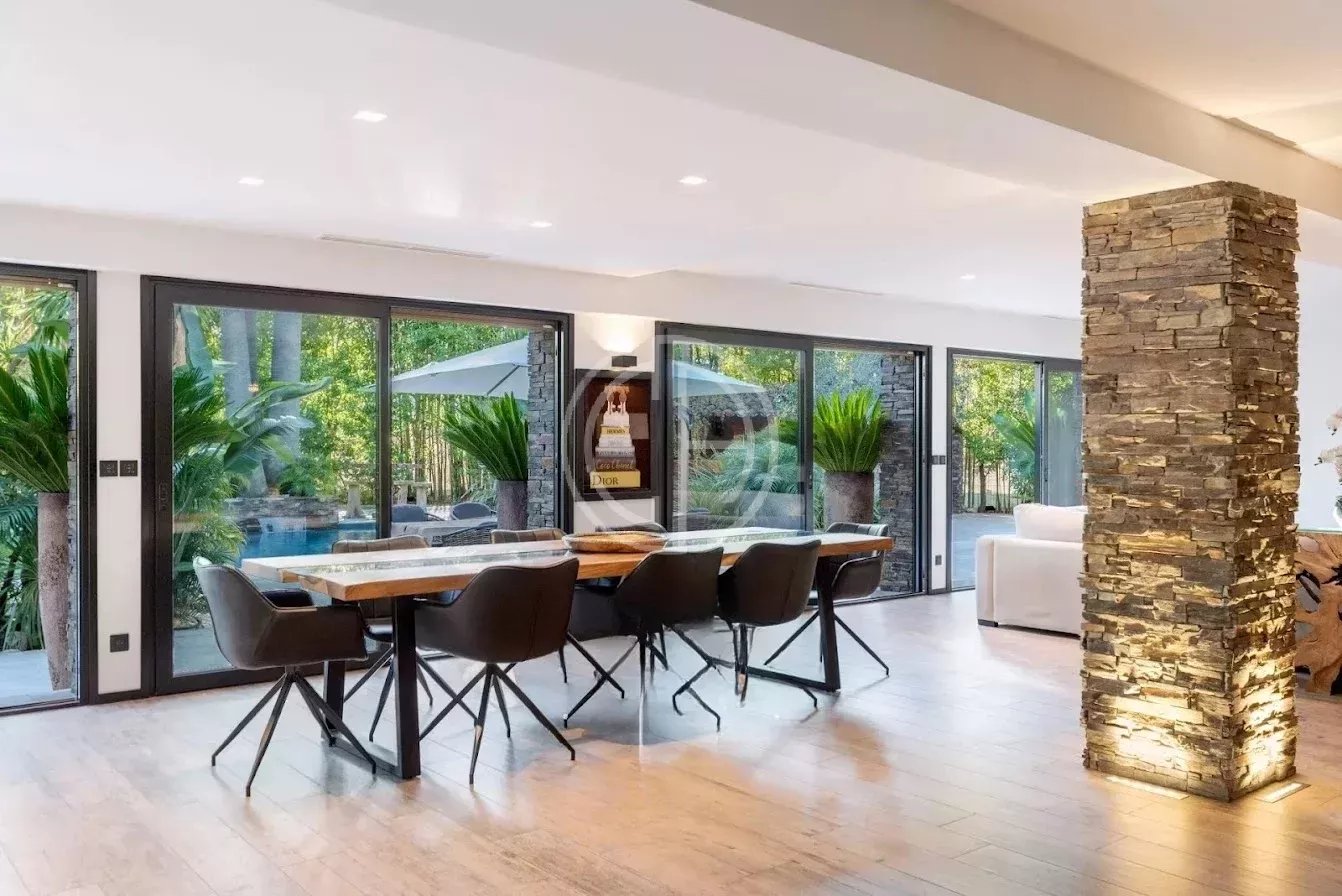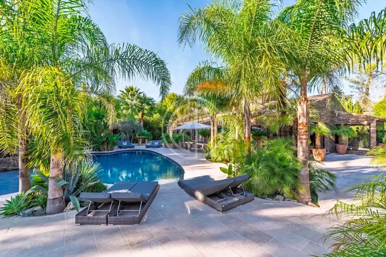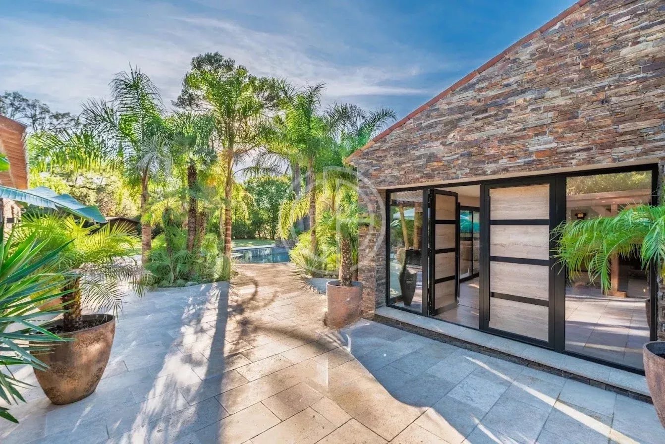 Située dans un quartier résidentiel prisé de Mougins, cette villa offre un véritable havre de paix au coeur d'un environnement verdoyant et parfaitement entretenu. Quasiment de plain-pied, la propriété se distingue par son atmosphère sereine et son superbe jardin paysagé, véritable oasis de verdure et d'intimité. La maison principale accueille un vaste séjour baigné de lumière, ouvert sur les terrasses et les espaces extérieurs. La propriété dispose de six chambres en suite, dont une chambre indépendante au fond du jardin, idéale pour recevoir amis, famille, ou pour loger un gardien ou une nounou. Pensée pour le bien-être et la détente, la villa bénéficie de deux piscines, intérieure et extérieure, d'un espace spa avec sauna, ainsi que d'un pool house parfaitement équipé. Un carport et plusieurs places de stationnement complètent le bien. Classe énergie : A - Classe climat : A / Montant estimé des dépenses annuelles d'énergie pour un usage standard : entre 1 384 € et 1 872 € (année de référence 2021). Annexe : Classe énergie : C - Classe climat : A / Montant estimé des dépenses annuelles d'énergie pour un usage standard : entre 773 € et 1 045 € (année de référence 2021). Les informations sur les risques auxquels ce bien est exposé sont disponibles sur le site Géorisques : www.georisques.gouv.fr Bien situé dans une zone soumise à l'obligation de débroussaillement.