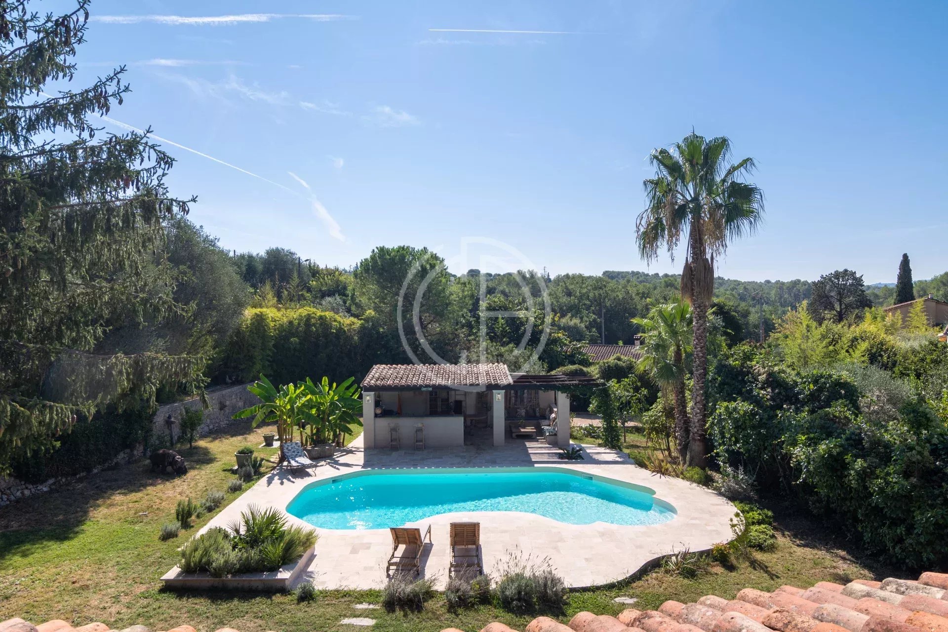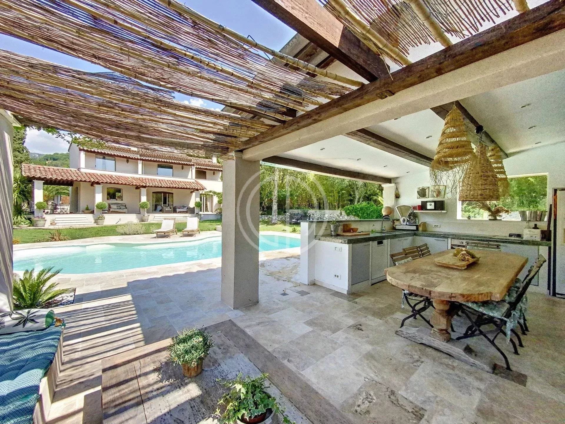 Située à proximité de MOUANS SARTOUX, cette villa se trouve dans un secteur résidentiel paisible. Cette villa rénovée de 240m2 avec des prestations de qualité est parfaite pour les amateurs de charme et de sérénité, Exposée plein Sud, elle offre des beaux espaces de vie avec un salon cheminée ouvert sur la terrasse, salle à manger, spacieuse cuisine équipée, buanderie, coin bureau. A l'étage, l'espace nuit offre 3 grandes chambres en suite. En rez-de-jardin, un appartement indépendant pour les invités. L'espace piscine et son pool-house avec cuisine d'été équipée, la pergola permettent de profiter de la quiétude des lieux selon les différents moments de la journée. Calme absolu. En complément: abri 2 voitures et plusieurs places de parking, baies à galandage, climatisation, chauffage au sol... Un beau terrain plat de 1816m2 ensoleillé et complanté ravira toute la famille. Les informations sur les risques auxquels ce bien est exposé sont disponibles sur le site www.georisques.gouv.fr