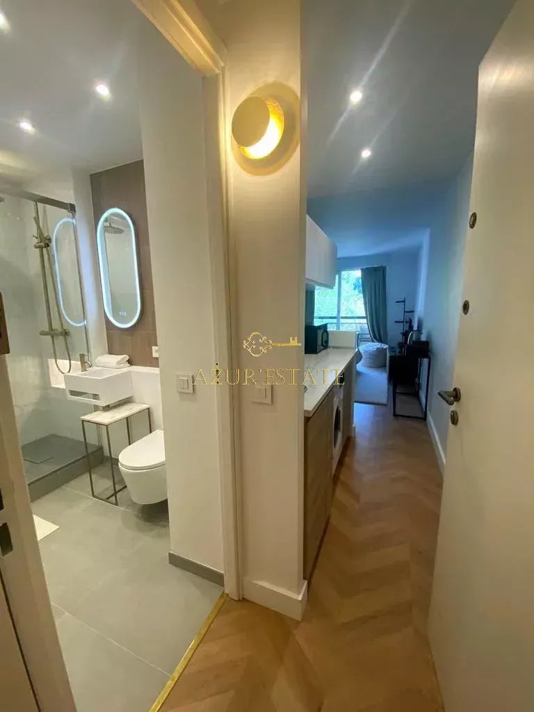 Situé à 15 minutes à pieds de la Tour Odéon et du quartier Saint Roman, dans une résidence de standing disposant d'une piscine, d'un concierge et d'une laverie commune, appartement au 3ème étage bénéficiant d'une loggia exposée sud-est avec vue dégagée sur les collines et la mer, studio entiérement rénové qui se compose d'une entrée avec kitchenette aménagée, d'une pièce de vie avec placard donnant sur la loggia, d'une salle d'eau avec WC et d'une cave. Possibilité d'acquérir une place de parking dans la résidence. Un parking public payant au bas de la résidence avec tarif préférentiel pour les résidents et présence d'une supérette. Bien soumis à la copropriété.