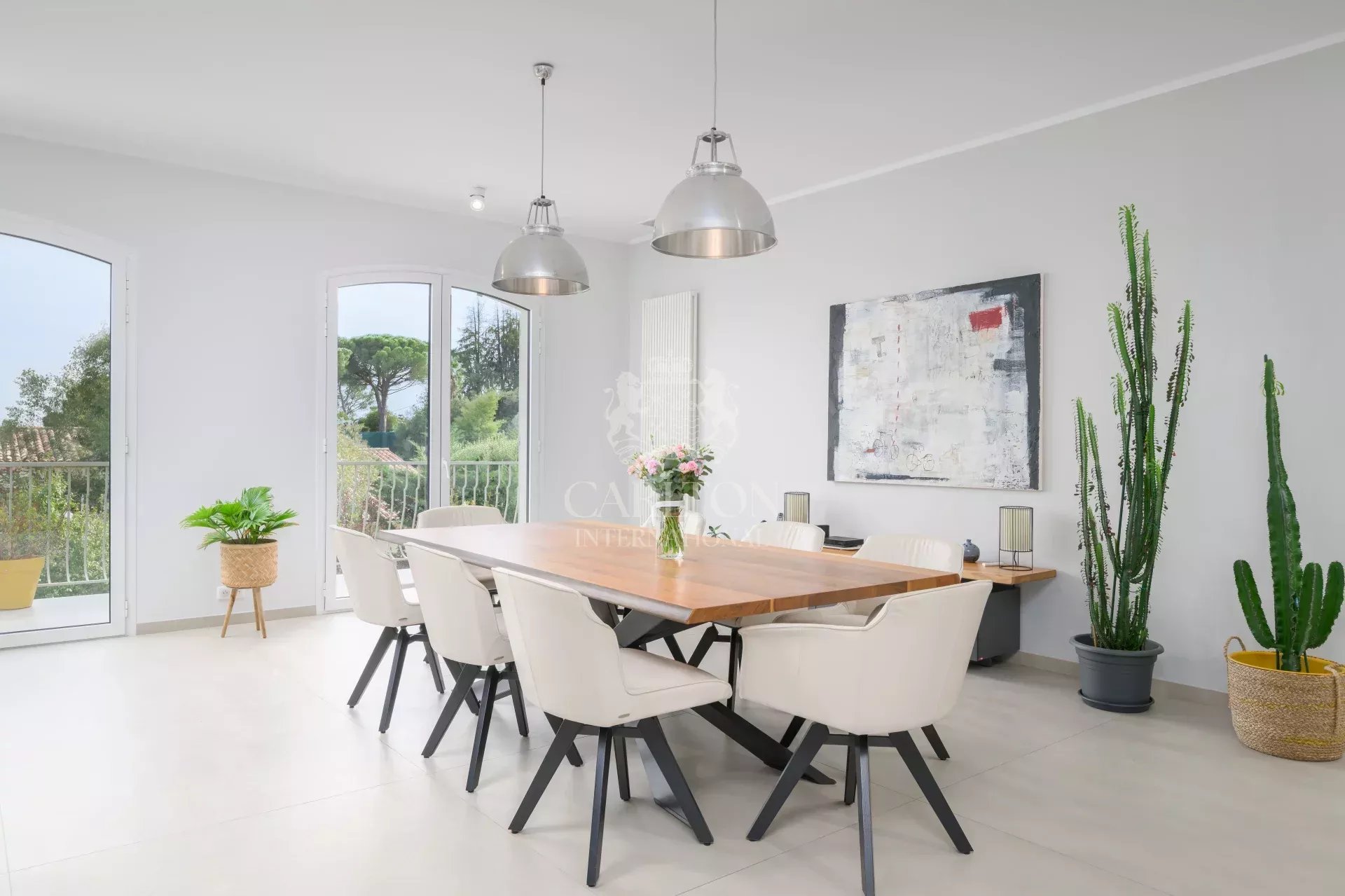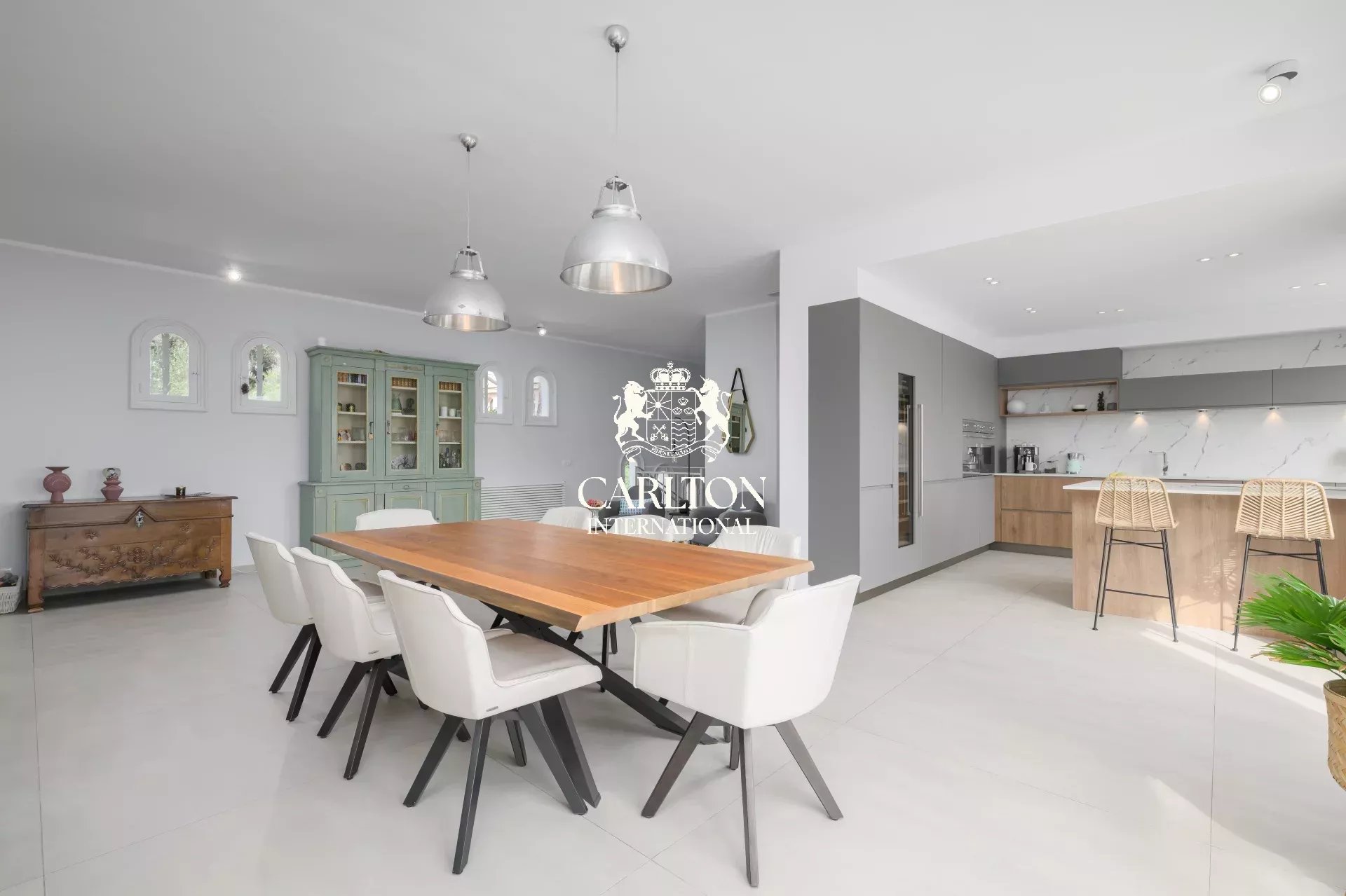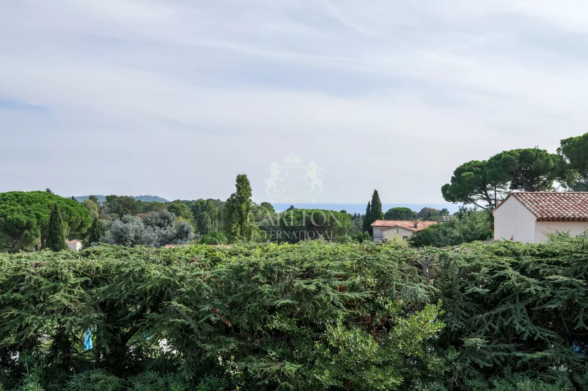 Découvrez cette sublime villa d'environ 260m2 située en position dominante avec une vue mer époustouflante. Nichée sur un terrain plat de 2500 m² dans un environnement calme. cette propriété offre un cadre de vie idyllique à proximité de toutes les commodités essentielles. L'intérieur. entièrement rénové avec des matériaux de haute qualité. comprend un triple espace de vie composé d'une cuisine moderne. d'un vaste salon lumineux et d'une grande salle à manger d'où vous pourrez admirer la mer. La suite principale et sa terrasse privée se situent au même niveau et offrent également une jolie vue sur la Méditerranée. Le rez-de-jardin comprend quatre chambres avec balcon. trois salles d'eau. et de multiples espaces de rangement dont des dressings et une buanderie. -- À l'extérieur. la propriété se distingue par sa grande piscine en mosaïques et son magnifique pool house avec cuisine d'été toute équipée. Un espace parfait pour des moments de convivialité. La dépendance apporte de la surface supplémentaire. elle est facilement aménageable en salle de sport. grand bureau. ou studio indépendant. Un double carport avec prise pour voiture électrique. une cave et un abri de jardin complètent ce bien et vous apportera tout le confort nécessaire. Cette propriété. idéalement située à quelques minutes de Mougins et de Cannes. représente une parfaite maison de famille alliant charme. modernité et fonctionnalité dans un environnement naturellement beau et paisible. Les dépenses énergétiques moyennes en 2021 se situent entre 4 970€ et 6 724€ par an. Les honoraires de l'agence sont à la charge du vendeur. Les informations sur les risques auxquels ce bien est exposé sont disponibles sur le site Géorisques http://www.georisques.gouv.fr