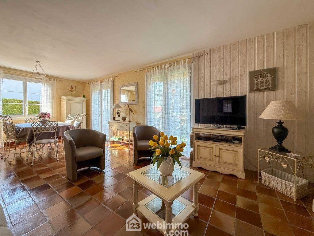 La maison est organisée en demi-niveaux, ce qui lui donne du charme et une bonne séparation des espaces. En rez-de-jardin, on découvre une cuisine indépendante entièrement équipée, ouverte sur la terrasse, ainsi qu'un salon-séjour lumineux de 30 m² avec une cheminée à foyer ouvert. Cet espace de vie est agréable et bien orienté, avec de grandes portes-fenêtres au sud qui apportent beaucoup de lumière.