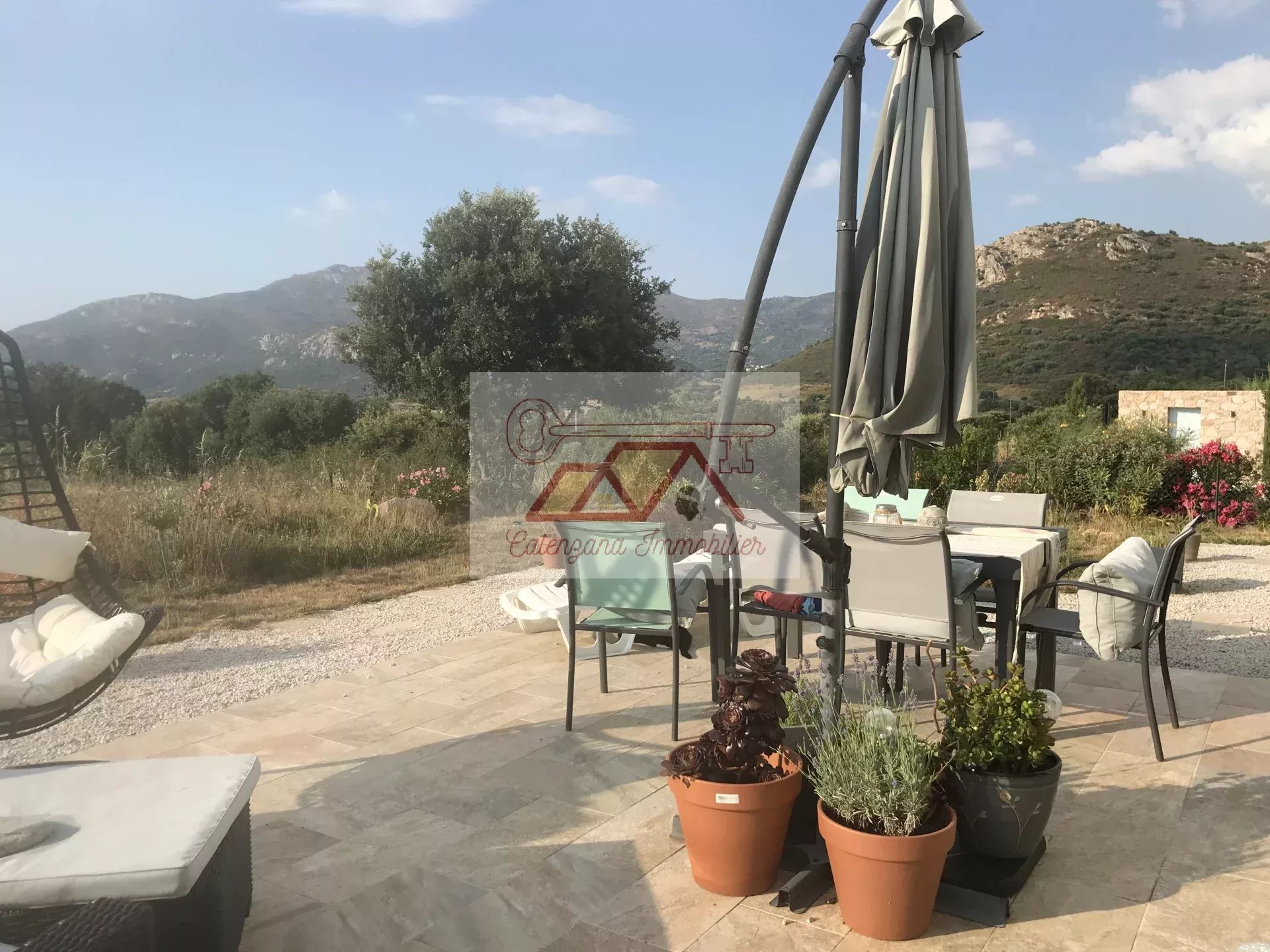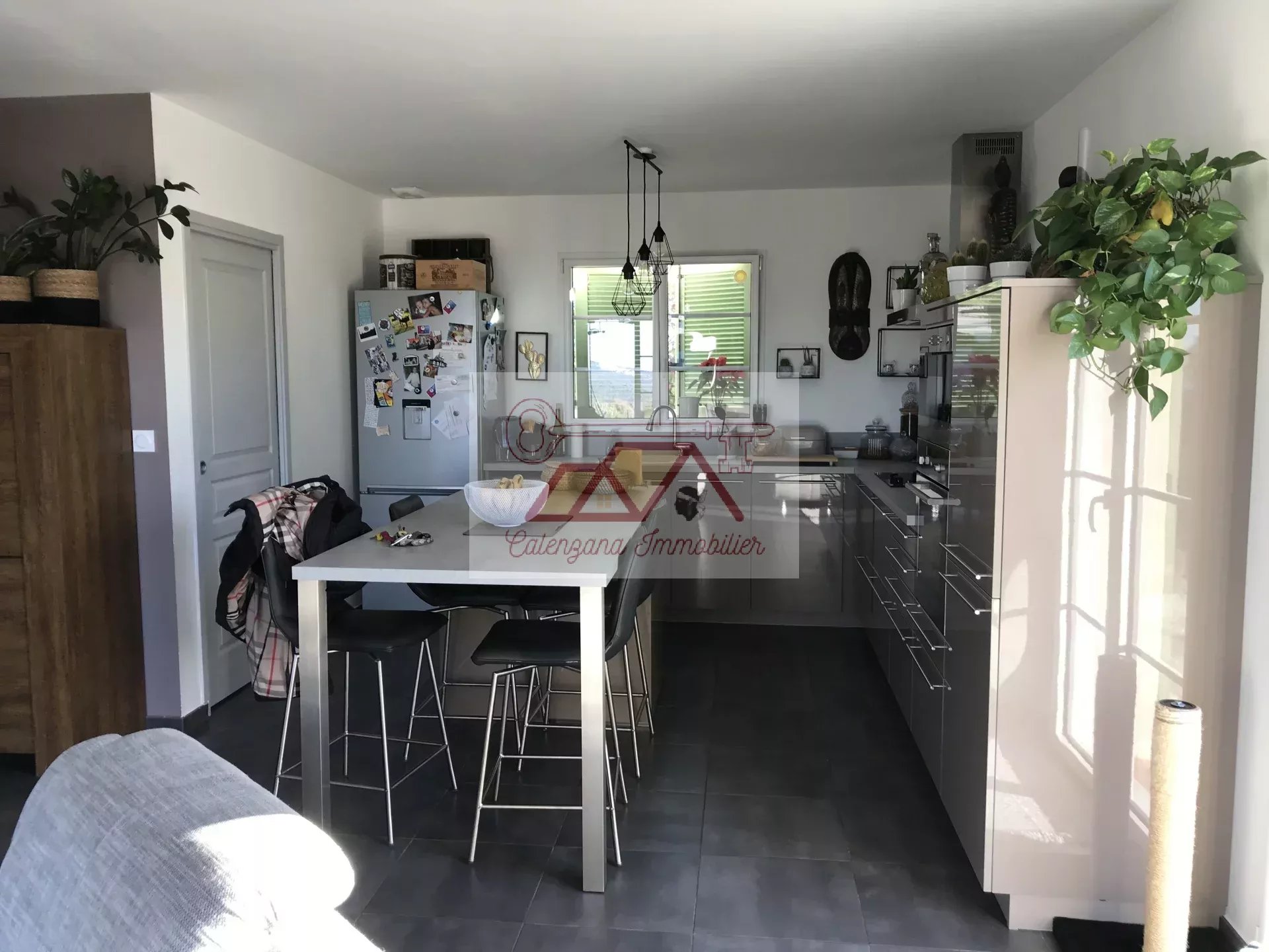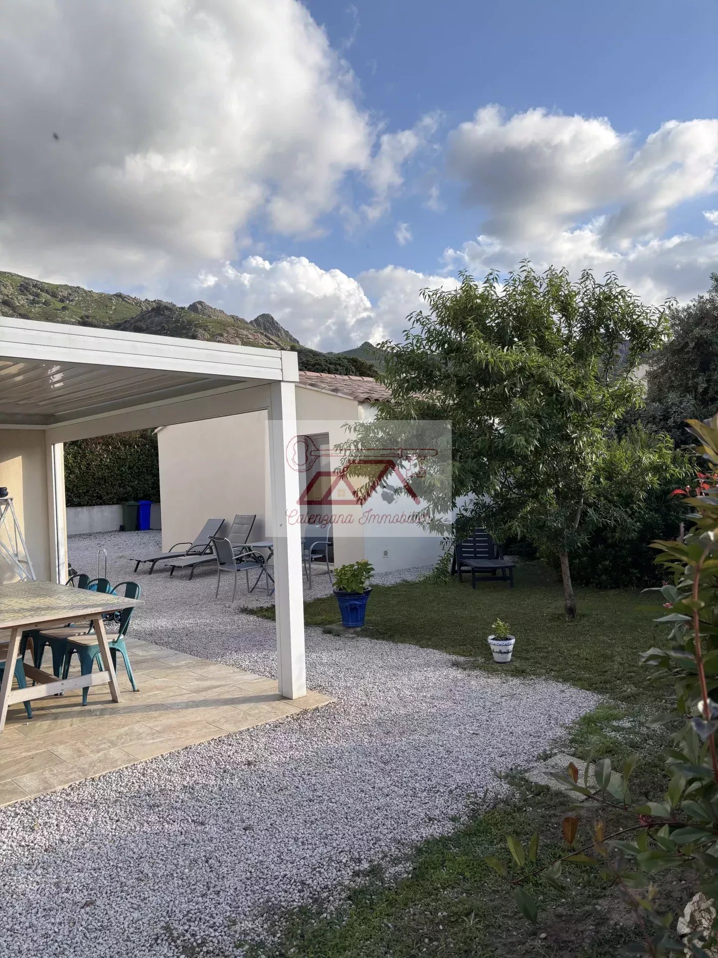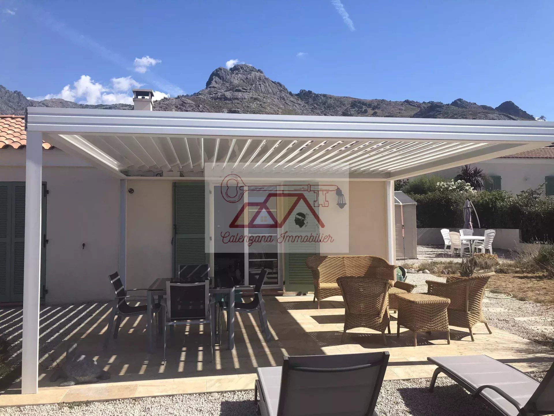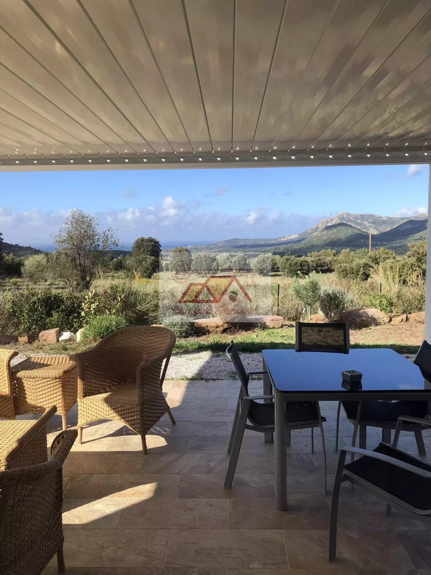 L’intérieur se compose d’un spacieux salon lumineux équipé d’un poêle à granulés, ouvert sur une cuisine moderne et fonctionnelle avec ilot central. Cette pièce de vie s’étend sur une terrasse agrémentée d’une pergola bioclimatique électrique, offrant une vue dégagée sur la mer et le Monte Grosso.