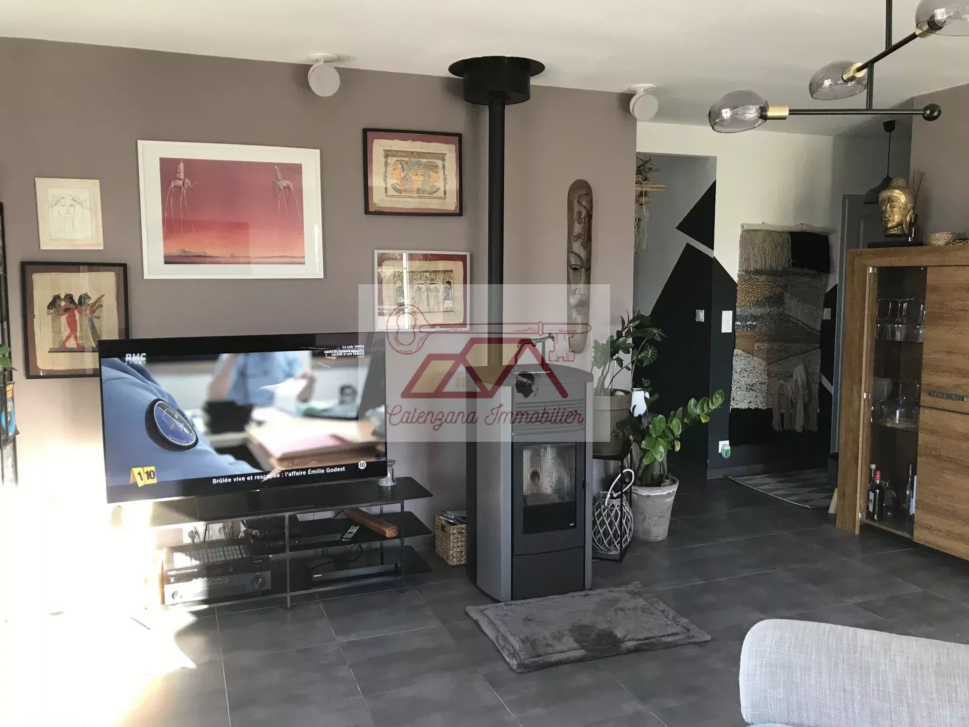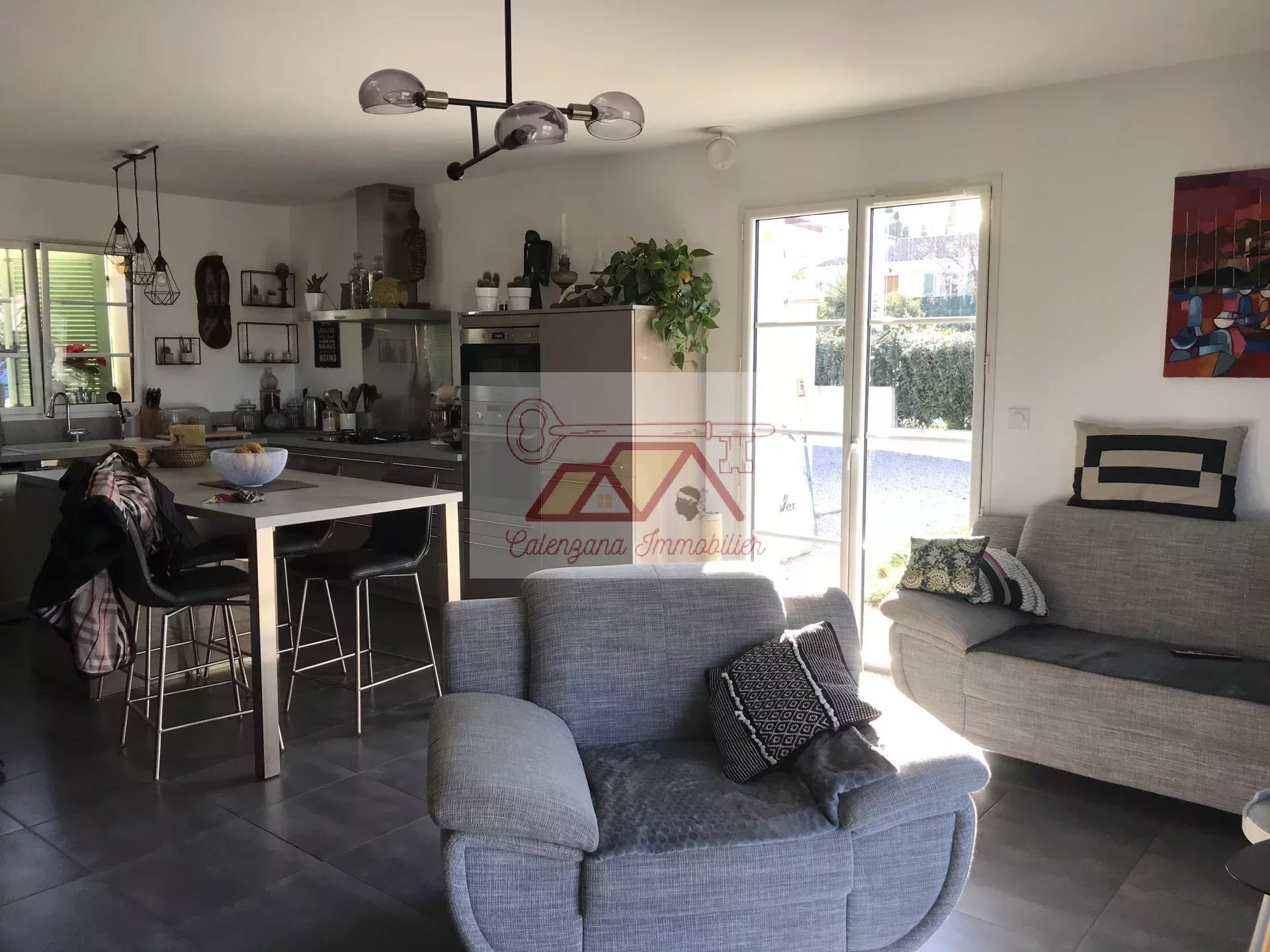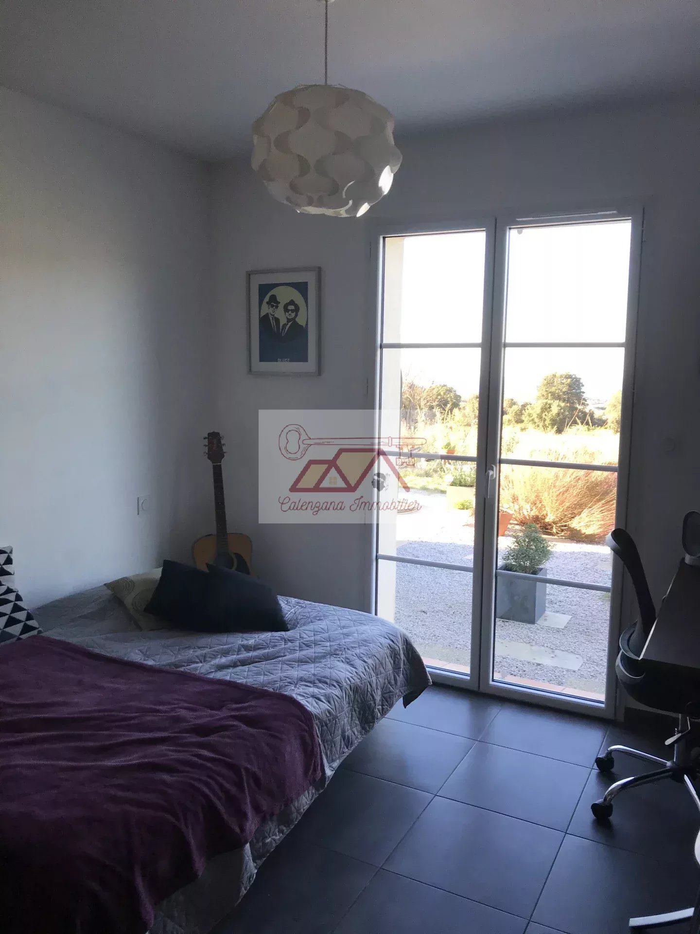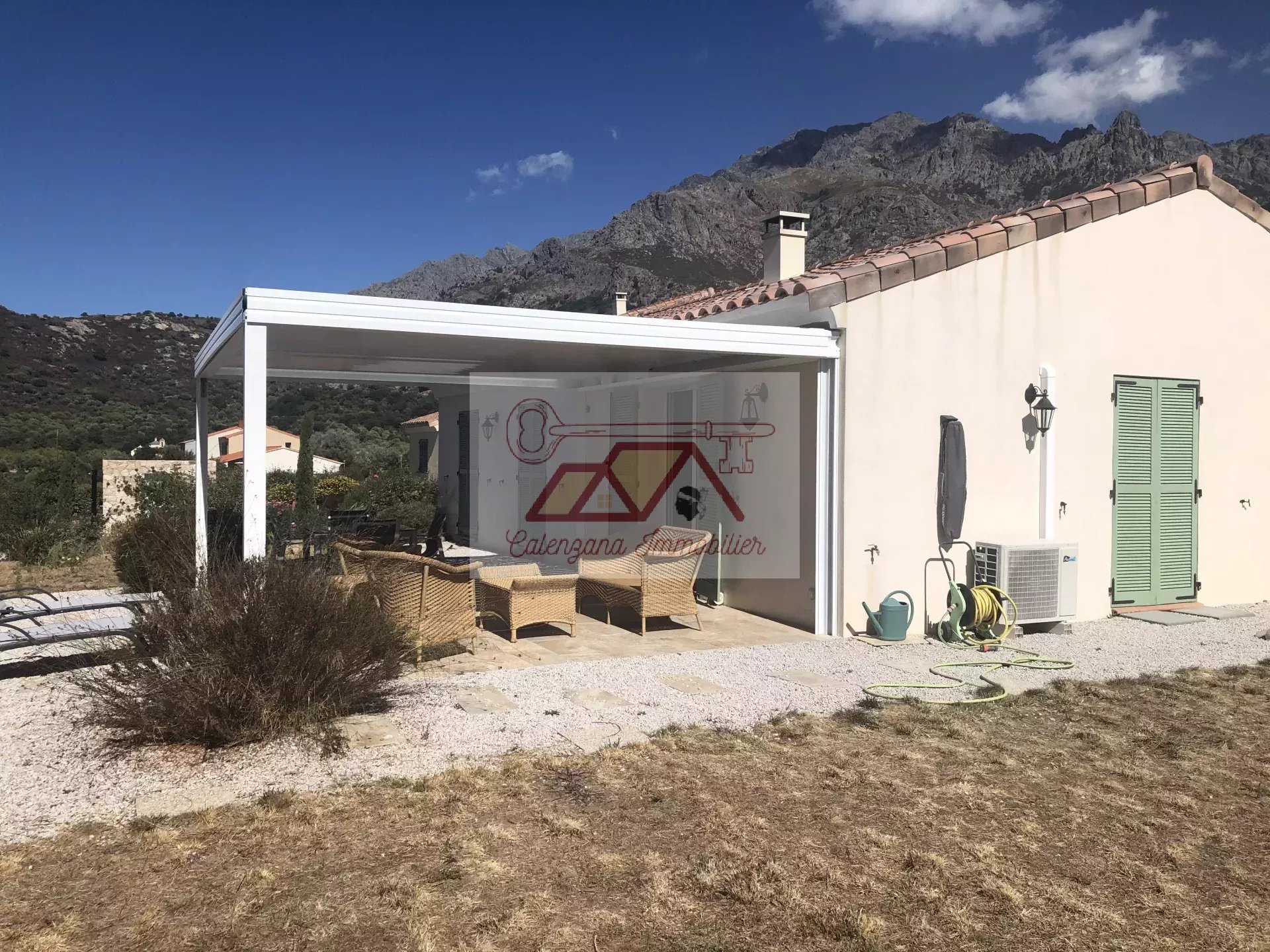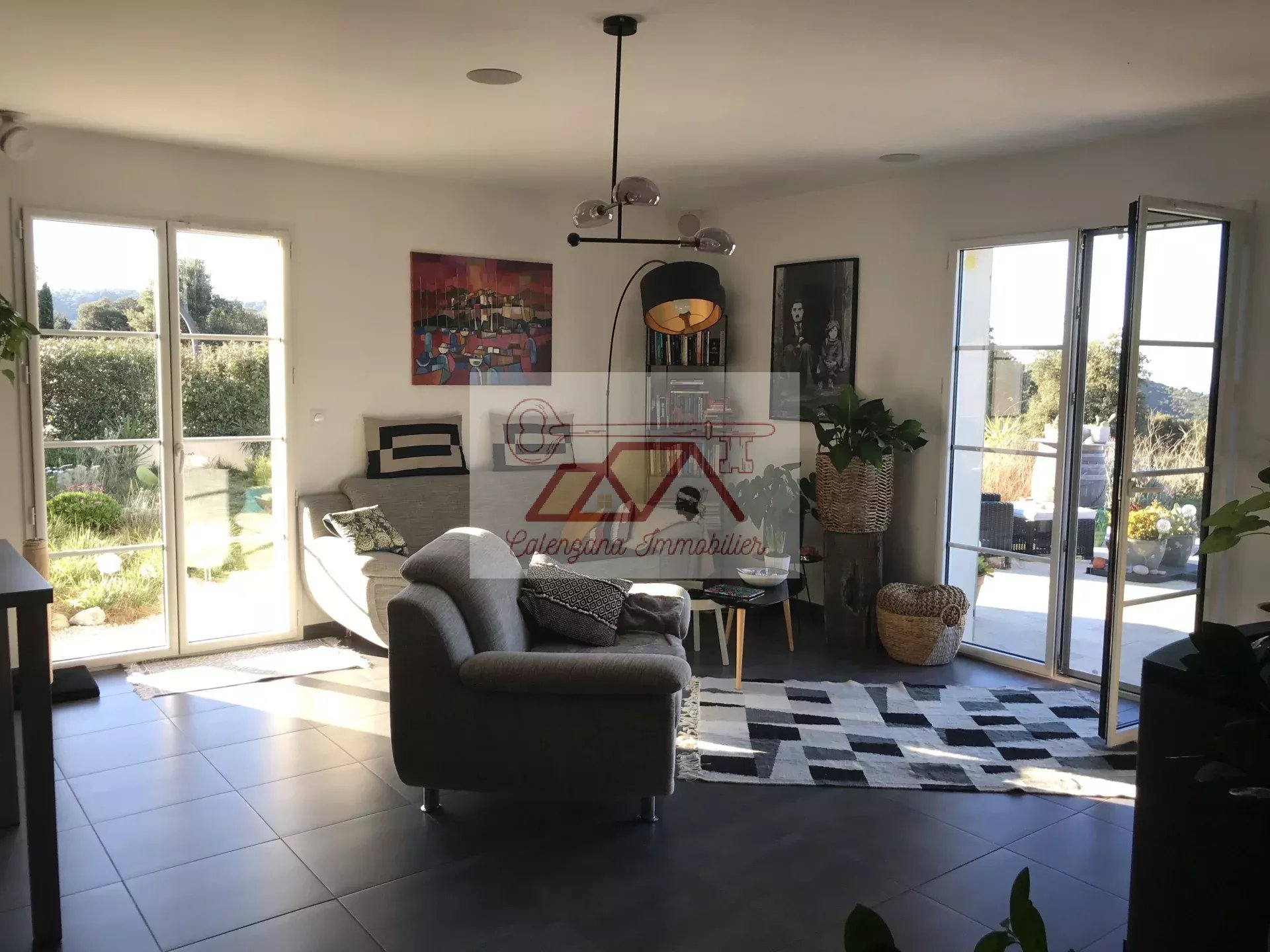 L’intérieur se compose d’un spacieux salon lumineux équipé d’un poêle à granulés, ouvert sur une cuisine moderne et fonctionnelle avec ilot central. Cette pièce de vie s’étend sur une terrasse agrémentée d’une pergola bioclimatique électrique, offrant une vue dégagée sur la mer et le Monte Grosso.