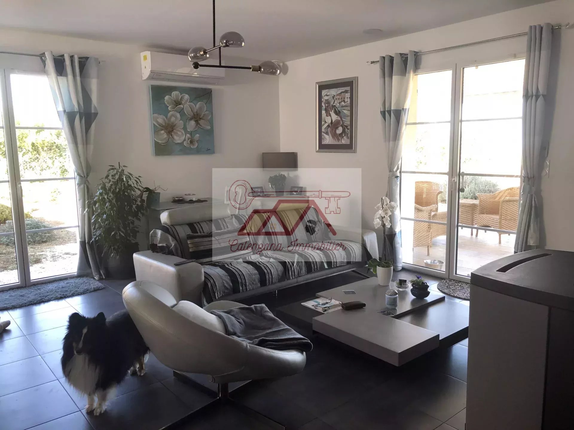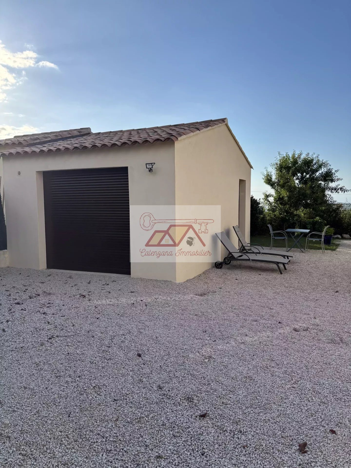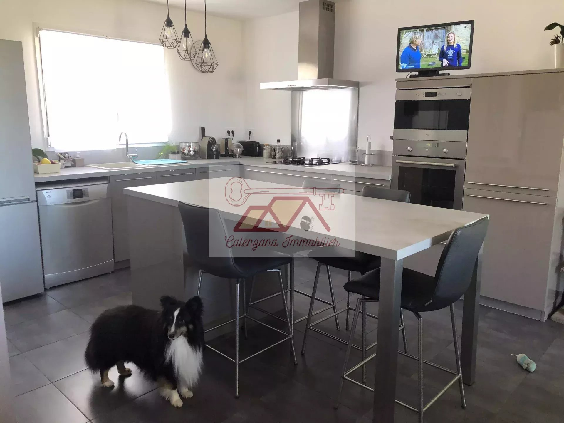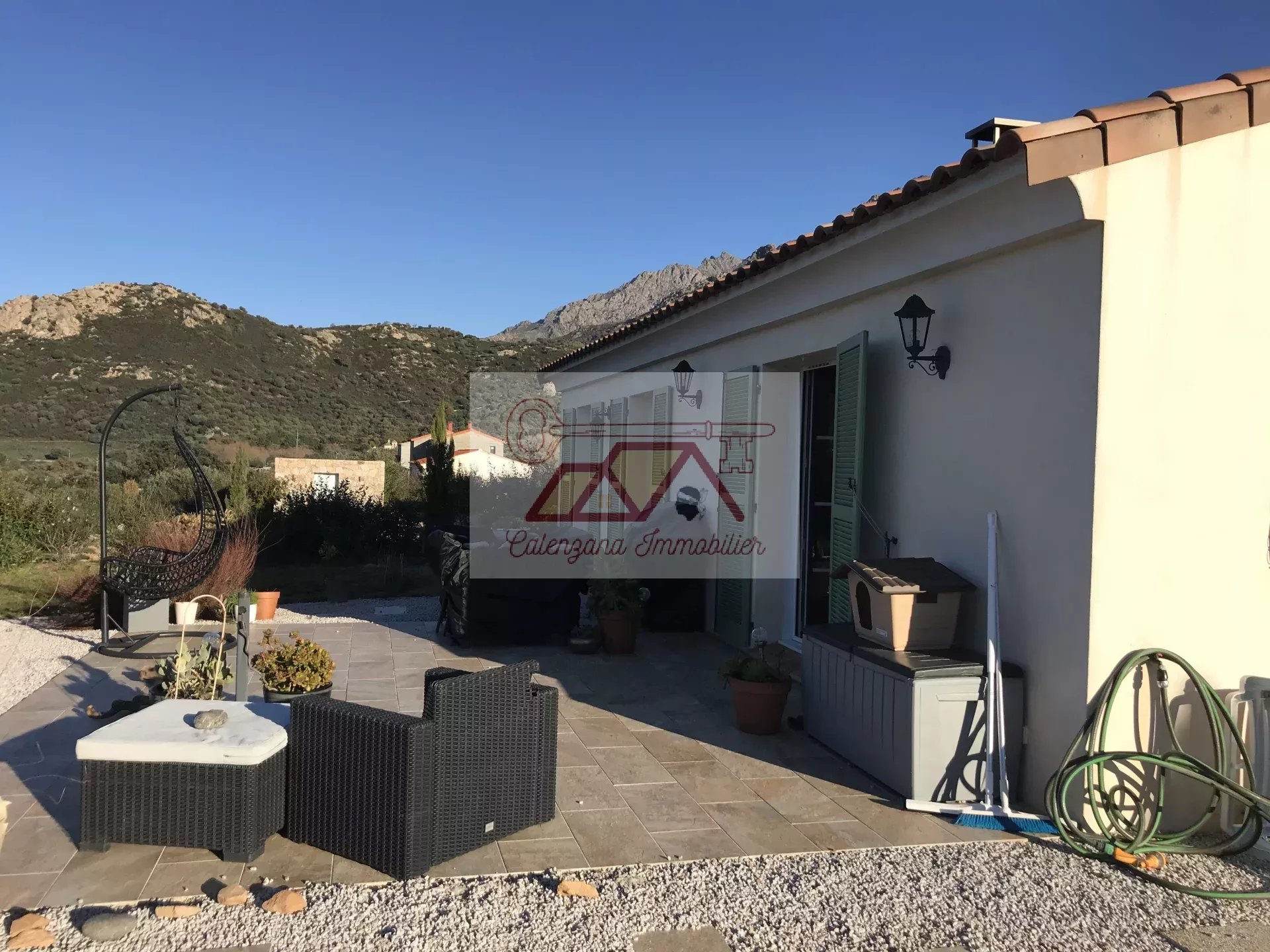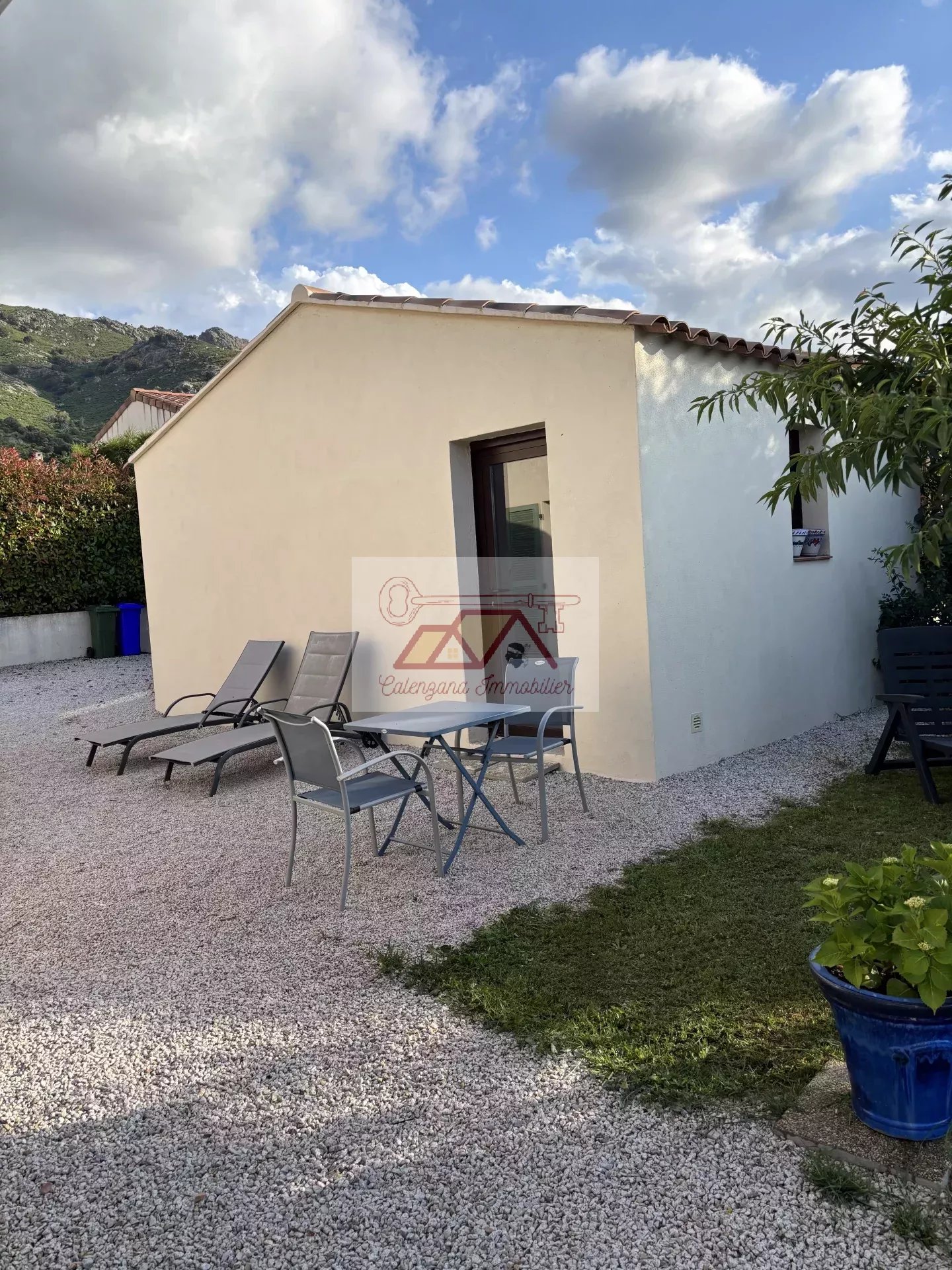 L’intérieur se compose d’un spacieux salon lumineux équipé d’un poêle à granulés, ouvert sur une cuisine moderne et fonctionnelle avec ilot central. Cette pièce de vie s’étend sur une terrasse agrémentée d’une pergola bioclimatique électrique, offrant une vue dégagée sur la mer et le Monte Grosso.