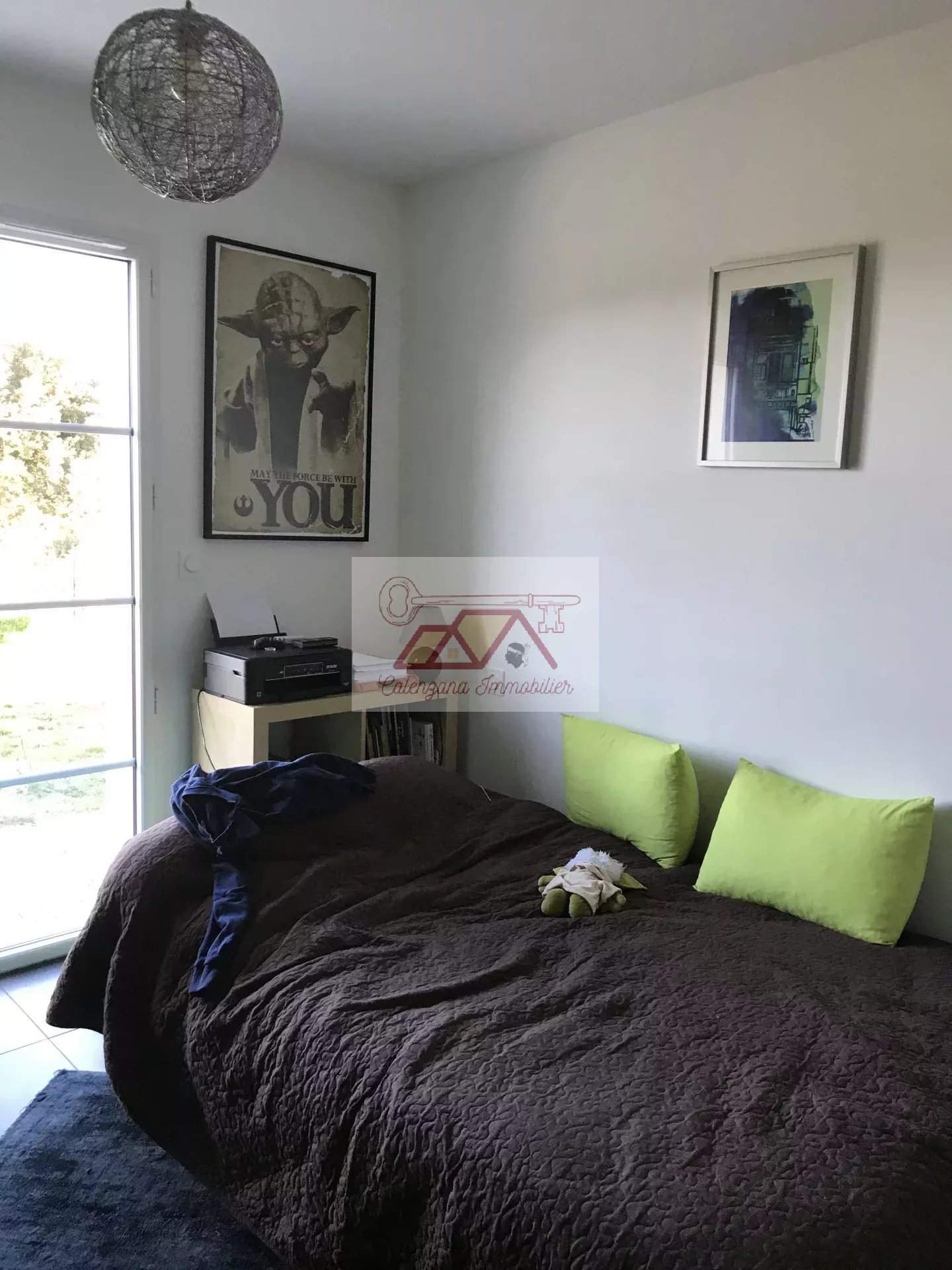 La maison dispose de trois belles chambres avec placards intégrés, chacune donnant accès au jardin grâce à des portes-fenêtres. Une salle d'eau contemporaine avec douche à l’italienne et toilettes ainsi qu’un WC indépendant complètent l’espace intérieur.