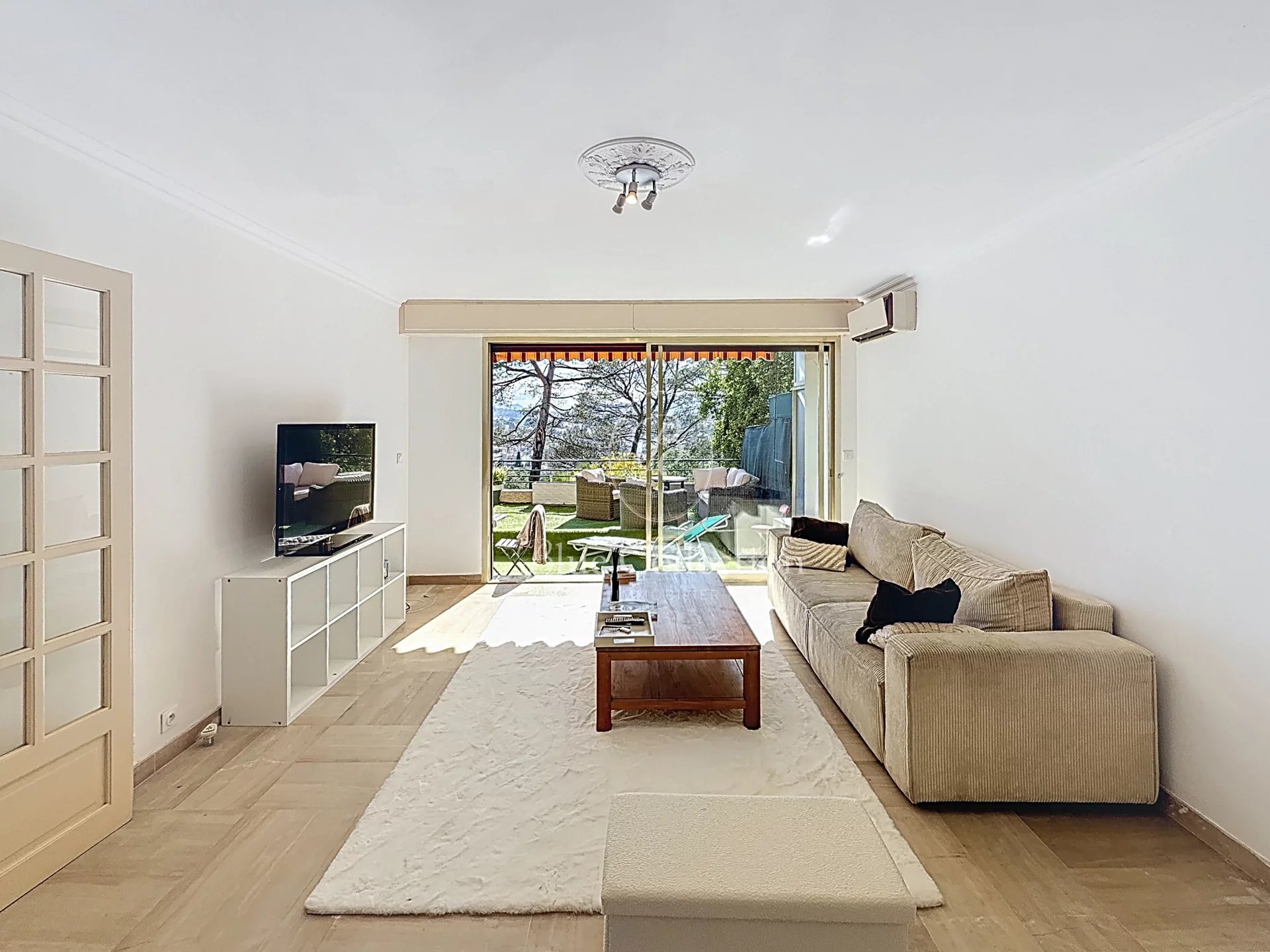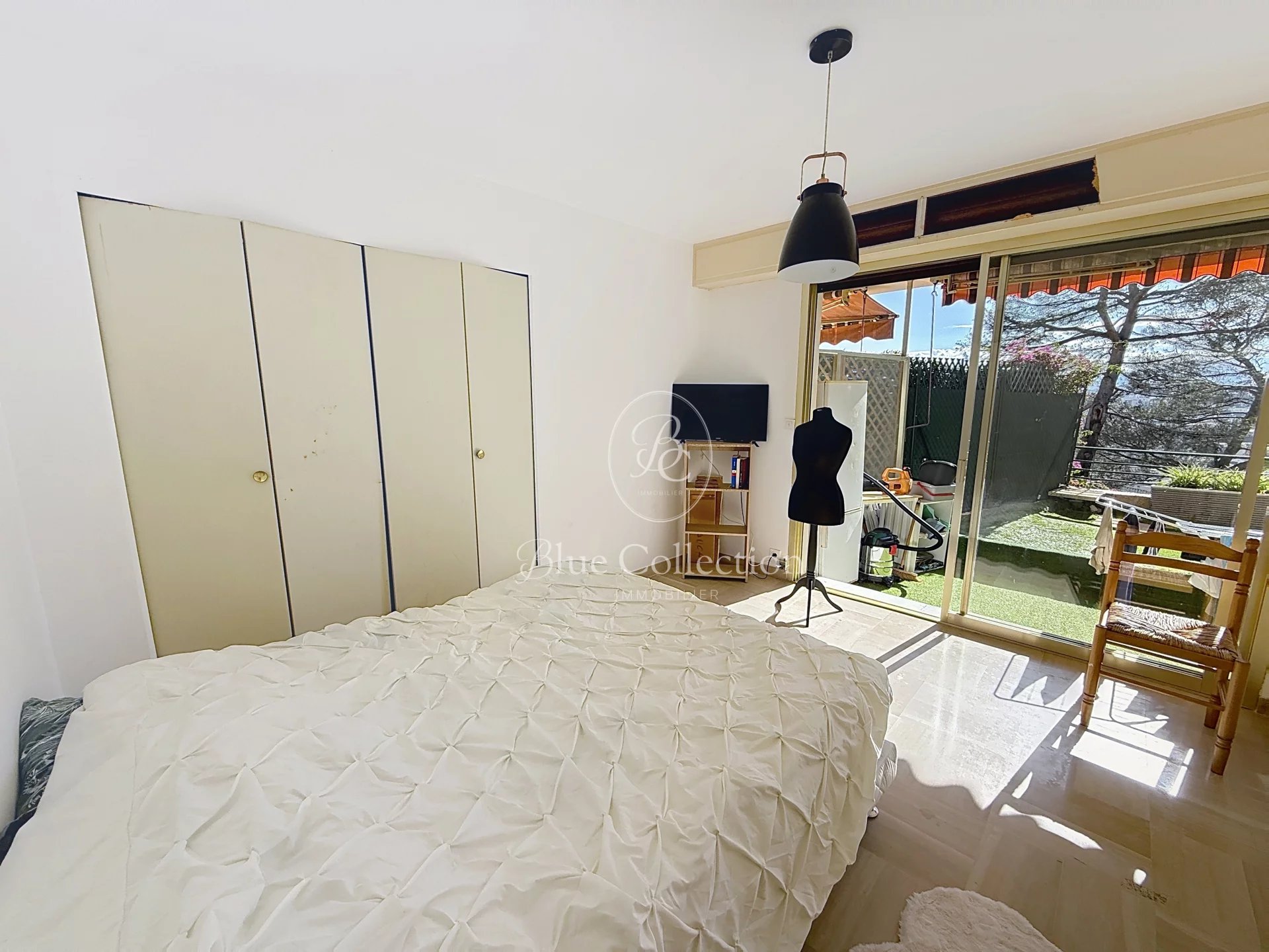 LE CANNET MAIRIE - RESIDENTIEL Dans une résidence de bon standing, un appartement 2 pièces de 58 m2 avec jardin d'environ 50 m2 exposé Ouest avec une vue panoramique dégagée au calme, comprenant : une entrée, un vastes séjour, une cuisine indépendante équipée, une chambre avec placard, une salle de bains et un WC indépendant. Une cave complète ce bien. Climatisation, volets électriques et stores.