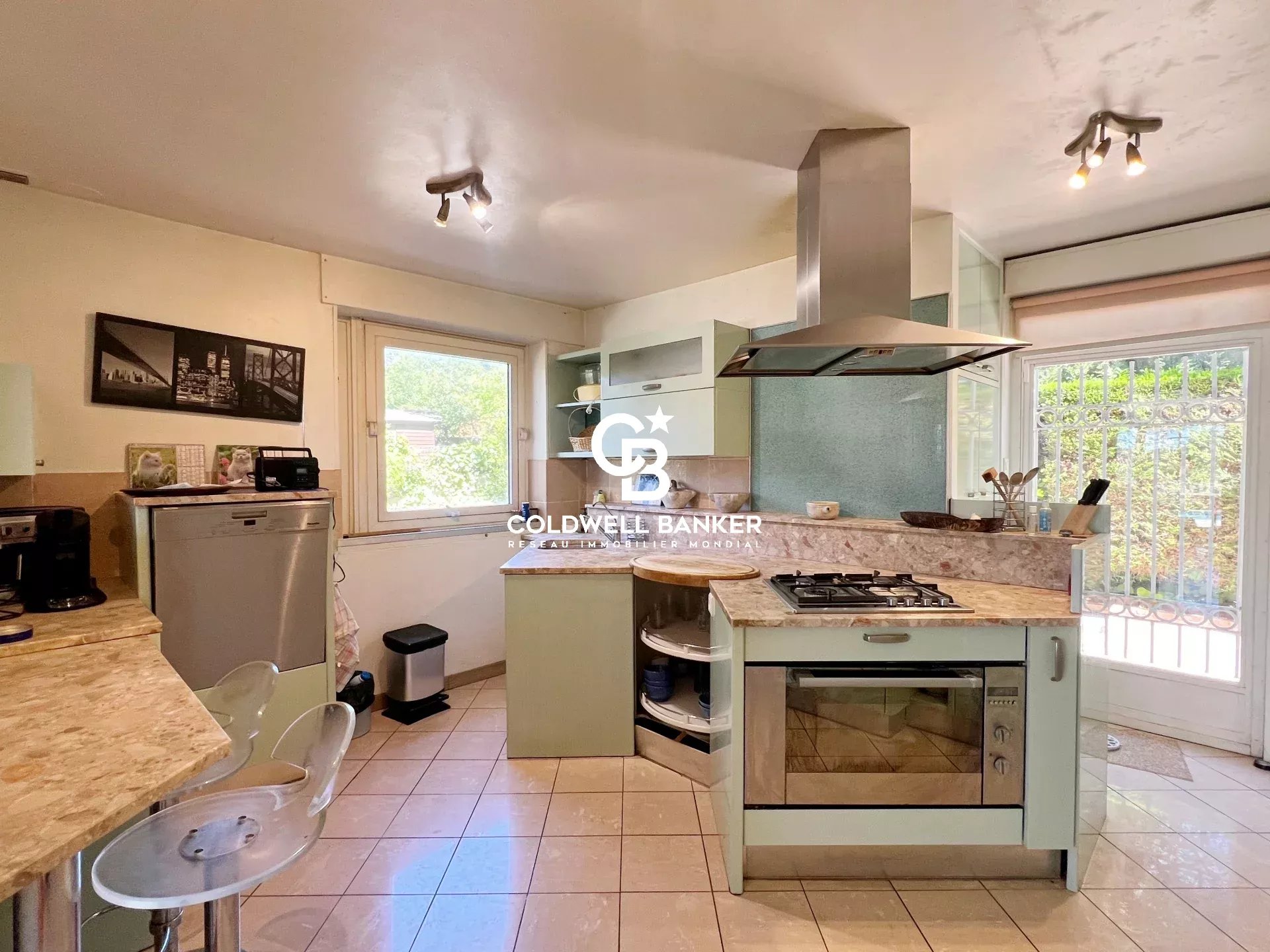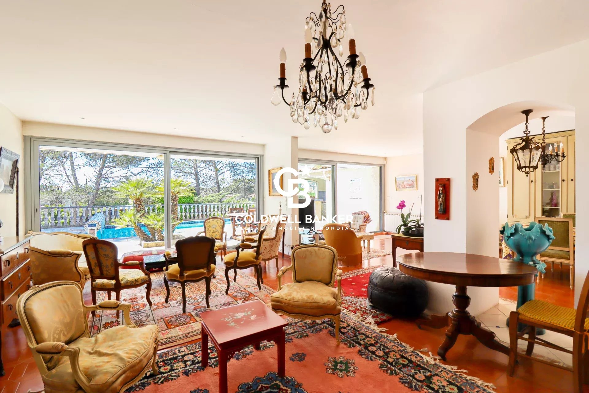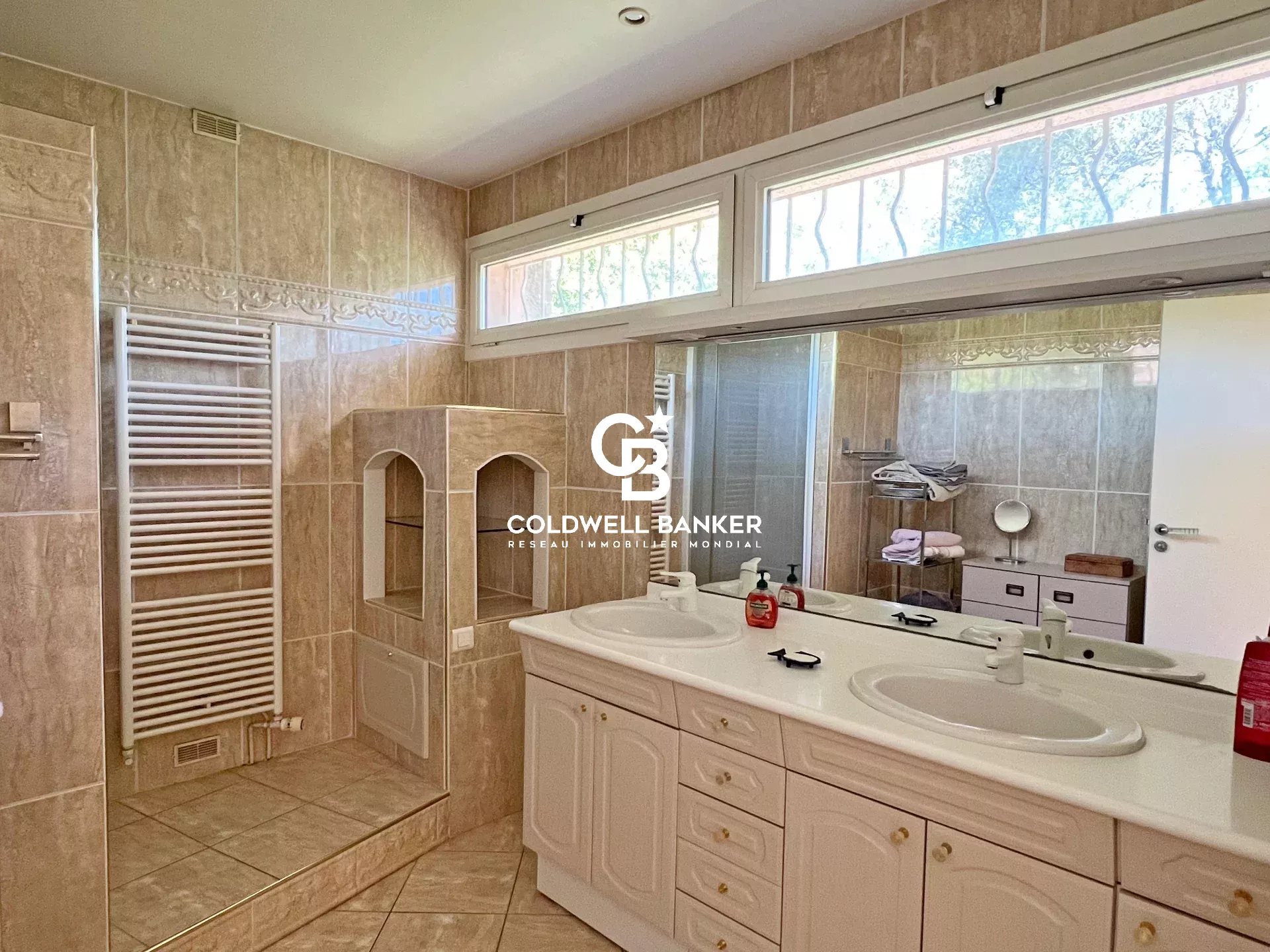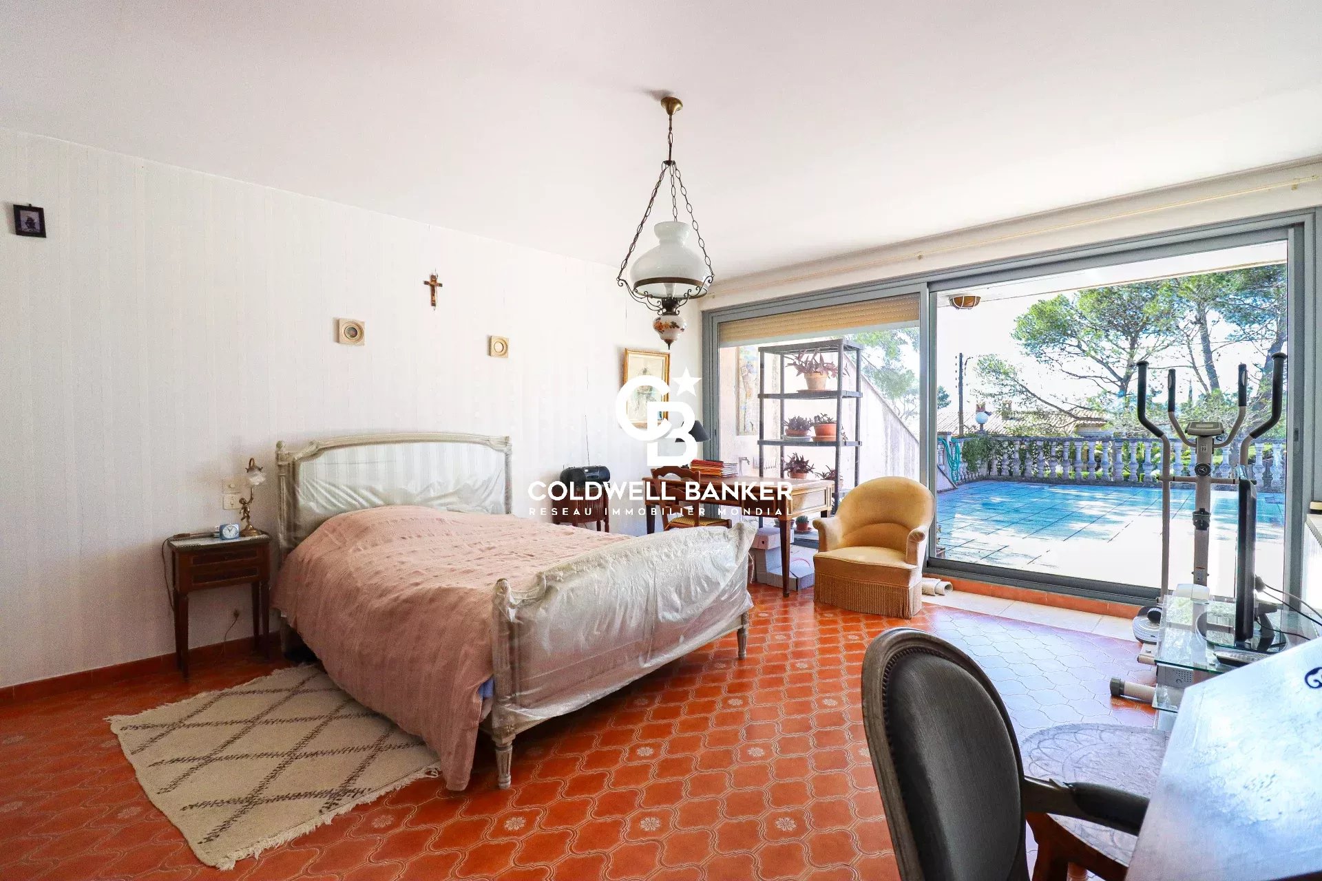 Saint-Raphaël Boulouris. Une villa d'architecte de plus de 200 m² sur un terrain de 1400 m² offrant une belle vue dégagée jusqu'à la mer depuis ses deux vastes terrasses exposées Sud. Cette propriété très lumineuse est composée au rez-de-chaussée d'un hall d'entrée avec WC, d'un séjour de 60 m², d'une cuisine et d'une suite parentale. L'étage se compose de trois chambres spacieuses, chacune ayant accès à la terrasse, ainsi que d'une salle de douche et des toilettes. Une belle piscine avec cuisine d'été, un grand sous-sol et un double garage complètent ce bien. Aucun vis-à-vis, calme, à distance de marche des commerces et des plages.