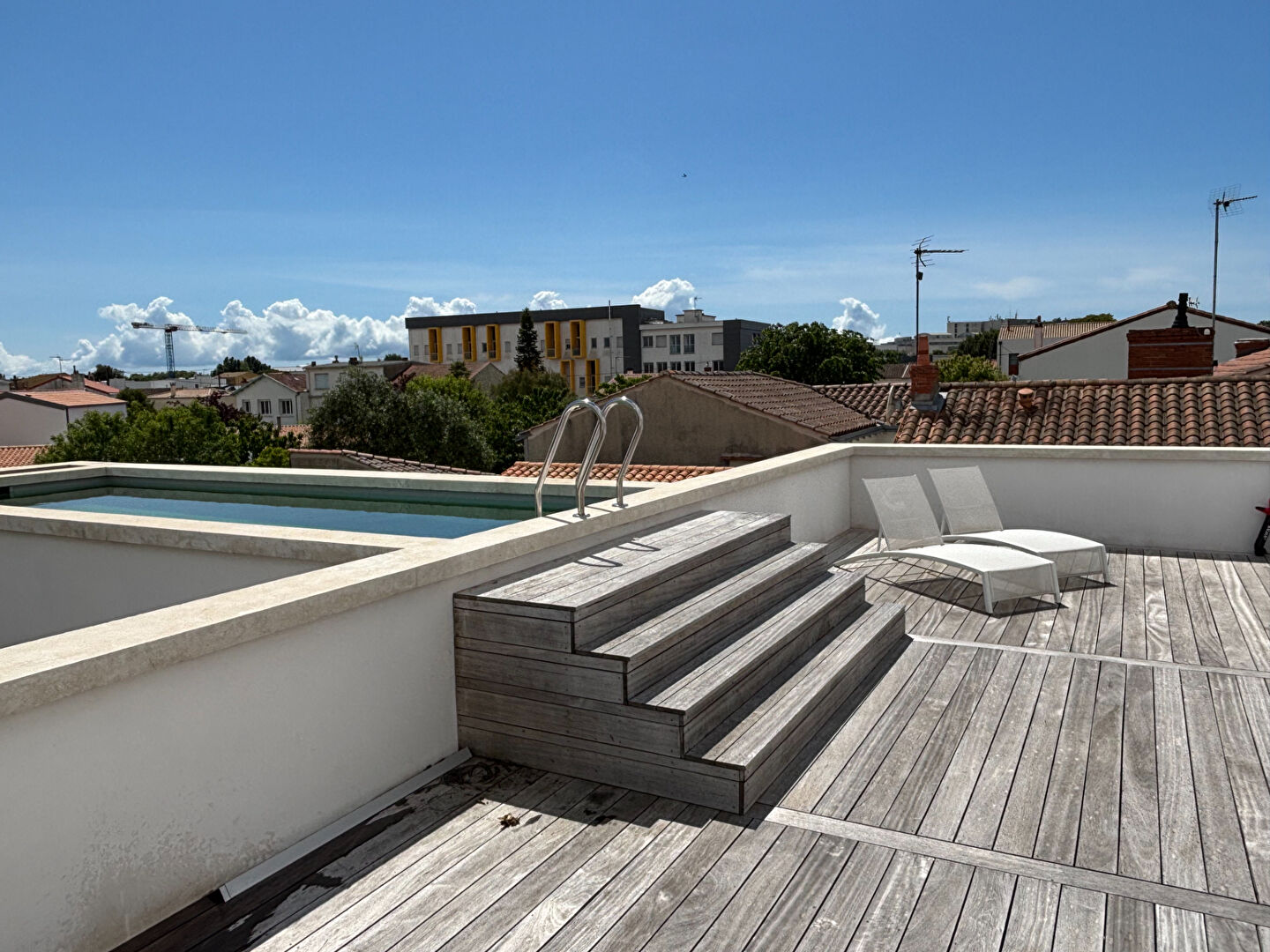 A seulement 10 minutes à pieds des Halles, des commerces et de l'animation du centre-ville, cette maison d'architecte de 150 m2 vous séduira par ses volumes , sa luminosité et ses prestations haut de gamme . Nichée dans un environnement calme , elle offre un cadre de vie privilégié au coeur de La Rochelle . _ Quatre Chambres , dont une en rez-de-chaussée . _ Pièce de vie spacieuse avec de grandes ouvertures sur l'extérieur . _ Cuisine haut de gamme . _ Piscine chauffée . _ Jacuzzi . _ Grand garage sécurisé . _ Matériaux de qualité ,finitions soignées . _ Jardin intime sans vis à vis . Un bien rare et exclusif , idéal pour une résidence principale ou secondaire , à deux pas de toutes les commodités . N'hésitez pas à me contacter au 06 88 31 60 32 pour toute information complémentaire . Je reste à votre disposition . "Les informations sur les risques auxquels ce bien est exposé sont disponibles sur le site Géorisques.gouv.fr" (3.99 % honoraires TTC à la charge de l'acquéreur.)