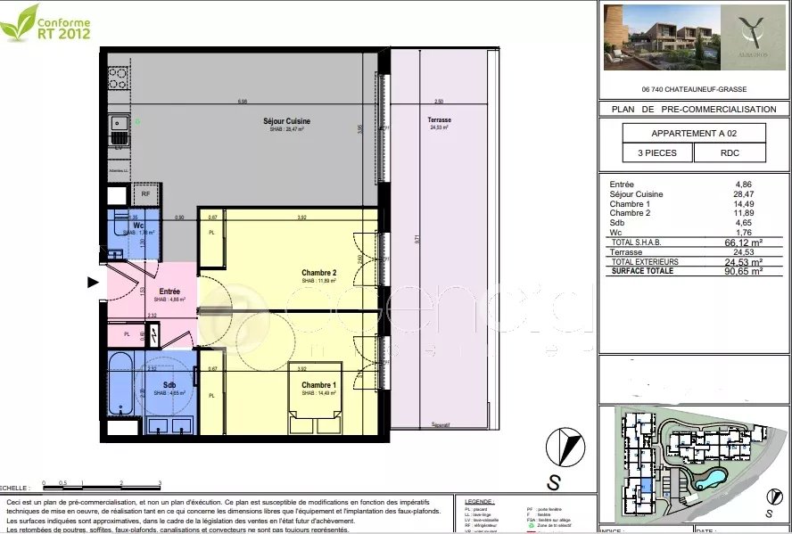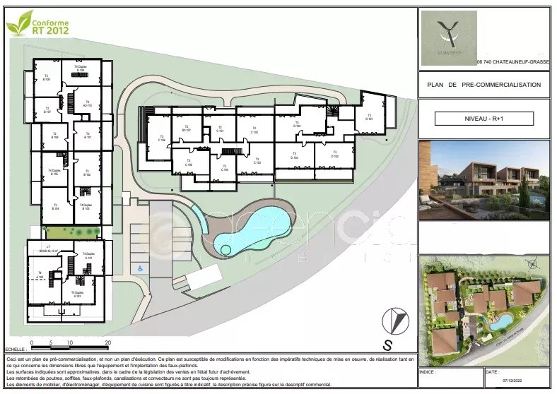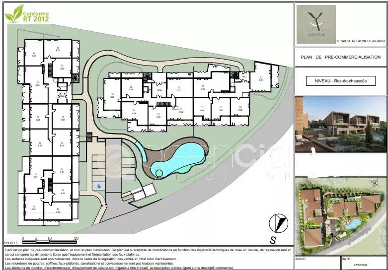 Notre agence immobilière vous propose un nouveau programme neuf au sein de la ville de Châteauneuf-Grasse. Sur les plaines et face au Golf de la Grande Bastide, ce prestigieux domaine sera implanté dans un quartier recherché tout en conservant un environnement préservé! Avec une architecture contemporaine, intimiste et seulement deux étages, la résidence offrira de belles expositions aux appartements. Tous disposent d’un espace extérieur, terrasse ou jardin privatif, pour prolonger son bien-être. Une piscine complète également le décor pour des moments de détente. L’atout charme majeur reste la magnifique vue sur le Golf et son environnement. Les appartements, du 2 au 5 pièces, bénéficient d’agencements soignés et d’une belle luminosité. La qualité de conception se révèle jusque dans les moindres détails avec des prestations sélectionnées pour garantir une douceur de vivre durable à chaque instant. Prestations ESPACES INTERIEURS. Les sols sont habillés de carrelage dans toutes les pièces avec un large choix et possibilité de remplacer par du parquet. Une faïence pare les murs des salles de bains et salles d’eau. Les murs et plafonds sont revêtus d’une peinture blanche lisse. Les baies vitrées disposent de double vitrage et sont équipées de coffres de volets roulants affleurants à la menuiserie avec manœuvre motorisée. Toutes les fenêtres et menuiseries seront en aluminium. Les salles de bains offrent de beaux équipements : radiateur sèche-serviettes, meuble simple ou double vasque surmonté d’un miroir, WC suspendu, receveur de douche extra-plat avec pare-douche. Les appartements seront équipés d’un système de domotique avec commande de volet roulant tactile SOMFY. Possibilité de régler et programmer la température du chauffage/rafraîchissement. ESPACES EXTERIEURS. Les sols des balcons et terrasses recevront des dalles sur plots en grés cérame émaillé. Chaque terrasse sera équipée d’une prise de courant, d’un robinet de puisage et d’un point lumineux.