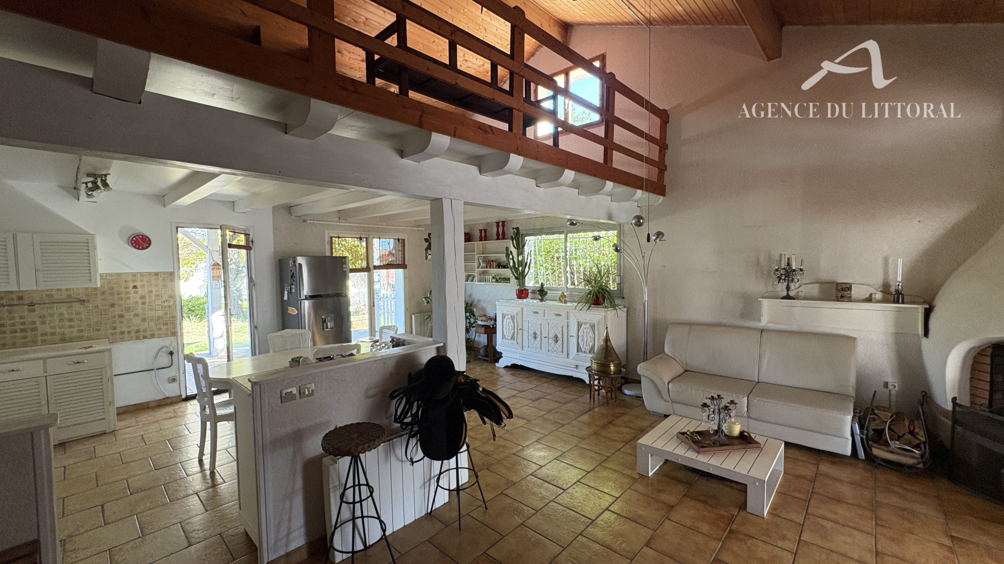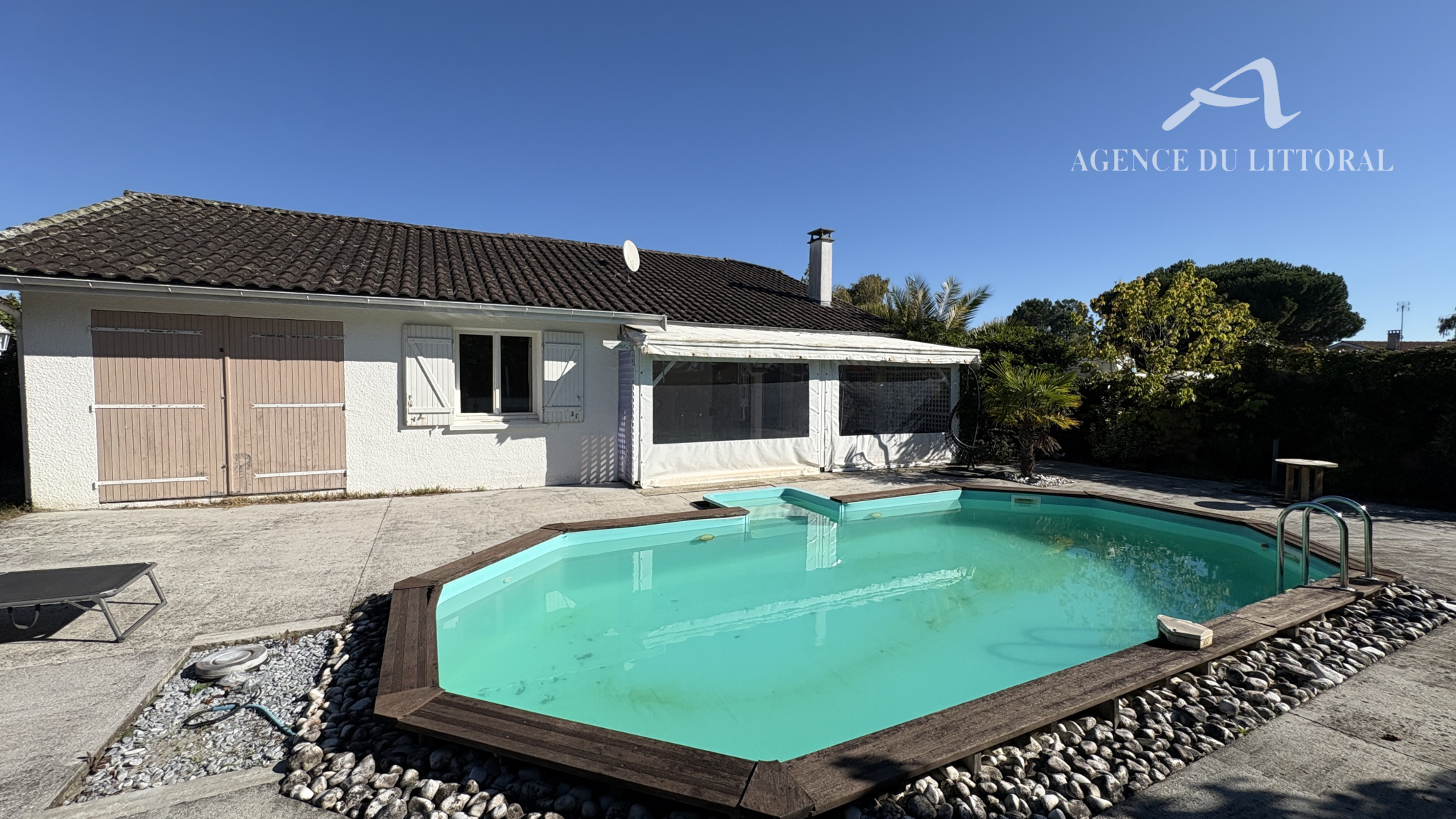 L'Agence du Littoral vous propose cette maison d'une surface habitable d'environ 107 m2 sur un terrain de 911 m2 dans un secteur calme à proximité des écoles. Elle se compose d'une pièce à vivre avec cuisine donnant sur la piscine et son jardin, deux chambres, une mezzanine de 23 m2 qui peut devenir la troisième chambre, une salle de bains, un wc séparé. Un garage attenant de 15,60 m2. Fort potentiel de rénovation grâce à l'agencement existant. A voir rapidement