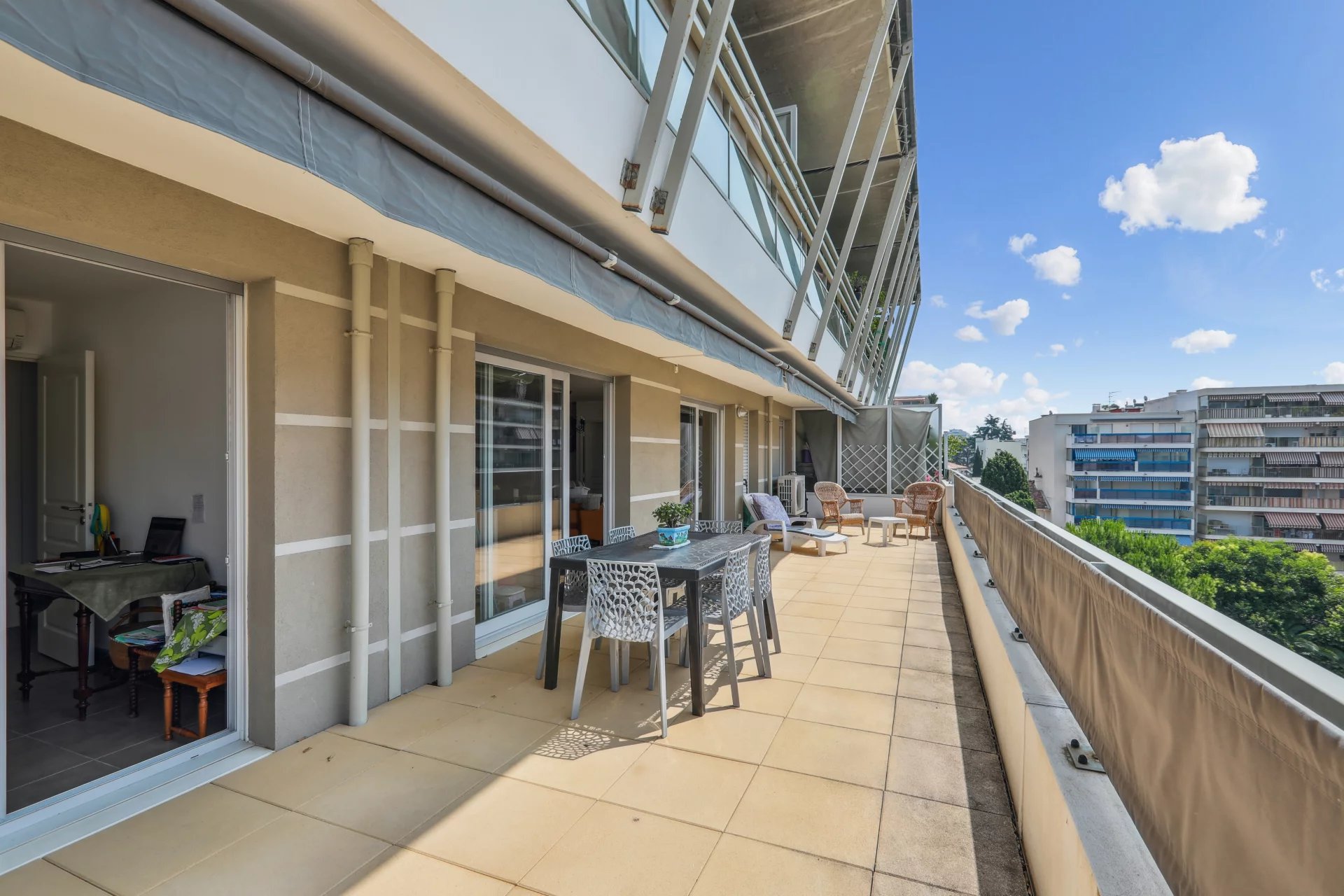 VENDU - Antibes Juan-les-Pins - Bel appartement 3 pièces de 70 m², lumineux, au calme avec une grande terrasse de 40 m² exposée plein sud. Il se compose d’un séjour avec cuisine ouverte, de 2 chambres ayant un accès à la terrasse, d'une salle de bain, d'une salle de douche avec WC et d'un WC indépendant. Vous apprécierez sa localisation, à seulement 200m de la mer, des restaurants et des boutiques de Juan Les Pins. Un garage en sous-sol complète ce bien. Résidence récente (2012) avec ascenseur. Climatisation réversible, double vitrage, stores électriques, volets roulants électriques, fenêtres coulissantes. Bien en copropriété avec 40 lots principaux. Quote-part des charges 188€ par mois (eau froide incluse). Pas de procédure en cours à notre connaissance. Les informations sur les risques auxquels ce bien est exposé sont disponibles sur le site Géorisques : georisques.gouv.fr