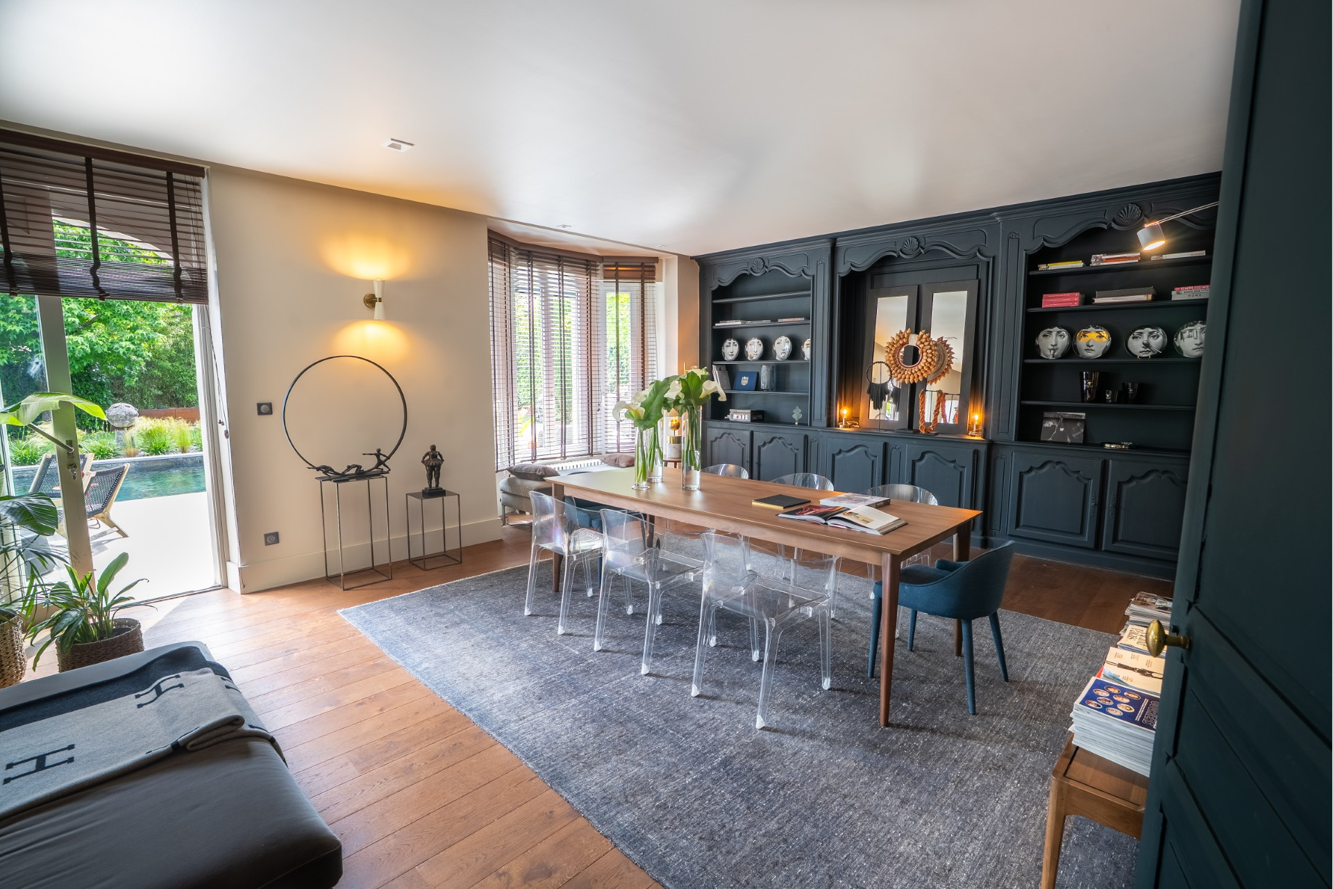 De plain pied : Une entrée, dégagement, salon-salle à manger avec cheminée ouvrant sur l'espace piscine, une cuisine entièrement équipée et aménagée avec son arrière cuisine agencée et fonctionnelle, WC. Placards. Etage 1 : dégagement, suite parentale très raffinée avec salle de bains et dressing, 1 chambre avec salle d'eau, dressing-bureau et salon TV communicants avec la chambre 1, WC. Etage 2 : 3 chambres avec salle d'eau, dégagement et WC. Terrasses extérieures. Au sous-sol : garage, cave à vin, buanderie, local technique piscine.