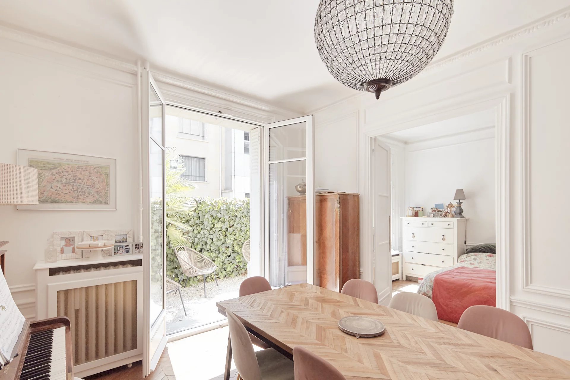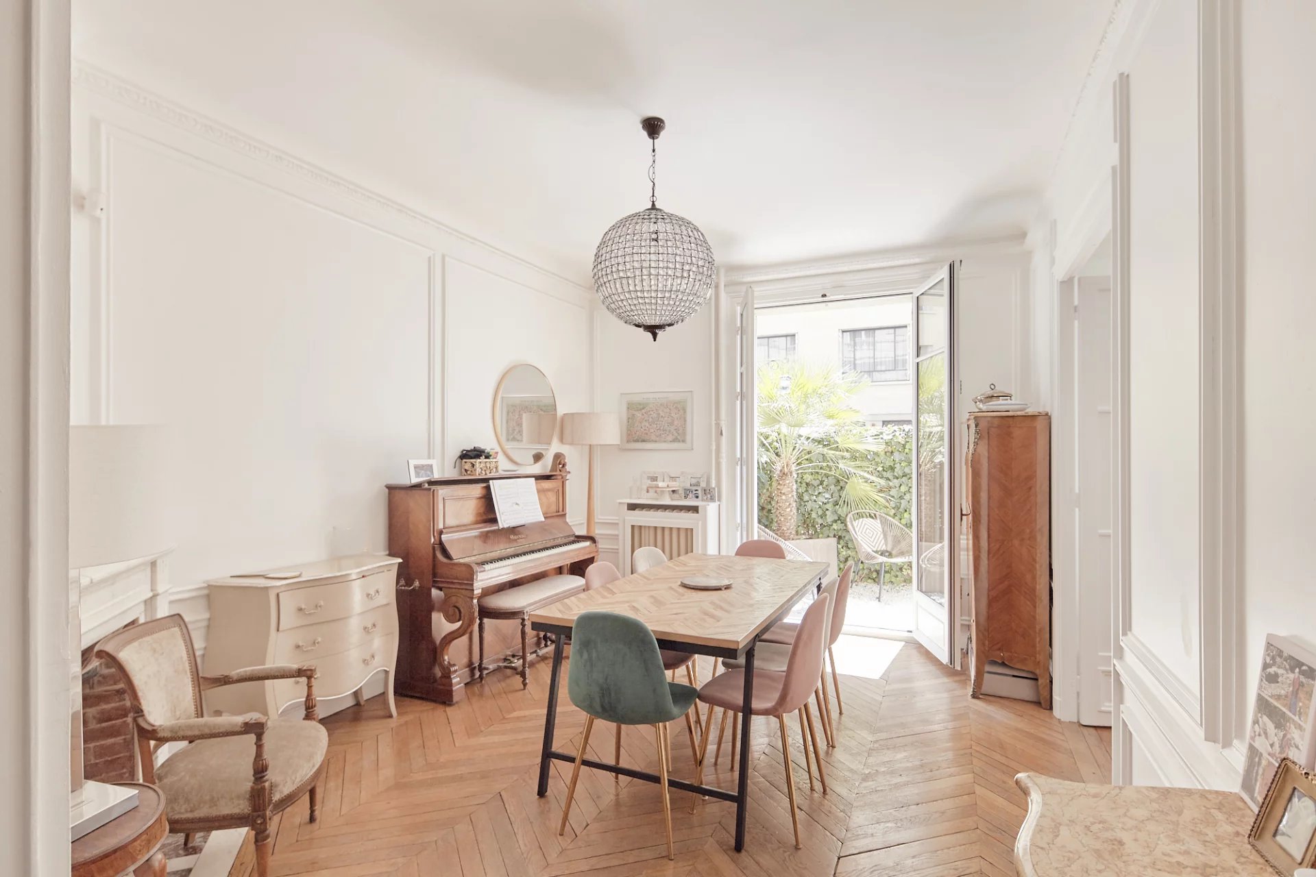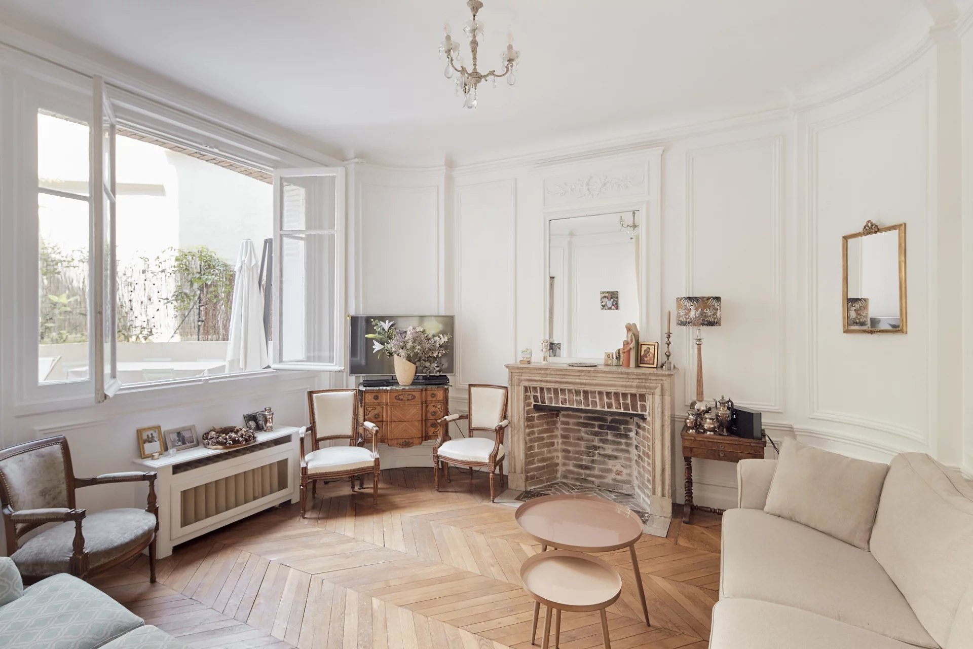 Jasmin - Dans une jolie rue calme à proximité des commerces de Passy, d’Auteuil et de l’avenue Mozart, au sein d’un immeuble 1912 de standing sécurisé et aux parties communes parfaitement tenues, un superbe appartement Haussmannien de 100m2 bordé de terrasse et jardins d'environ 60m2. Cet appartement avec parquet en point de Hongrie, moulures et cheminées dans toutes les pièces, très lumineux et offrant de beaux volumes grâce à 3m10 de hauteur sous plafond, se compose d’une agréable entrée desservant, en étoile : un séjour orienté Sud-Est donnant par de grandes portes-fenêtres sur un premier jardinet d’environ 20m2 séparé de la rue par une haie, une salle à manger, 3 grandes chambres de 14, 16 et 12m2, deux salles d’eau, un wc séparé, une buanderie, et une cuisine séparée (possible d’ouvrir sur la salle à manger) dont la porte-fenêtre dévoile le second jardin/terrasse privatif de 40m2 au calme absolu. Une chambre de service de 10m2 louable et accessible par ascenseur et une double cave complètent ce bien.