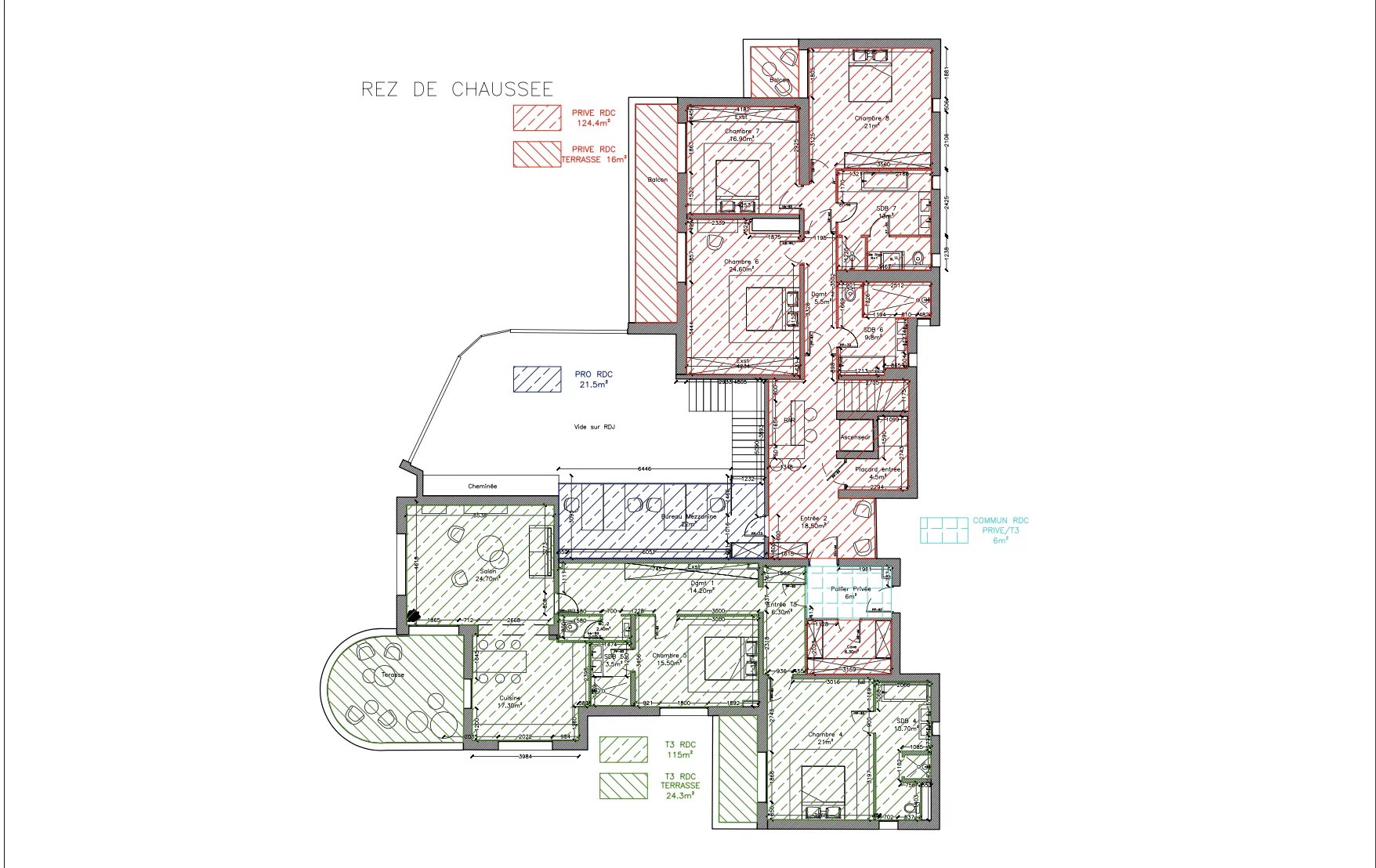 À l’étage inférieur, une entrée, trois grandes chambres, deux salles de bains-douche, deux toilettes, de nombreux rangements.
