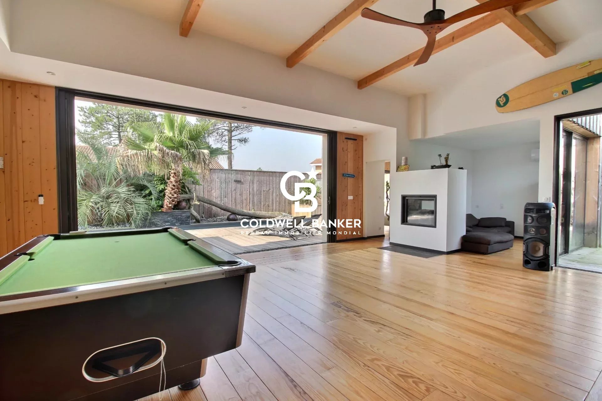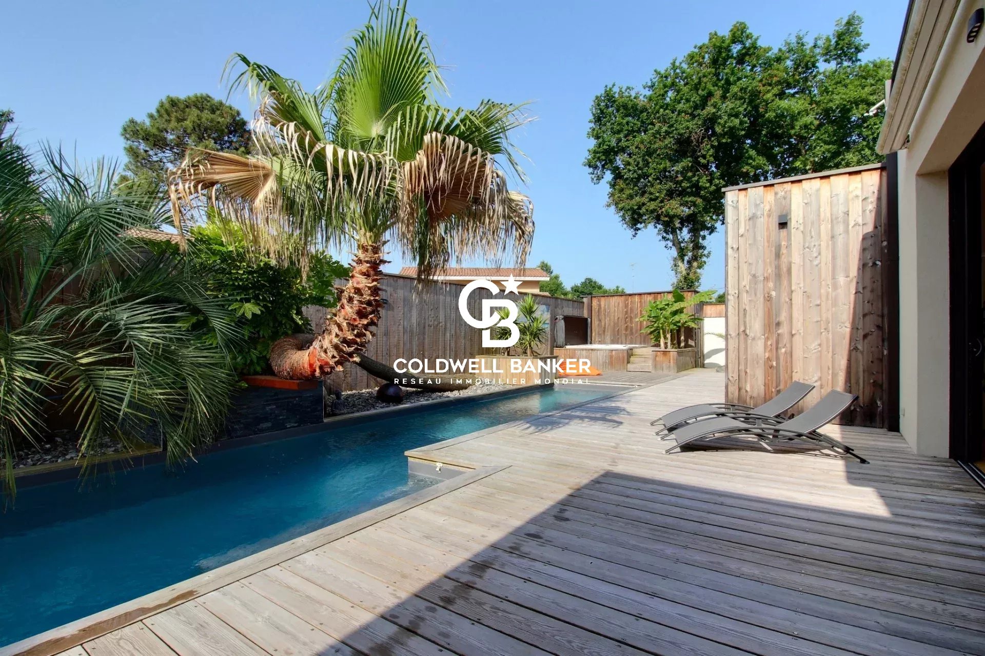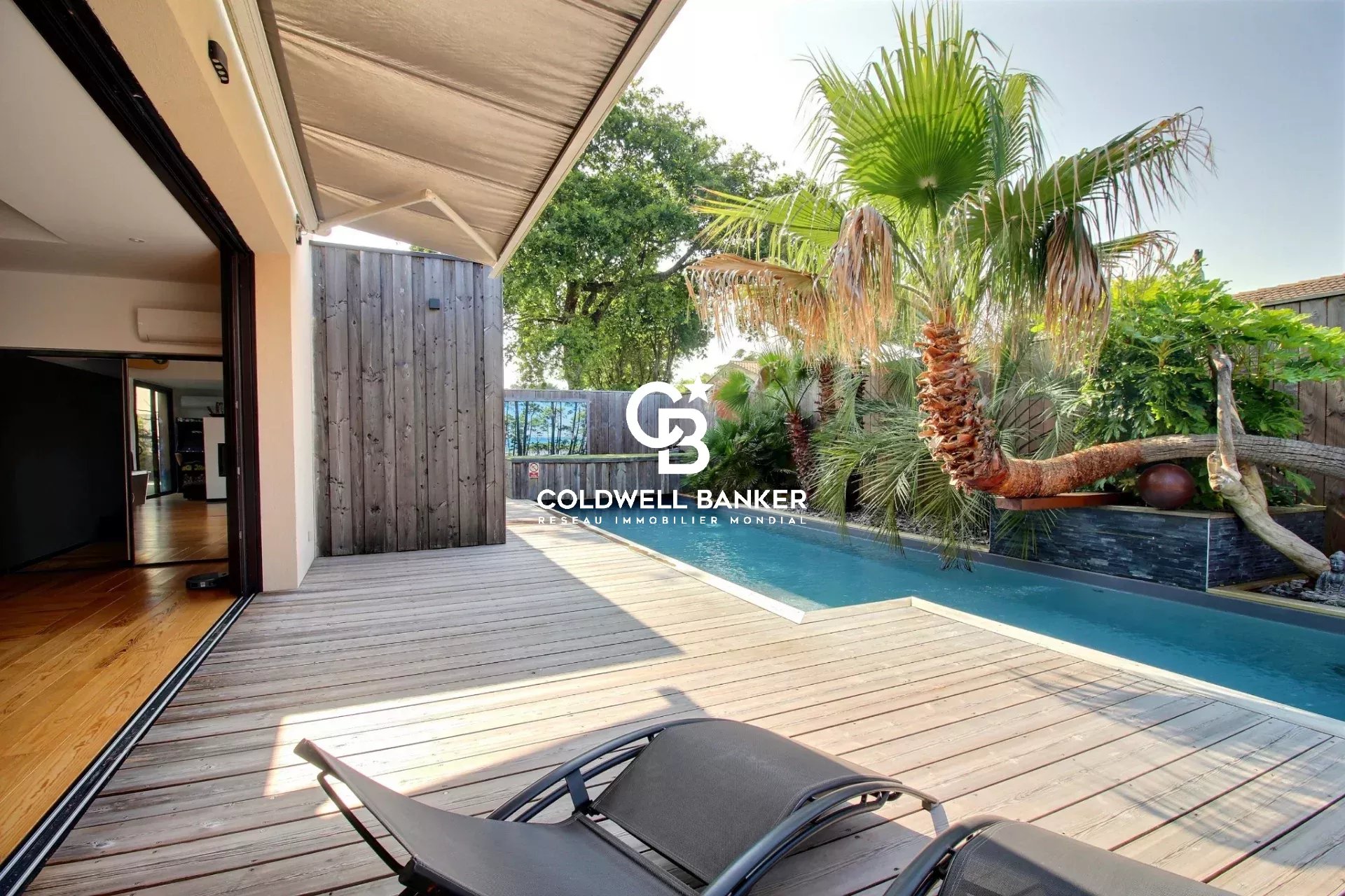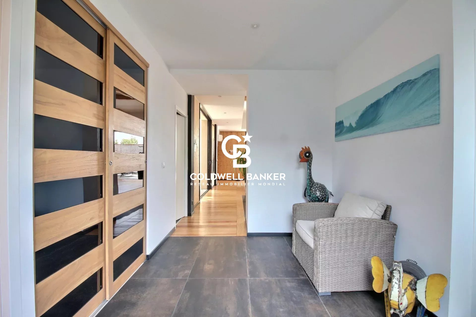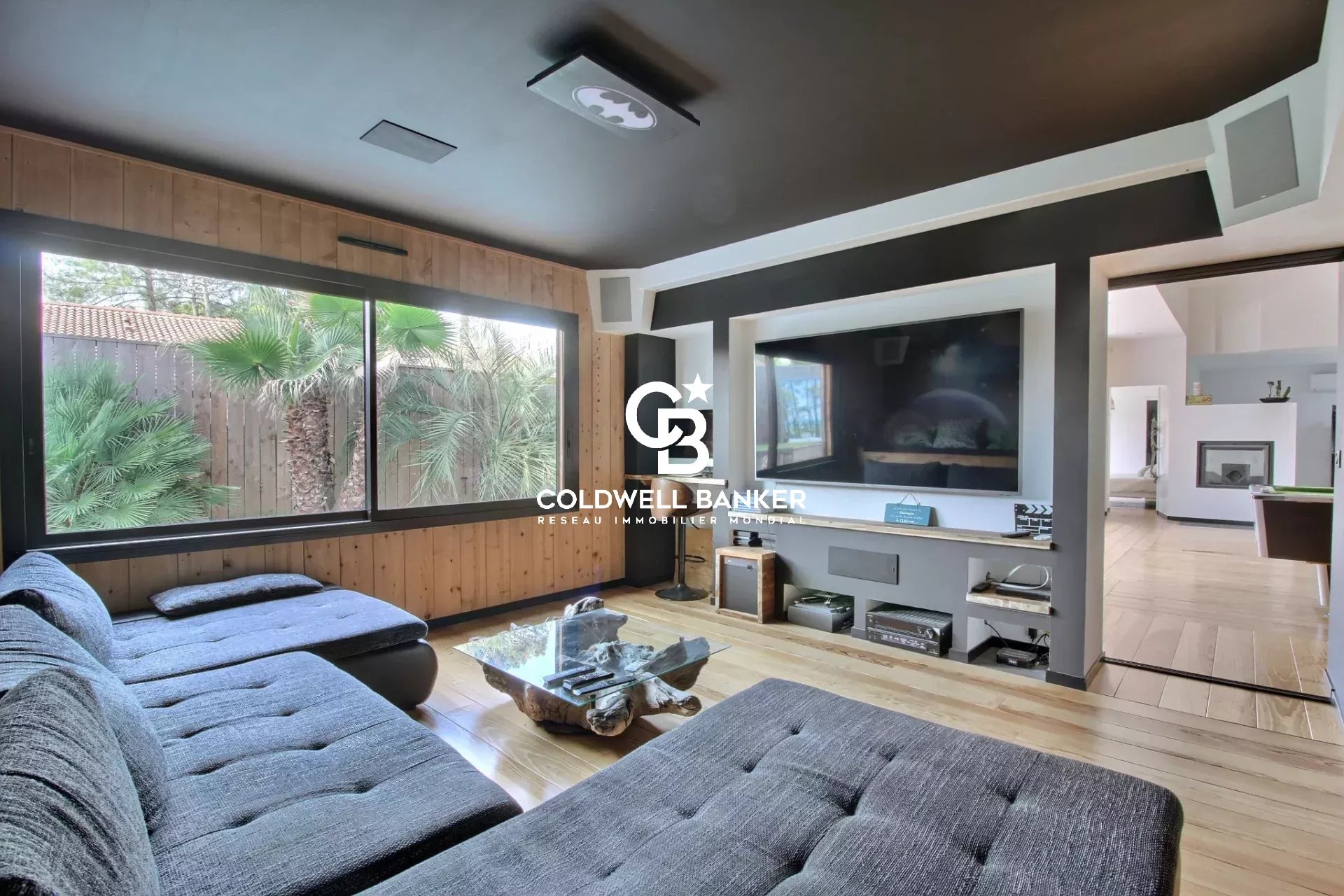 À l'abri des regards dans un quartier pavillonnaire prisé de Gujan-Mestras, cette villa unique en ossature bois déploie 264m² de surface totale de plain-pied. Dans le prolongement d'une grande entrée avec placards, vous découvrirez une vaste pièce de vie jouissant d'une triple exposition avec sa cuisine ouverte haut-de-gamme entièrement aménagée et équipée ainsi qu'un coin détente. Grâce à une baie à galandage de 5m, le salon s'ouvre entièrement sur l'espace piscine exposé plein Sud où s'offrent à vous un couloir de nage exceptionnel de 18m, un solarium, un spa sécurisé ainsi qu'un salon de jardin. Par sa disposition en étoile, accédez depuis la pièce de vie à la suite parentale avec son dressing et salle de bain, à l'opposé vous trouverez une salle de cinéma équipée avec du matériel de qualité. Dans un second espace nuit, quatre chambres, deux salles d'eau et une buanderie complètent les pièces de cette villa d'exception entièrement climatisée. Vous profiterez à l'extérieur d'un superbe jardin paysagé aux multiples essences d'arbres, une immense terrasse en pin où plusieurs coins ont été aménagés pour se relaxer et accueillir vos dîners entre amis ainsi qu'un grand garage de 50m². Cette maison est un véritable havre de paix et de dépaysement! DPE A (58kWh/m²/an) GES A (2kgCO2/m²/an) Estimation des coûts en énergie : 1 070-1 540€/an Prix de vente : 1 475 000€ HAI, les honoraires de 55 000€ sont à la charge de l'acquéreur et représentent 3,87% du prix. Pour obtenir plus de renseignements, contacter Céline HARTENSTEIN Agent Commercial Indépendant N°RSAC 987 559 929 N°RCP 127 100 479 Retrouvez tous nos biens sur IMMOBA Les informations sur les risques auxquels ce bien est exposé sont disponibles sur demande ou sur le site Géorisques : www.georisques.gouv.fr