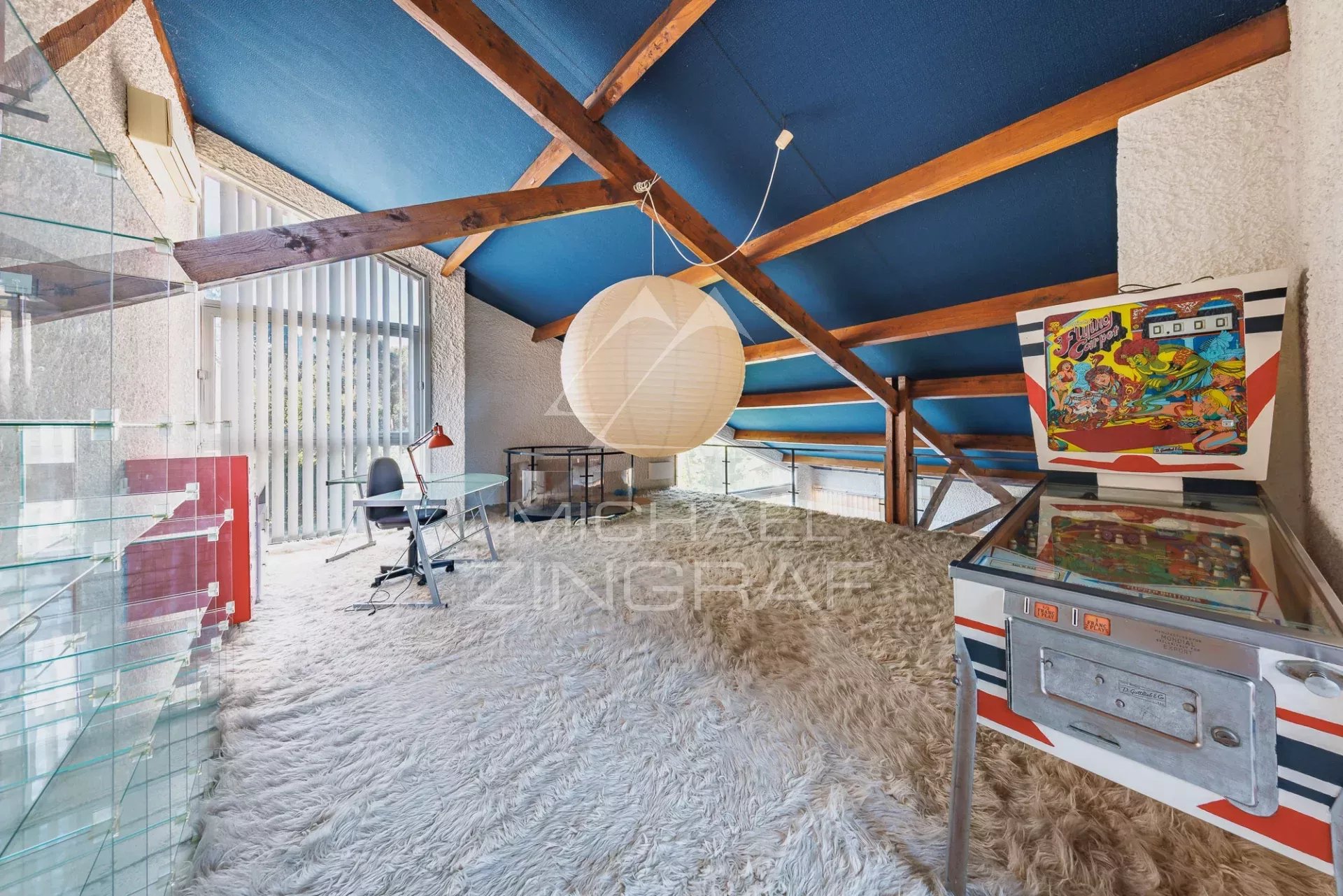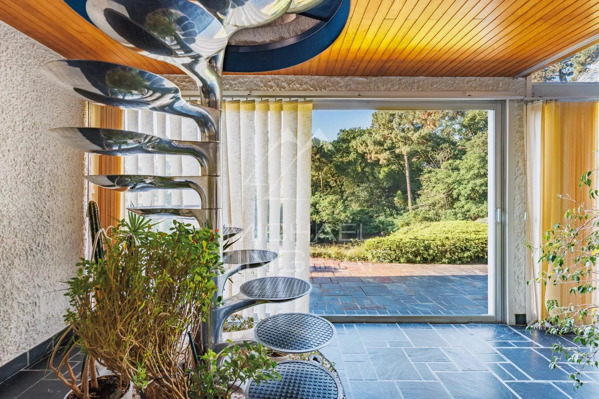 Michael Zingraf Real Estate – Bassin d’Arcachon vous invite à découvrir une villa d’architecte au charme unique, nichée dans un écrin de verdure de 1 432 m², à seulement quelques pas des eaux paisibles du bassin. Édifiée en 1975, cette propriété au caractère affirmé a été pensée pour sublimer la lumière naturelle et favoriser une fluidité de vie rare. Matériaux bruts et volumes ouverts s’y marient avec élégance, créant une atmosphère chaleureuse et résolument contemporaine. Dès l’entrée, le séjour spacieux avec cheminée vous accueille dans un cadre lumineux, sublimé par de larges baies vitrées orientées plein sud, ouvrant sur une généreuse terrasse ensoleillée. Cet espace de vie convivial s’articule autour d’une cuisine entièrement équipée, prolongée par une salle à manger accueillante, idéale pour recevoir en toute simplicité. Le rez-de-chaussée abrite également trois belles chambres, dont une suite parentale avec salle de bain privative. Une seconde salle de bain et un WC indépendant complètent cet étage, offrant une distribution harmonieuse et fonctionnelle. À l’étage, une mezzanine surplombant le séjour offre un véritable espace de liberté : bureau, coin lecture ou chambre d’appoint avec vue sur le jardin arboré, à vous d’imaginer votre cocon. Le sous-sol propose de nombreux atouts pratiques : grand garage, cave, buanderie et espace de rangement. À l’extérieur, une seconde terrasse orientée nord vous permet de profiter des différents moments de la journée, à l’ombre ou au soleil, en toute saison. Dans un environnement calme et privilégié, à proximité immédiate des plages du bassin, cette villa séduira les amateurs de lieux authentiques et inspirants.