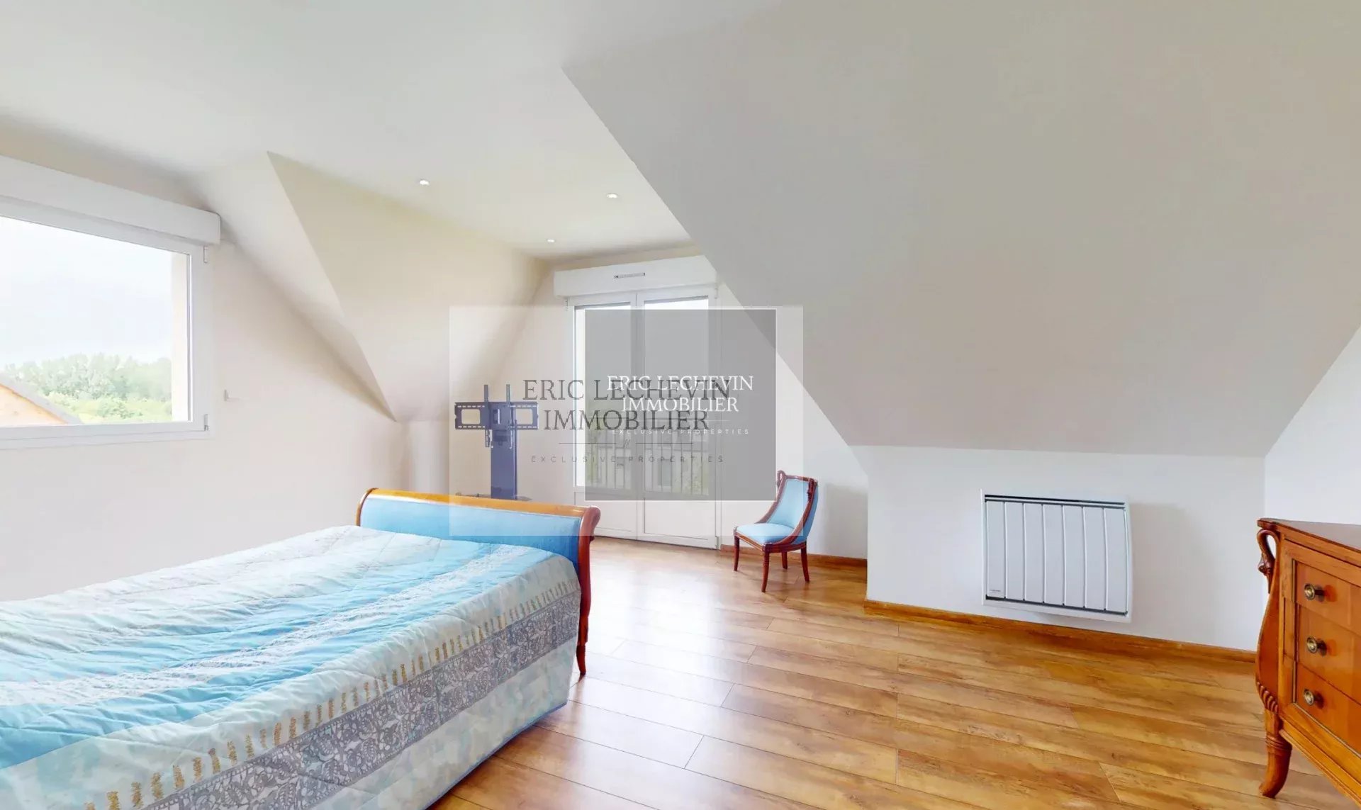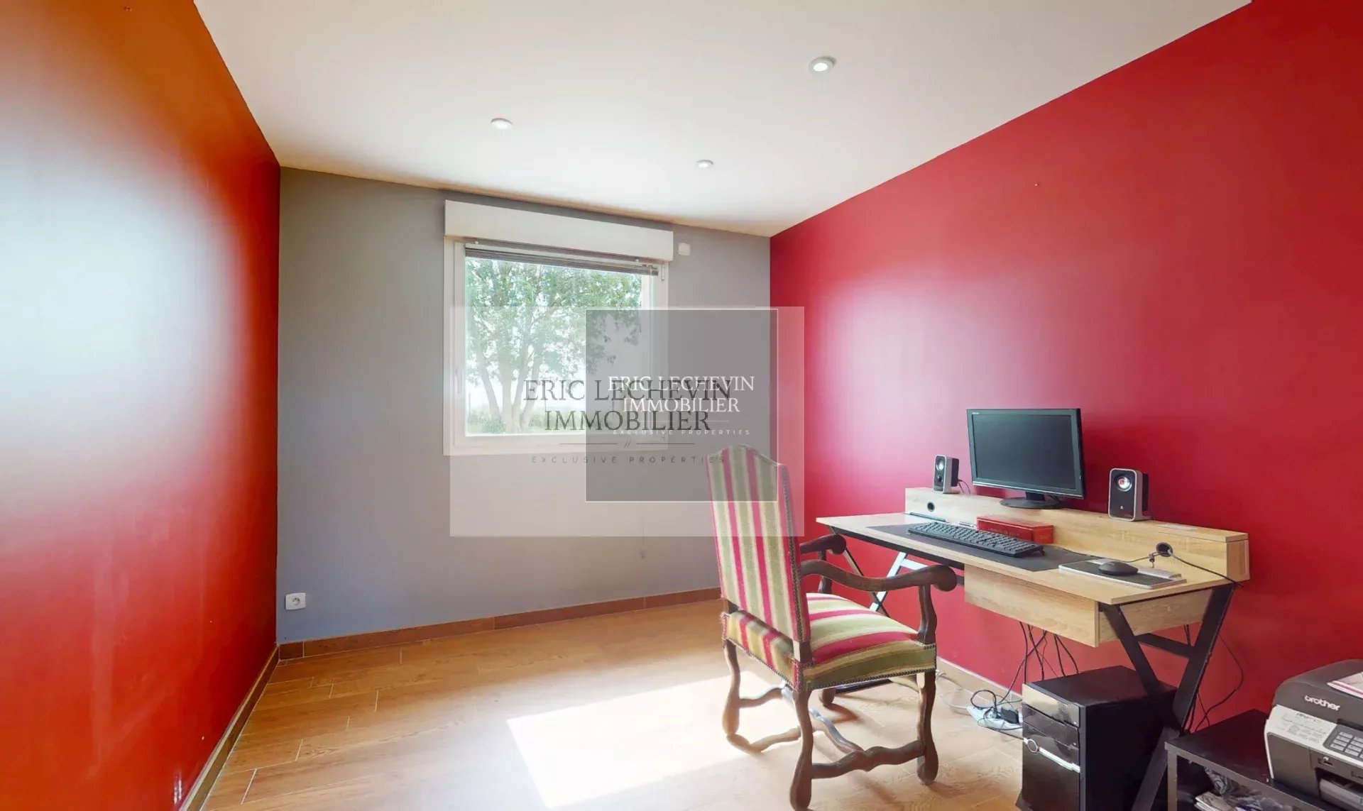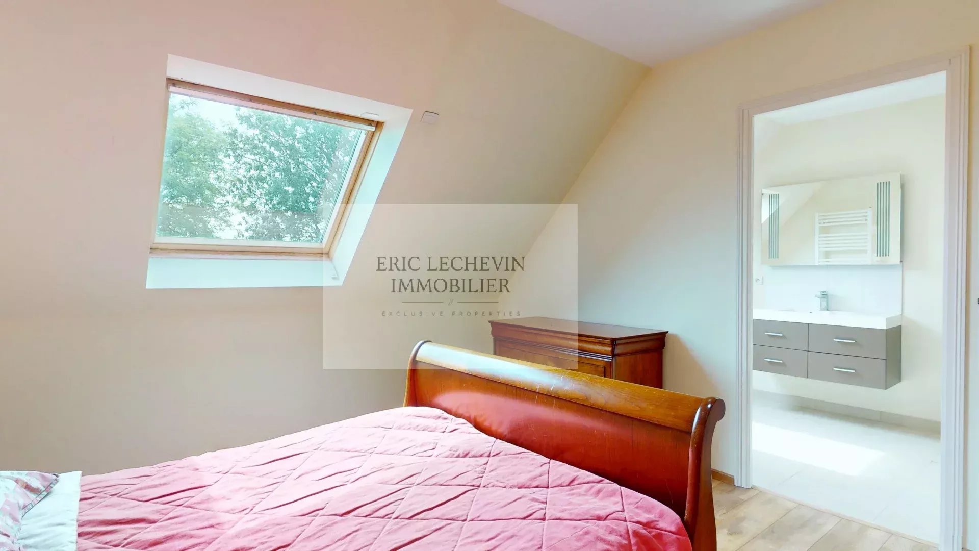 A l'étage, un couloir dessert une chambre avec salle d'eau, une chambre d'enfant ou bureau et une grand chambre parentale avec dressing et salle de bains, wc indépendant.