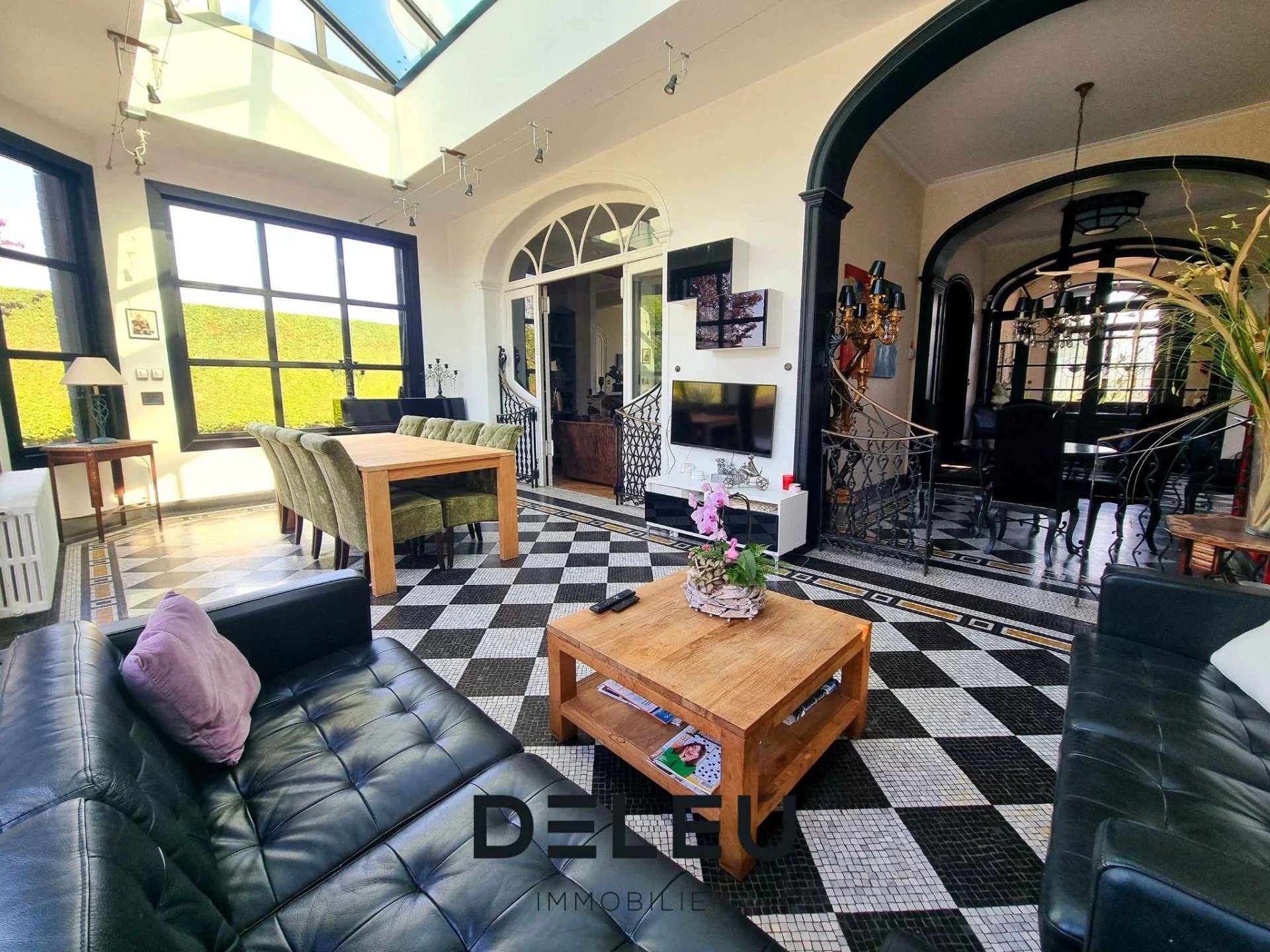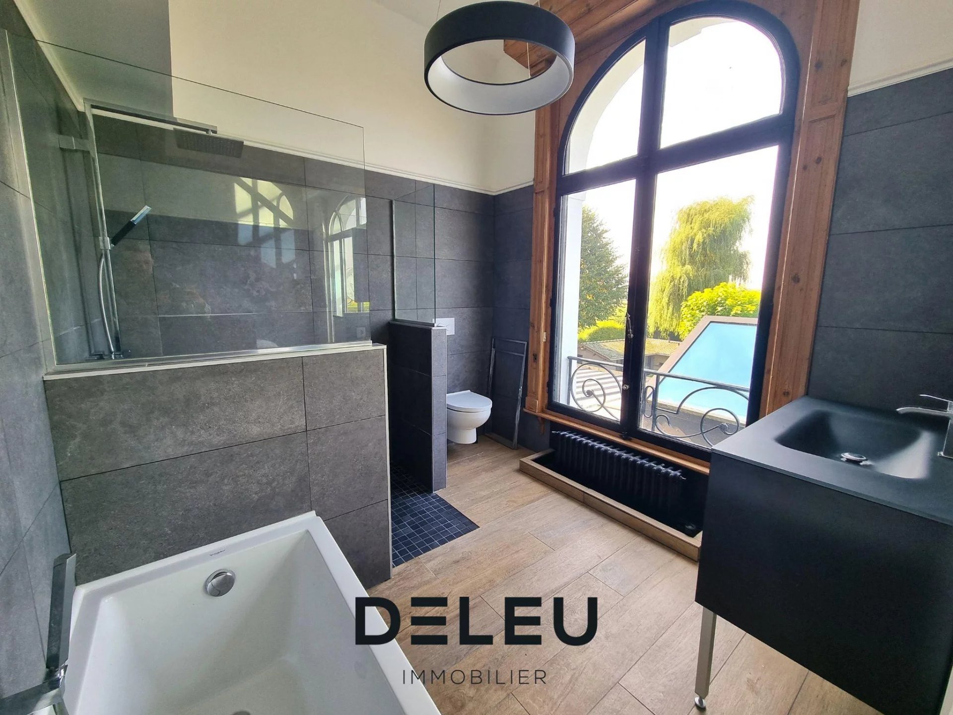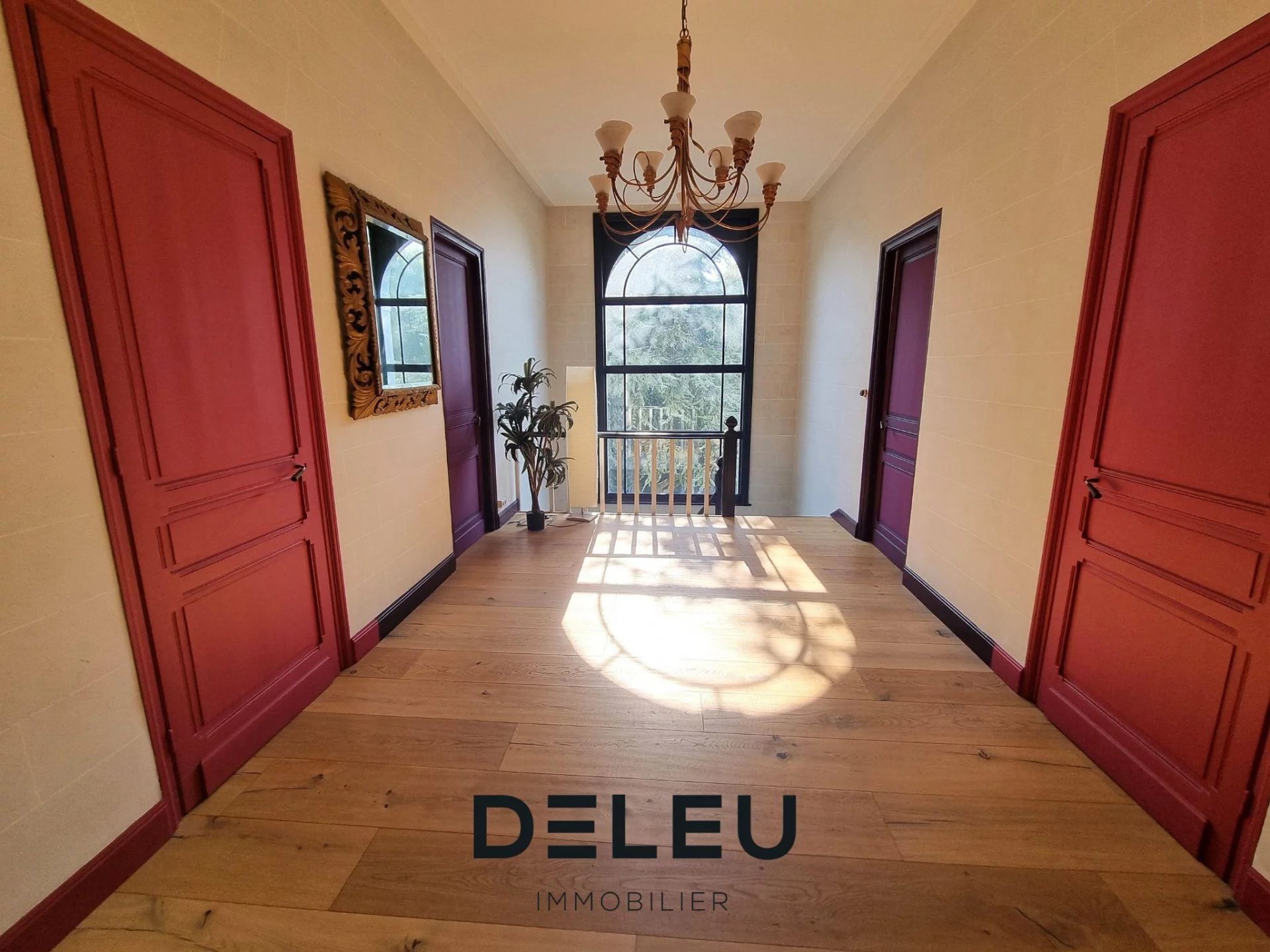 DEMEURE BOURGEOISE D'EXCEPTION 270M² 5 CHAMBRES JARDIN GARAGE 120M², CAVE, PISCINE, DEPENDANCES Située à 20 min au nord de Lille, cette magnifique demeure bourgeoise de 270m² érigée sur une propriété de 5500m² clôturée et sécurisée par un portail se compose : Au rez de chaussée : vaste hall d'entrée en carrelage mosaïque qui dessert un très beau salon, séjour traversant de 91m² avec parquet chevron et agrémenté d'une cheminée feu de bois. Dans la continuité, une salle à manger sous une magnifique verrière offrant une jolie vue sur le jardin. Une cuisine équipée indépendante de 20m². Côté nuit à l'étage : nous retrouvons un grand palier de 20m² desservant 5 chambres de beaux volumes dont 4 avec salle de douche et wc et une très belle suite parentale de 30m² avec dressing, salle de bain complète avec wc et une vue imprenable sur le jardin et ses environs. Une belle propriété clôturée et arborée sur 5500m² avec son exposition sud-ouest, belle terrasse en bois de 50m² avec une piscine et dépendances où s'y trouve un spa avec sauna et jacuzzi. Un grand garage sécurisé de 120m² pouvant accueillir de nombreux véhicules vient compléter ce bien.