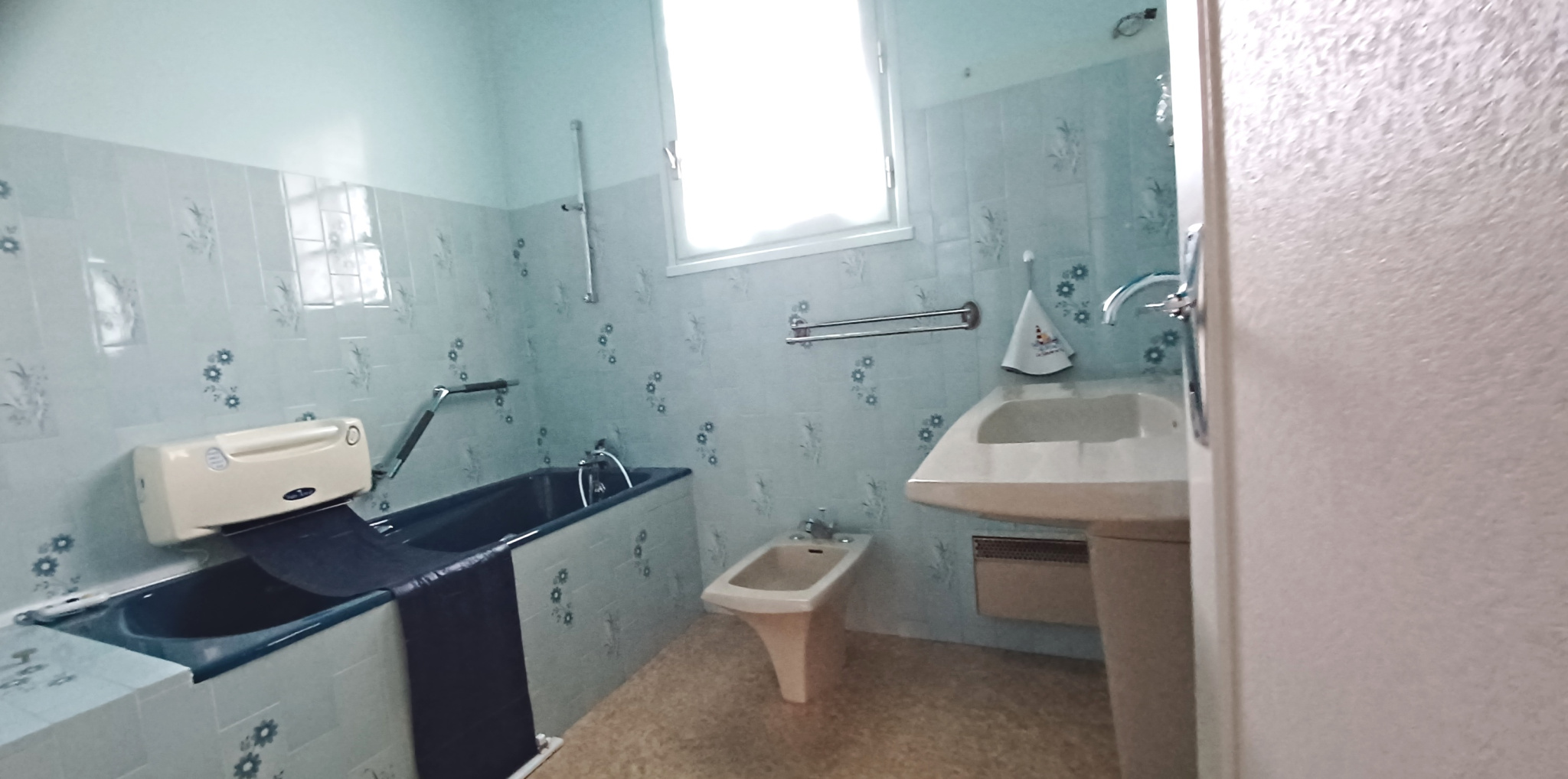 Maison élevée sur Rez de jardin aménageable en appartement : pièce d'entrée accédant à l'étage, garage double, 2 grandes pièces avec fenêtres, buanderie avec point d'eau, placards muraux et toilettes. Escalier béton (monte-escalier électrique neuf). Au-dessus, cuisine aménagée-équipée, salon-séjour double 42 m2 ouvrant sur balcon-terrasse, 3 chambres, salle de bains, toilettes. Chauffage puits canadien et électrique - triple vitrage - Volets roulants solaires. Dbles cloisons briques et isolation, prestations grande qualité, parfait entretien. Tout à l'égout.