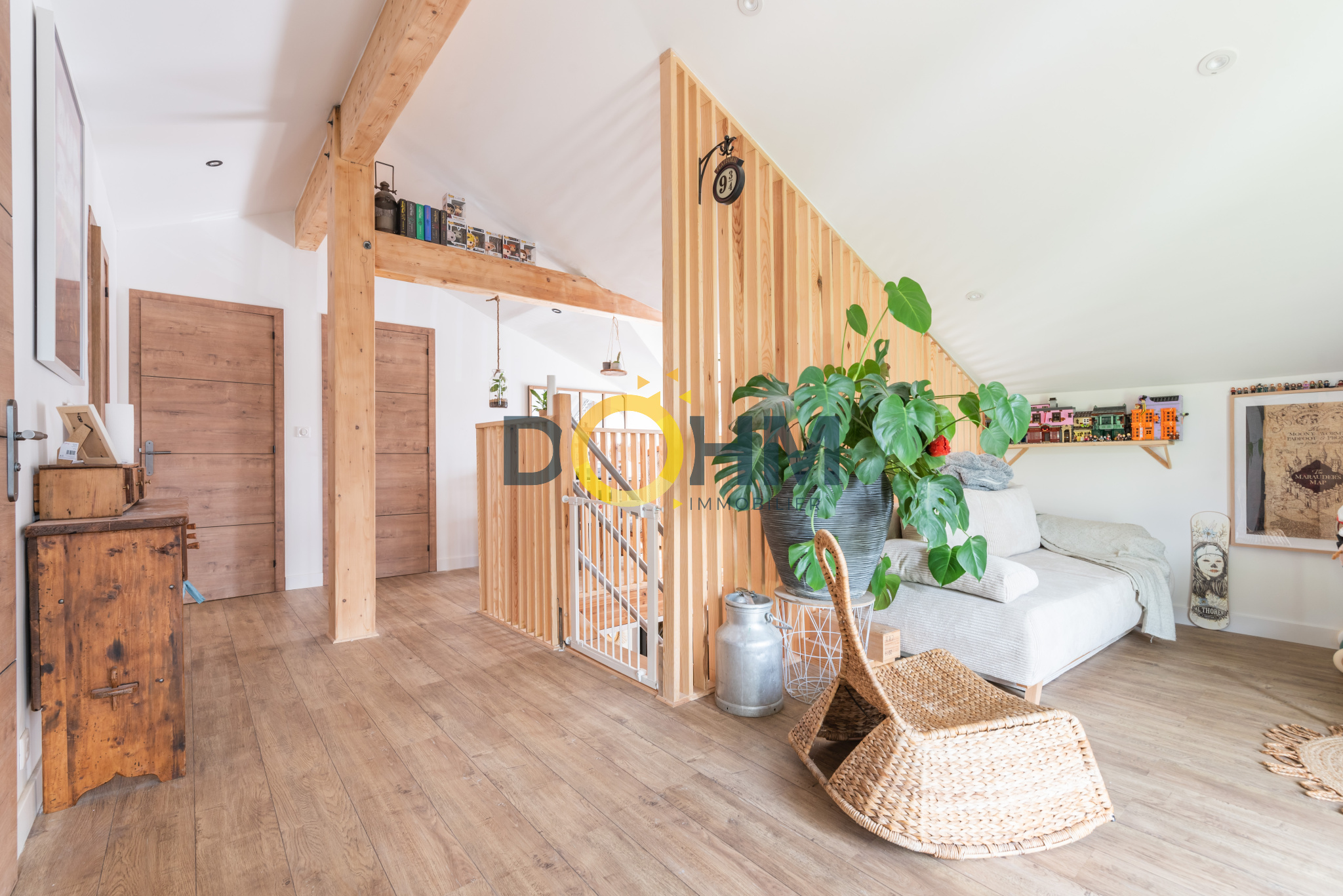 À l'étage, un bel escalier mène à un espace ouvert comprenant un bureau, suivi de deux grandes chambres (11 m2 et 10 m2), idéales pour les enfants, ainsi qu'une salle de bain avec baignoire et WC indépendant et un espace buanderie. Le chauffage est assuré par un poêle à granulés à faible consommation. La taxe foncière s'élève à 739 euros. Deux places de stationnement et un cabanon de 19 m2 complètent ce bien.