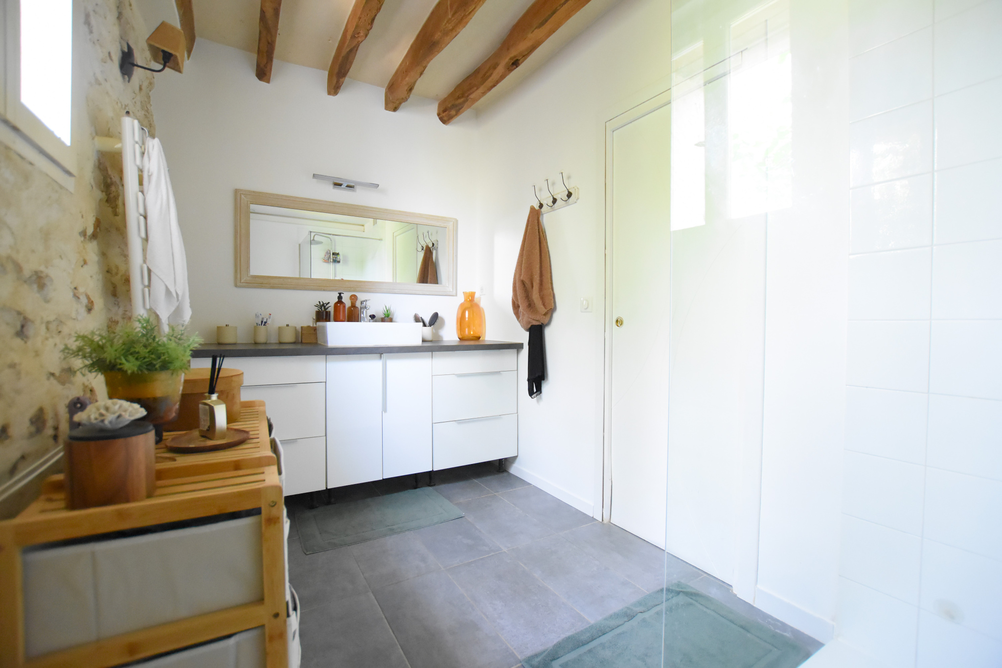 Au rez-de-chaussée, une entrée accueillante avec rangements, un coin buanderie/chaufferie pratique et discret, une salle d'eau avec douche à l'Italienne, un séjour de 31,5 m2 avec cuisine ouverte, parfait pour partager des moments conviviaux ! Un second séjour cathédral de 31 m2, lumineux et majestueux, idéal pour recevoir.