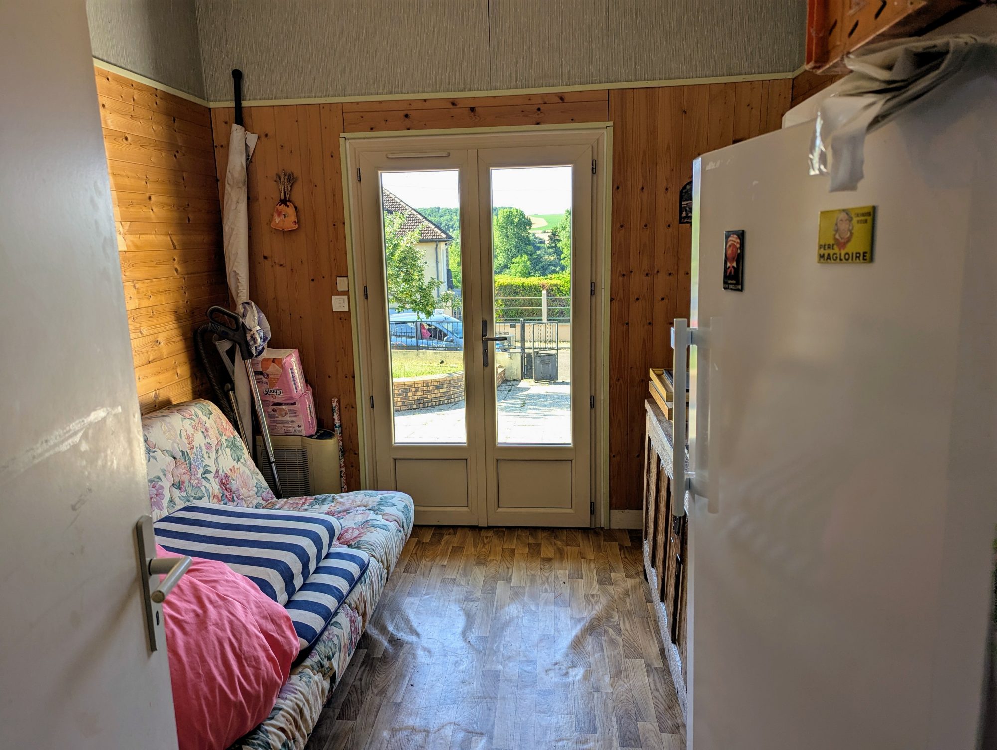 Cuisine aménagée suivie d'un cellier et d'une pièce/chambre avec un accès direct à l'extérieur.