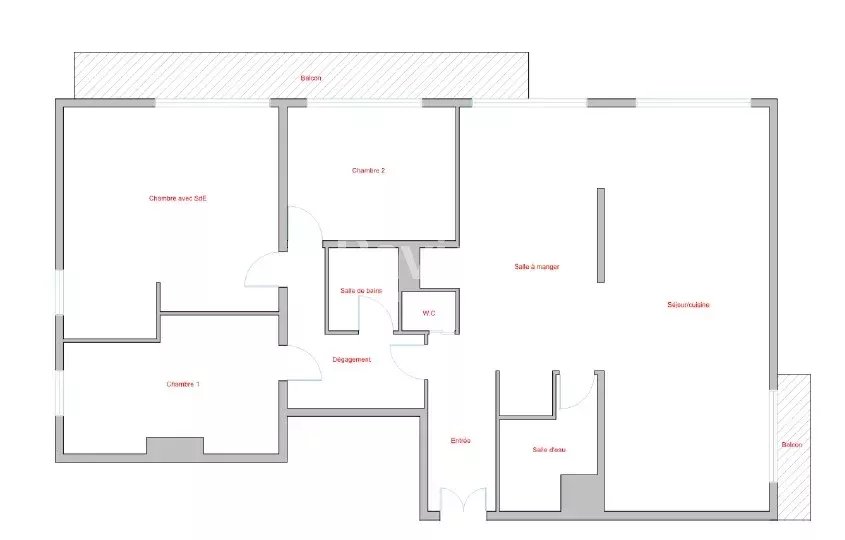 Deux chambres (13m² et 11.5m²) sont prolongées par le même balcon que les pièces de vie.