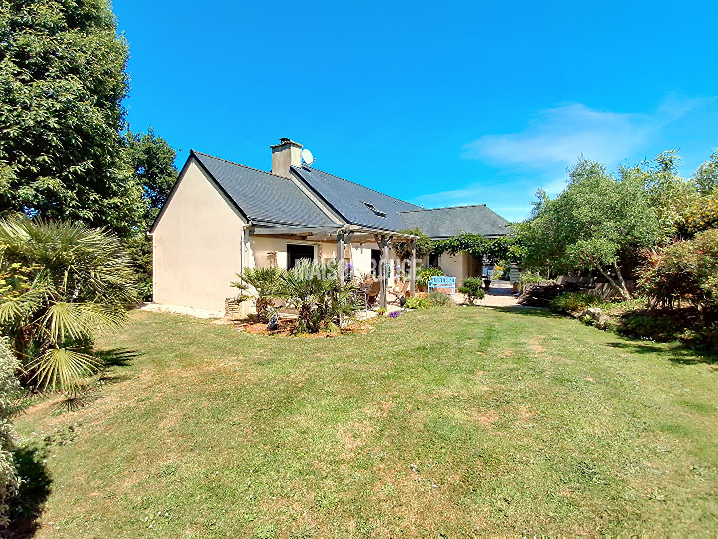 Située au coeur de la nature, à Plourivo, et à seulement quelques minutes de Paimpol et ses plages environnantes, cette belle maison contemporaine de 2005 allie confort moderne, volumes généreux et matériaux de qualité. Idéale pour une vie de famille, elle offre également un fort potentiel locatif grâce à son étage indépendant. Au rez-de-chaussée, vous trouverez : - une belle entrée accueillante ; - une cuisine ouverte entièrement aménagée et équipée, donnant sur une grande pièce de vie lumineuse avec poêle à bois. L'accès à une vaste terrasse exposée plein sud est direct, idéale pour profiter des beaux jours ; - une buanderie ; - trois grandes chambres ; - un dressing ; - une spacieuse salle de bain avec baignoire et douche ; - WC séparé. L'étage est indépendant et accessible par l'extérieur. Il se compose : - d'une mezzanine pouvant faire office de bureau, - d'une cuisine équipée ouverte sur une agréable pièce de vie, - d'une chambre spacieuse, - d'un dressing, - d'une salle d'eau, - d'un WC séparé, - d'une belle terrasse suspendue. Cet espace peut être exploité pour de la location à l'année, en chambre d'hôtes ou pour accueillir famille et amis en toute autonomie. Le terrain est arboré et d'une superficie d'environ 4391 m², l'environnement est discret, parfait pour les amoureux de nature. Le garage est double avec portes motorisées et grenier aménageable, les allées sont goudronnées. Ce bien rare à la vente offre de nombreuses possibilités dans un environnement calme et verdoyant, tout en restant proche de la mer, des commerces et des commodités. A découvrir sans tarder avec votre agence Maison Rouge. Prix FAI : 613 600 euros dont 4.00 % honoraires TTC à la charge de l'acquéreur. Christelle HERVÉ (EI) Agent Commercial - Numéro RSAC : 951 066 836 - SAINT BRIEUC.