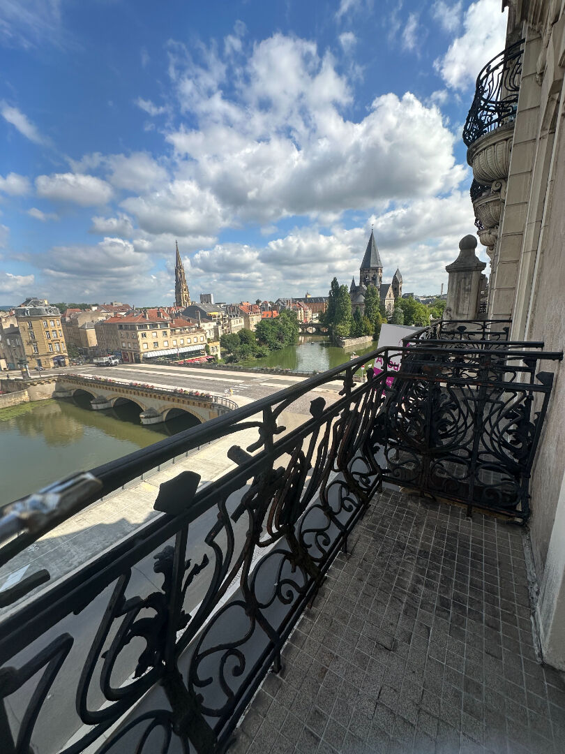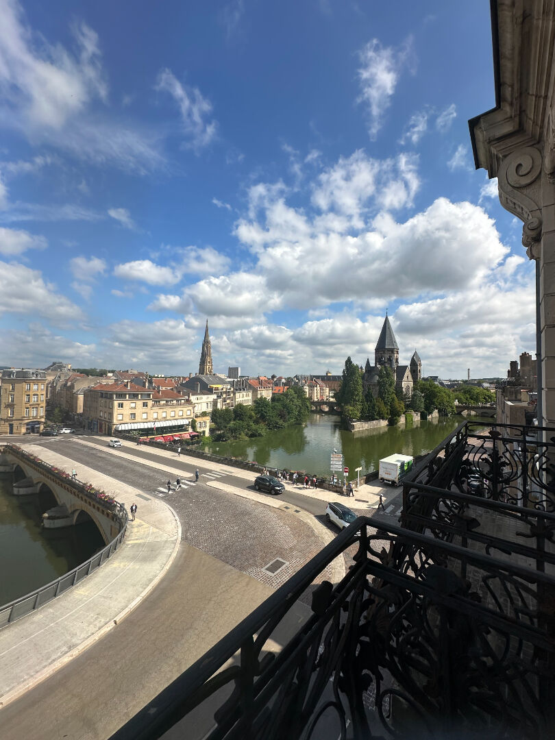 Superbe appartement de sept pièces logé au troisième étage d'un immeuble de caractère offrant une vue à 180 degrés, du Temple Neuf au plan d'eau de Metz, depuis ses deux balconnets. Avec ses volumes, doté du charme de l'ancien grâce à ses moulures et son véritable parquet, vous serez accueilli dans une entrée lumineuse qui dessert un spacieux salon/séjour, cinq chambres, une cuisine équipée (plaques, hotte, four), deux salles de douche avec WC, trois WC, une cave de 60m² et un accès à un grenier. Possibilité de louer un garage 3 véhicules (+250 euros/mois) dpe : D