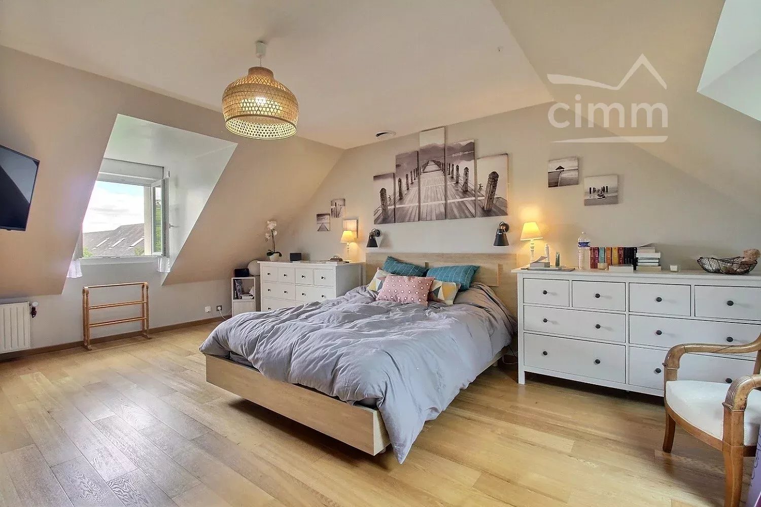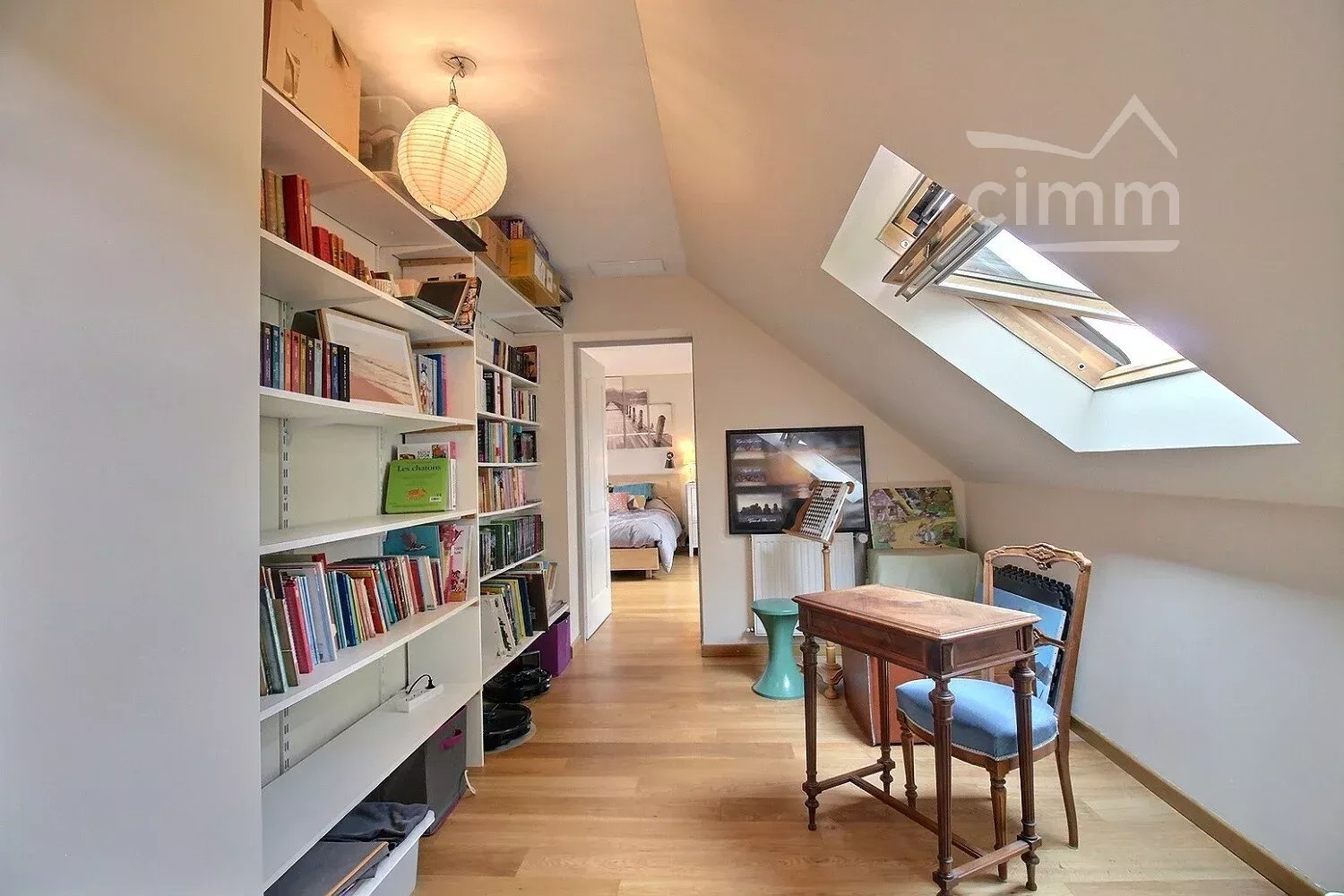 Le 1er étage est climatisé, un palier dessert 4 chambres mansardées, une bibliothèque, une salle de bains avec baignoire et douche et un WC indépendant.